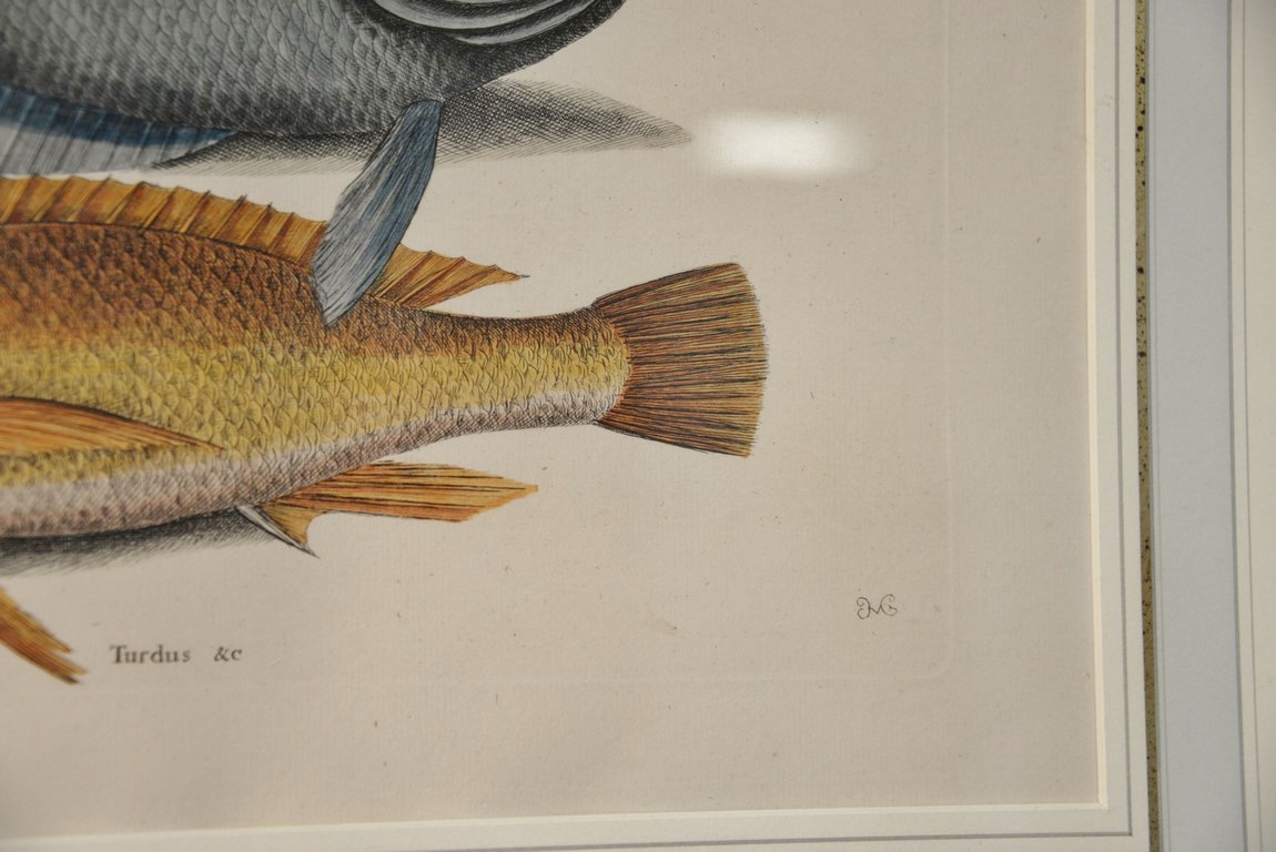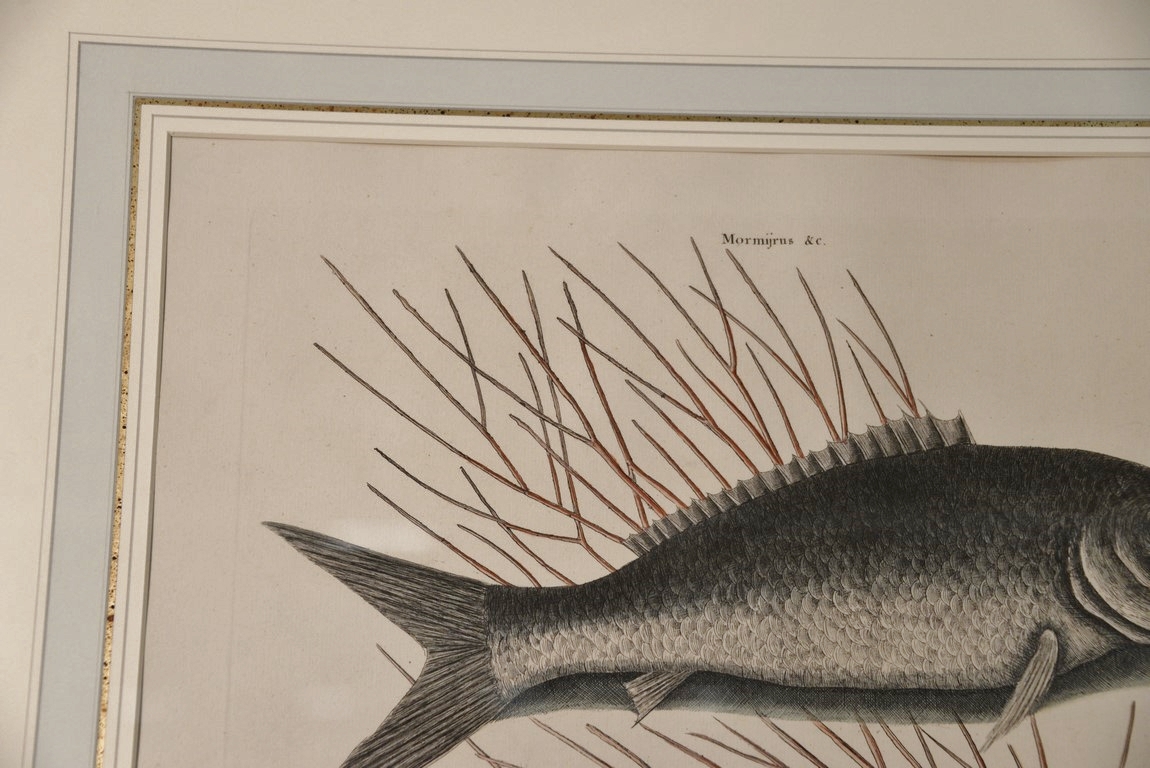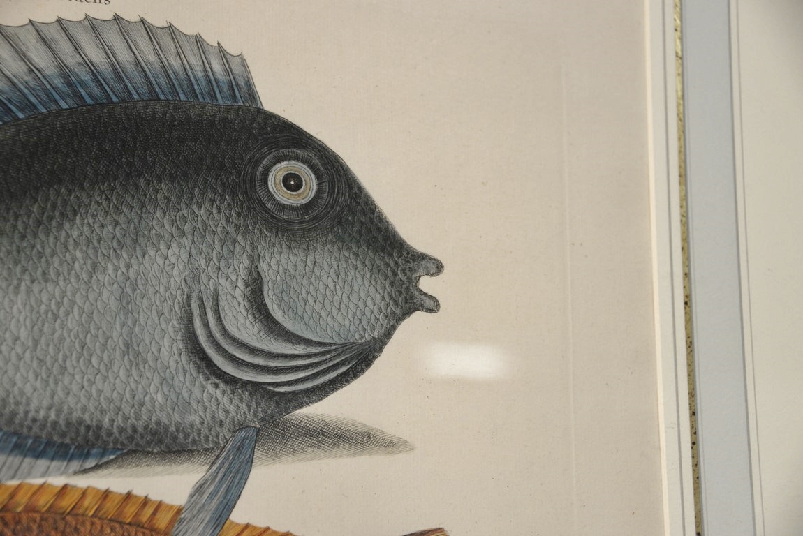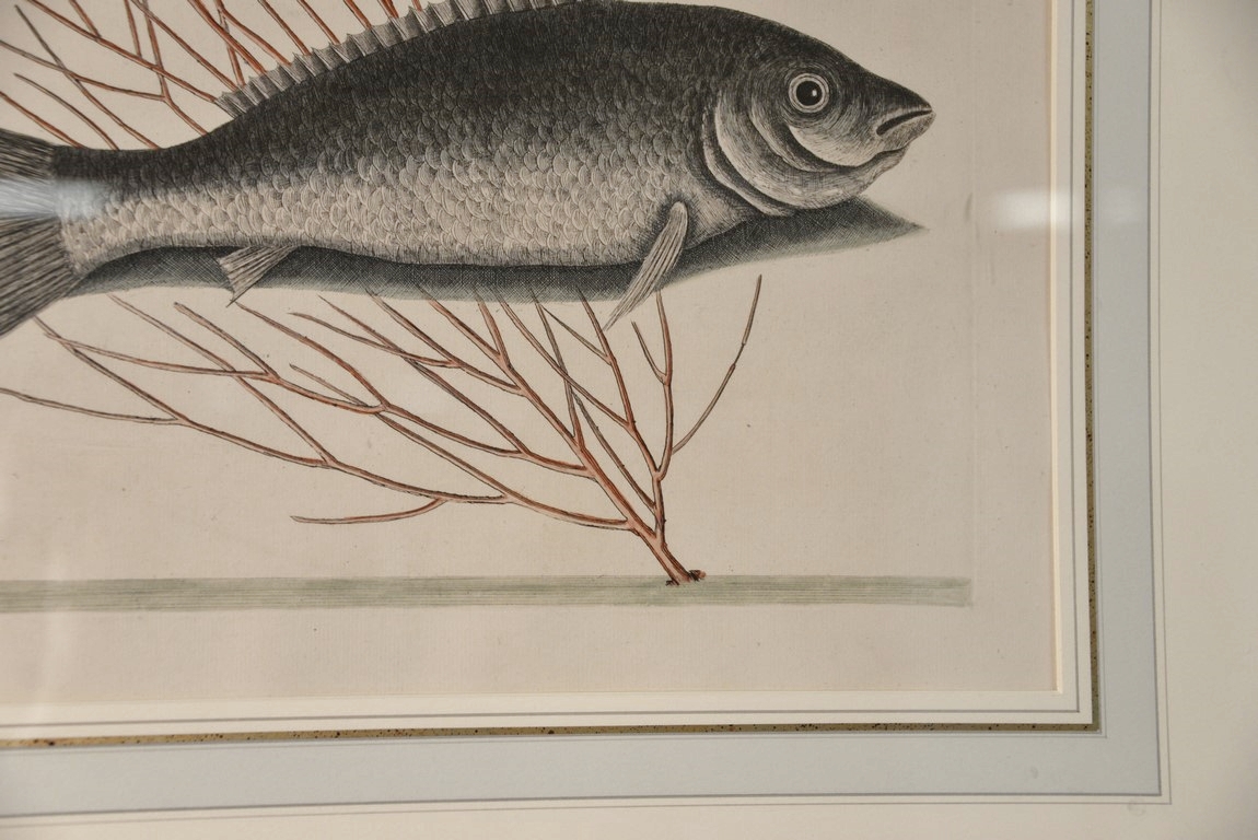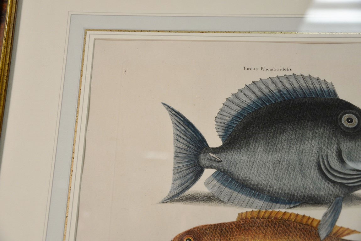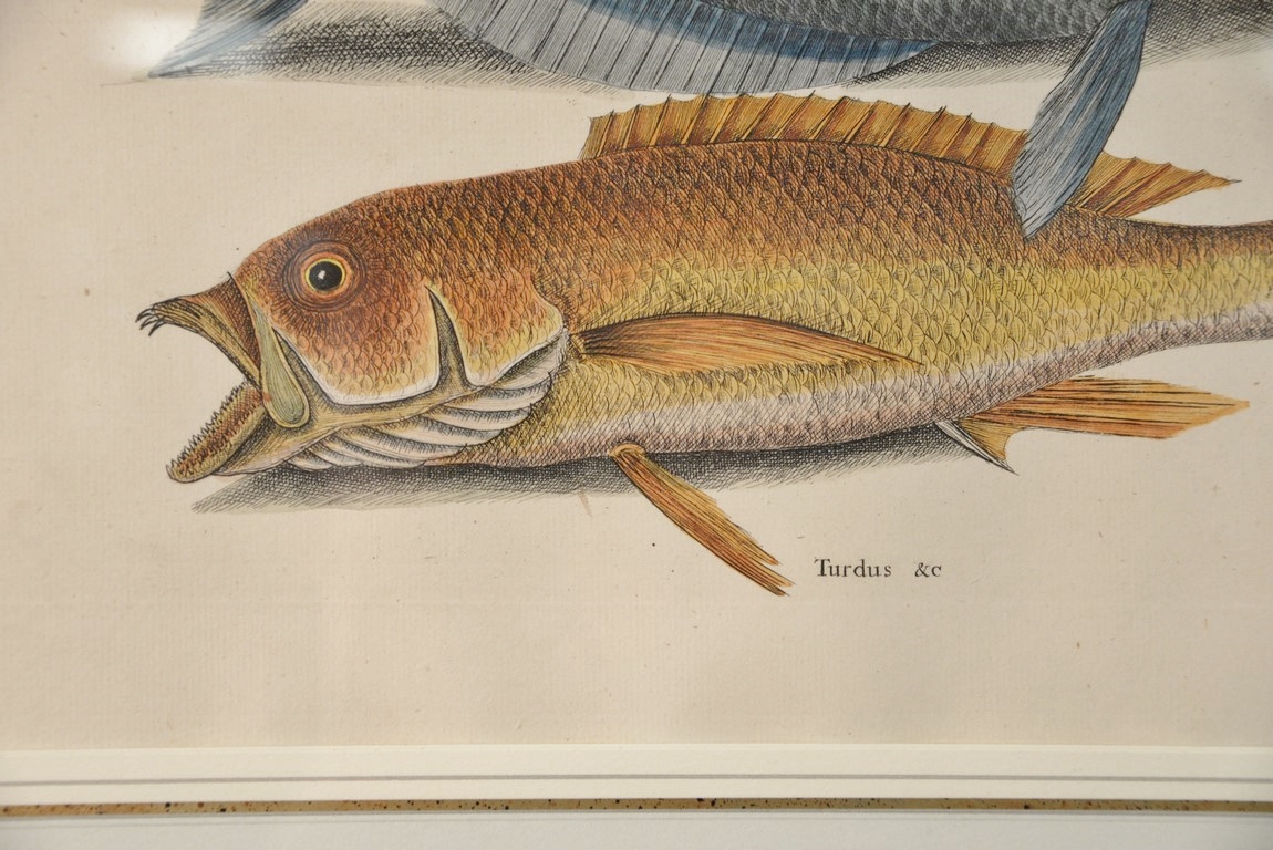 Lot 311: Mark Catesby 1679-1749 pair of hand colored copper plate engravings Turdus, Tang & Yellow Fish Plate #10 and Mormijru…