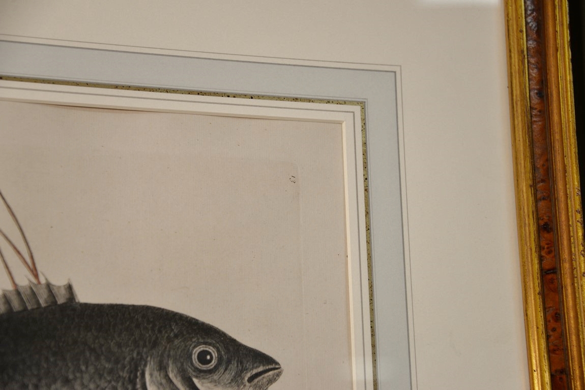 Mark Catesby 1679-1749 pair of hand colored copper plate engravings Turdus, Tang & Yellow Fish Plate #10 and Mormijrus, Bone Fish Plate #13 From The Natural History of Carolina, Florida and the Bahama Islands in burl and gilt frame sight size: 12 1/2 x 16 1/4 Provenance: Property from Credit Suisse’s Americana Collection