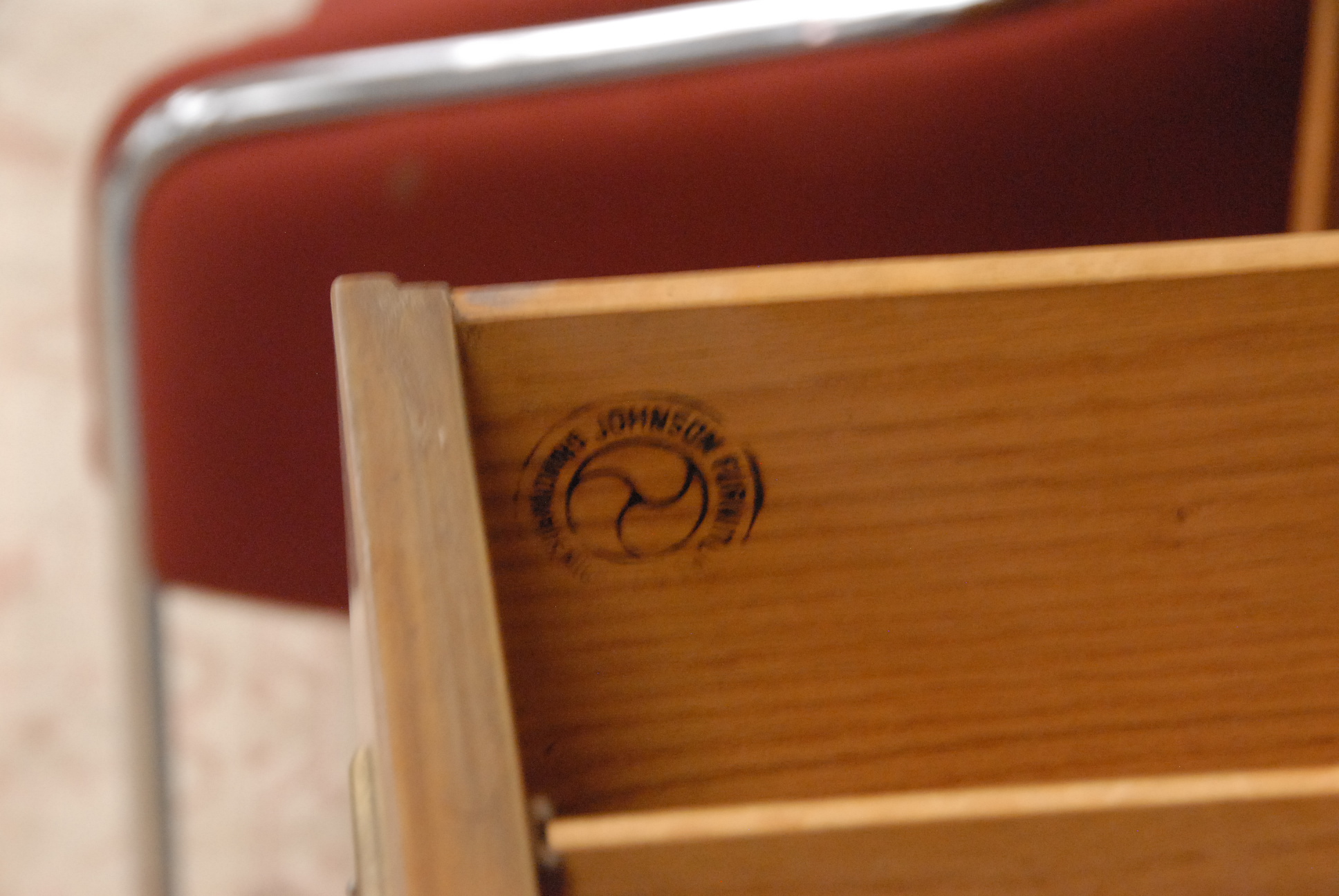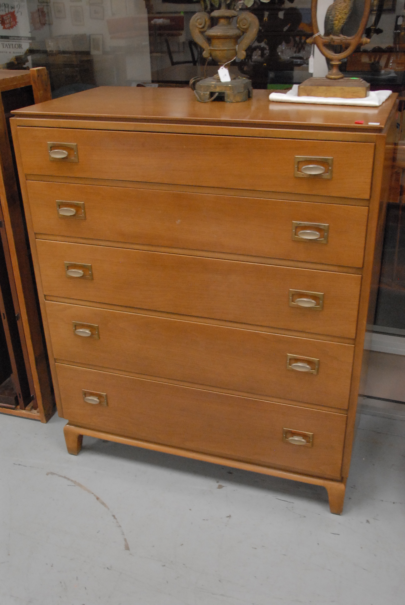 Lot 311: Mid-Century Modern five drawer tall chest made by Johnson Furniture Company of Grand Rapids, ht. 46 wd. 38.