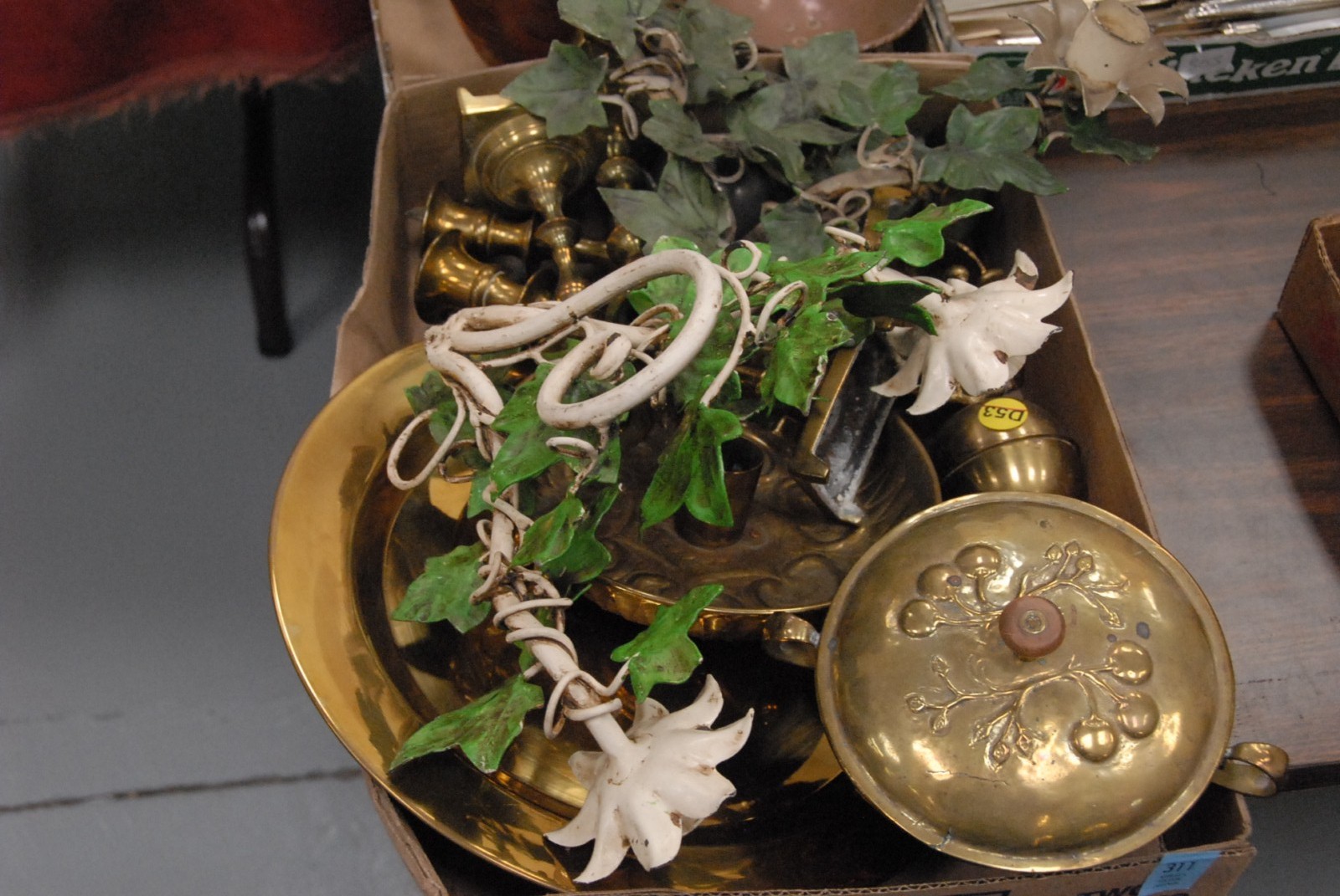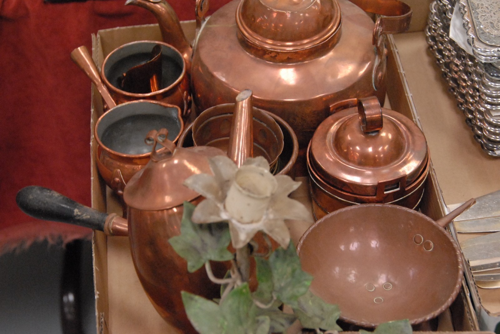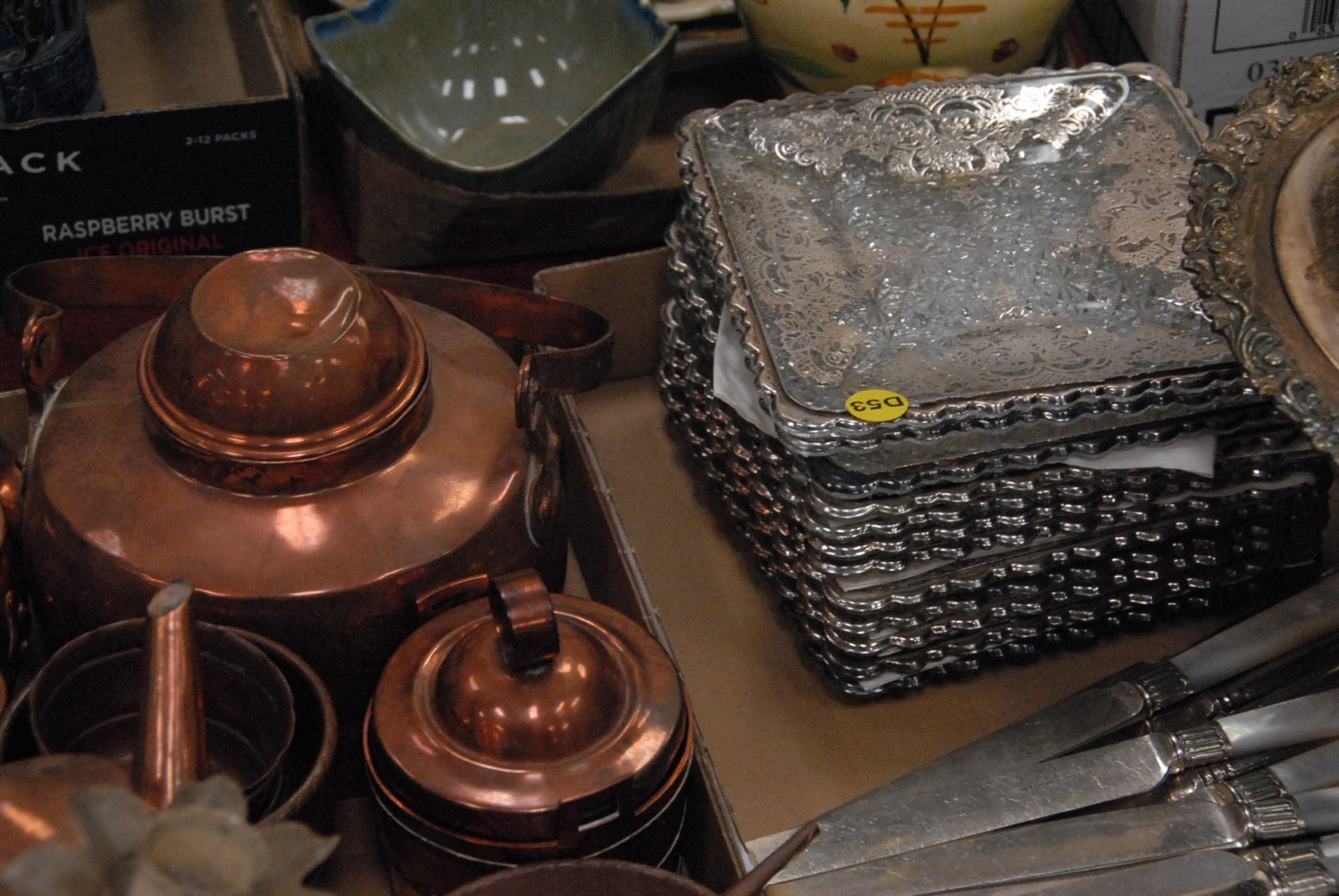 Three box lots of copper, brass, knives, and silver overlay dishes