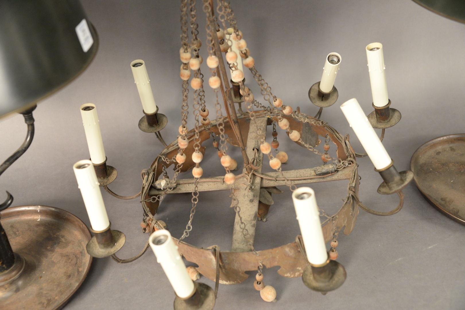 Three Piece Italian Tole Lot to include, pair of large Italian table Lamps, both having painted green tole shades and three lights along with an Italian tole chandelier having nine lights overall 26 inches, width 17 1/2 inches.