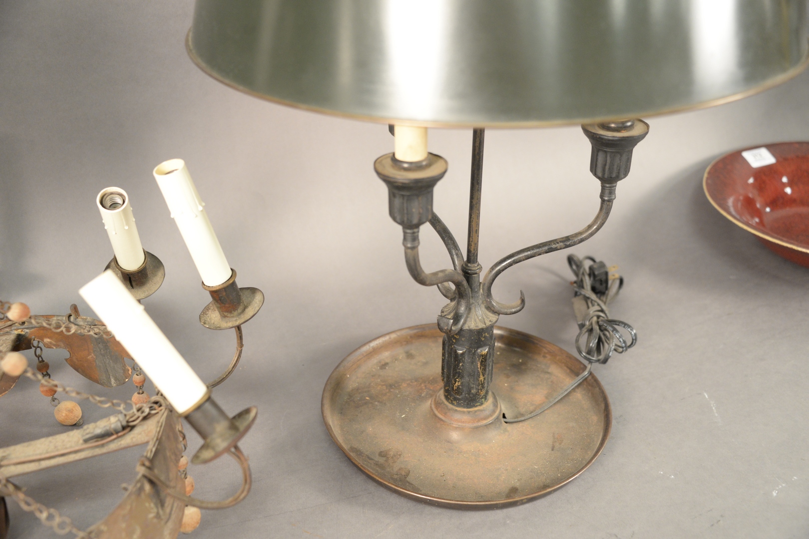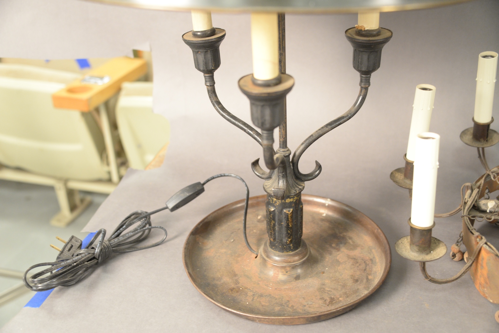 Lot 311: Three Piece Italian Tole Lot to include, pair of large Italian table Lamps, both having painted green tole shades and three lights along with an Italian tole chandelier having nine lights overall 26 inches, width 17 1/2 inches.