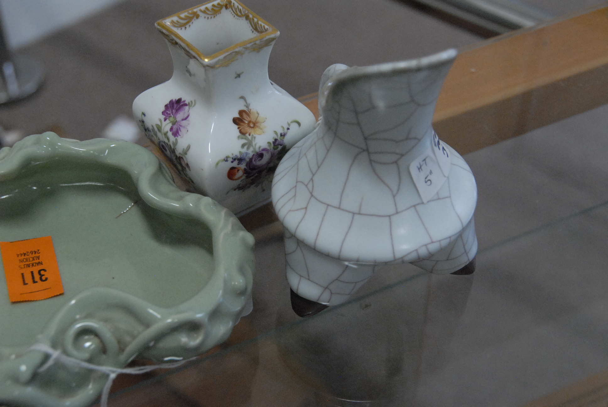 Three piece lot including a Chinese brush pot and two small pieces of porcelain.