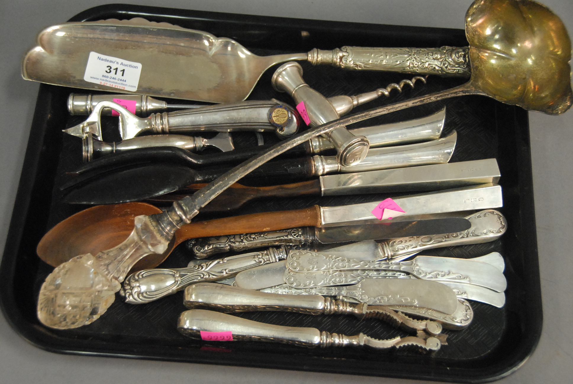 Lot 311: Tray lot of sterling to include weighted handled salad fork and spoons, can and bottle openers, butter knives, serving pieces, etc. …