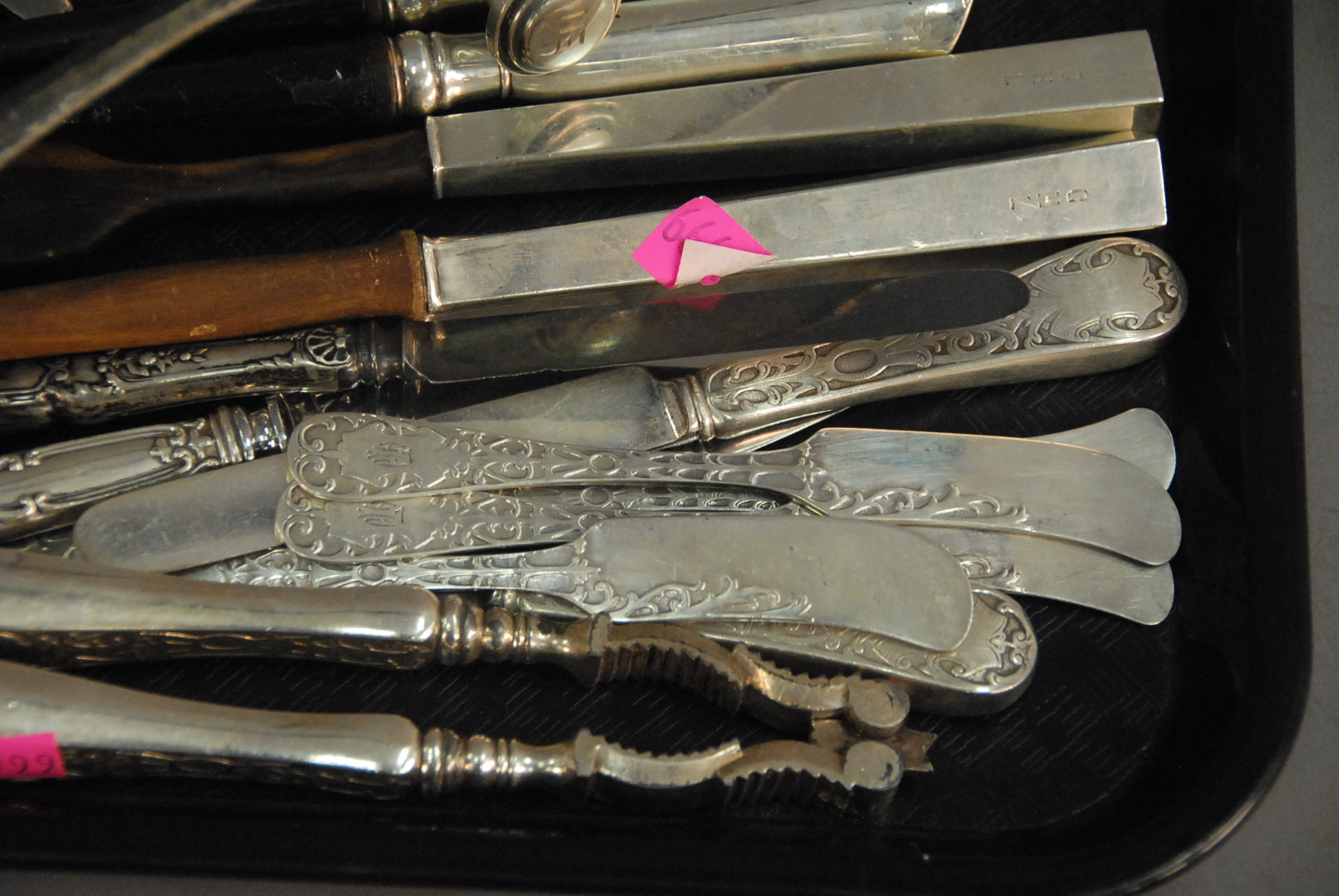 Tray lot of sterling to include weighted handled salad fork and spoons, can and bottle openers, butter knives, serving pieces, etc. 4.1 t oz. weighable silver.