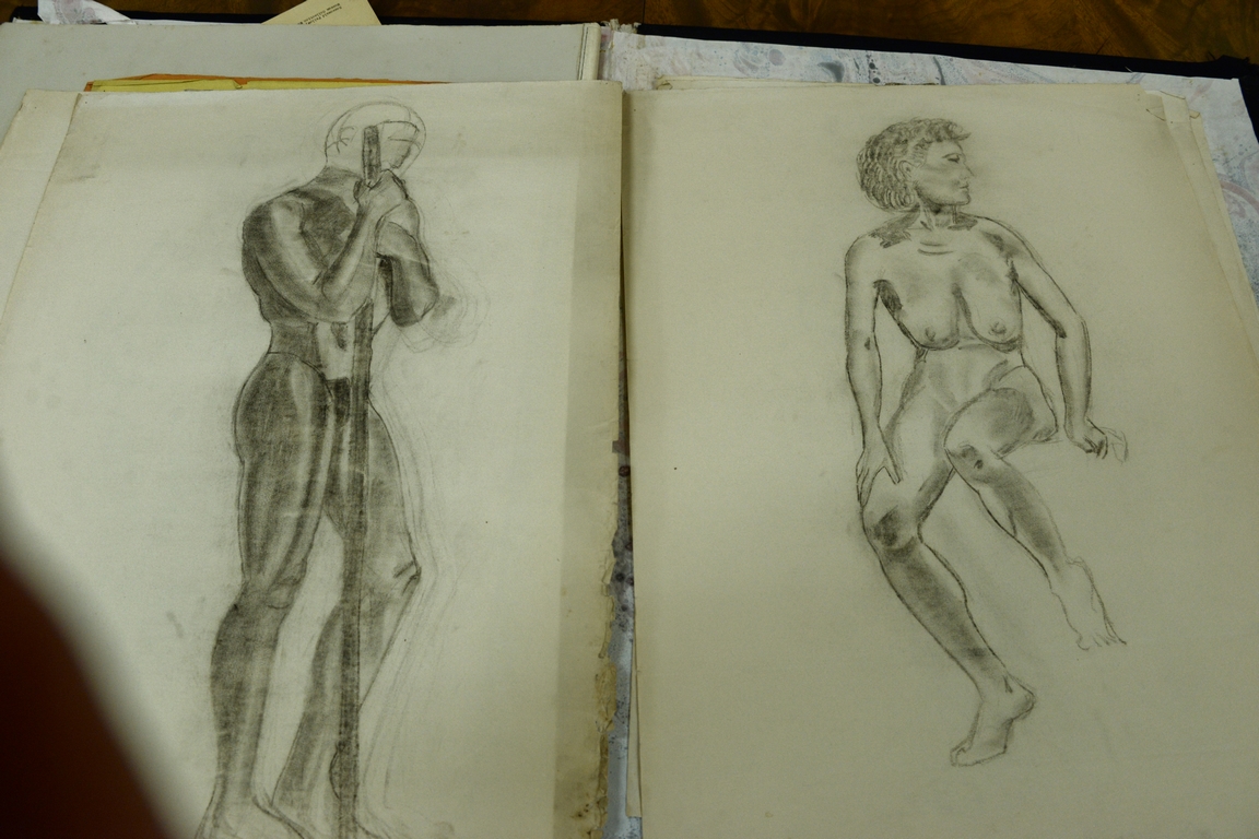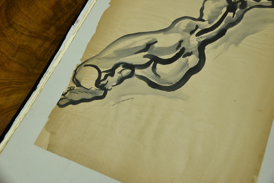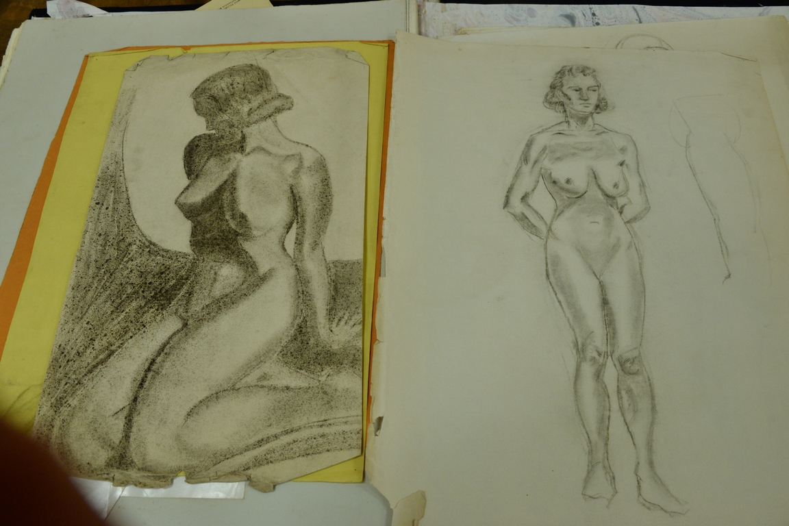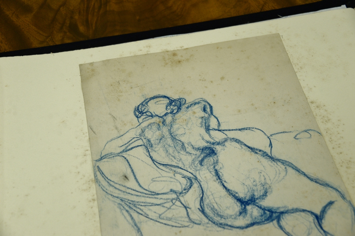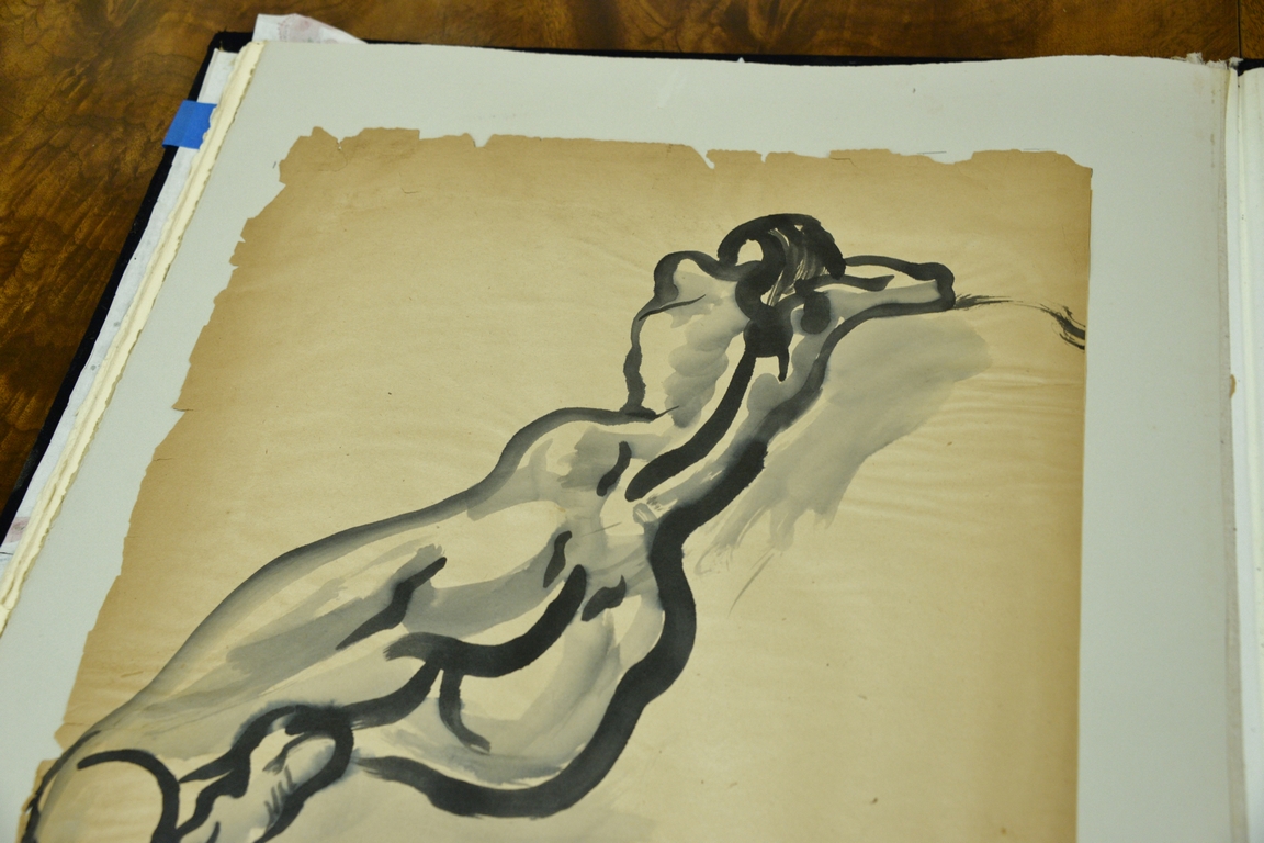 Joseph Samuel Delaney 1904-1991 scrap artist book consisting of gallery letters, five inkwash studies, five ink on paper studies, one pencil on paper study, two crayon paper studies all signed along with eight unsigned nude drawers. total size of book 32 x 23 Provenance: Collection of Anne Jones Willis and the late John Ralph Willis, New Jersey