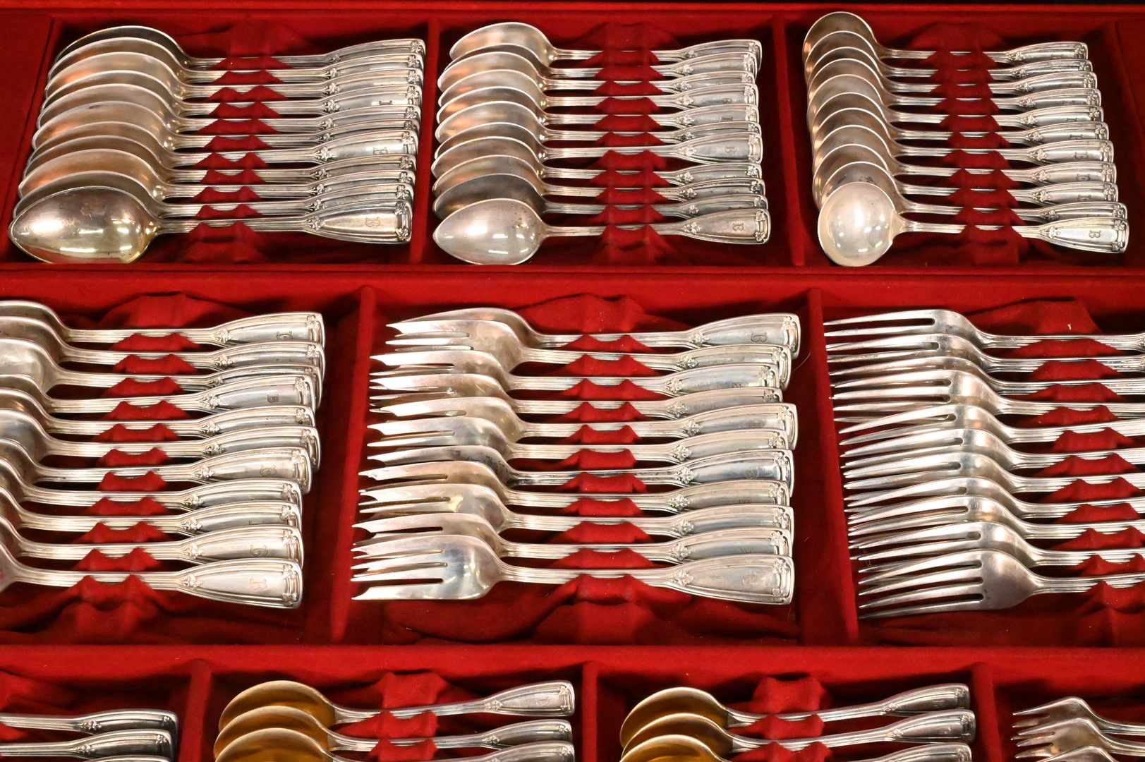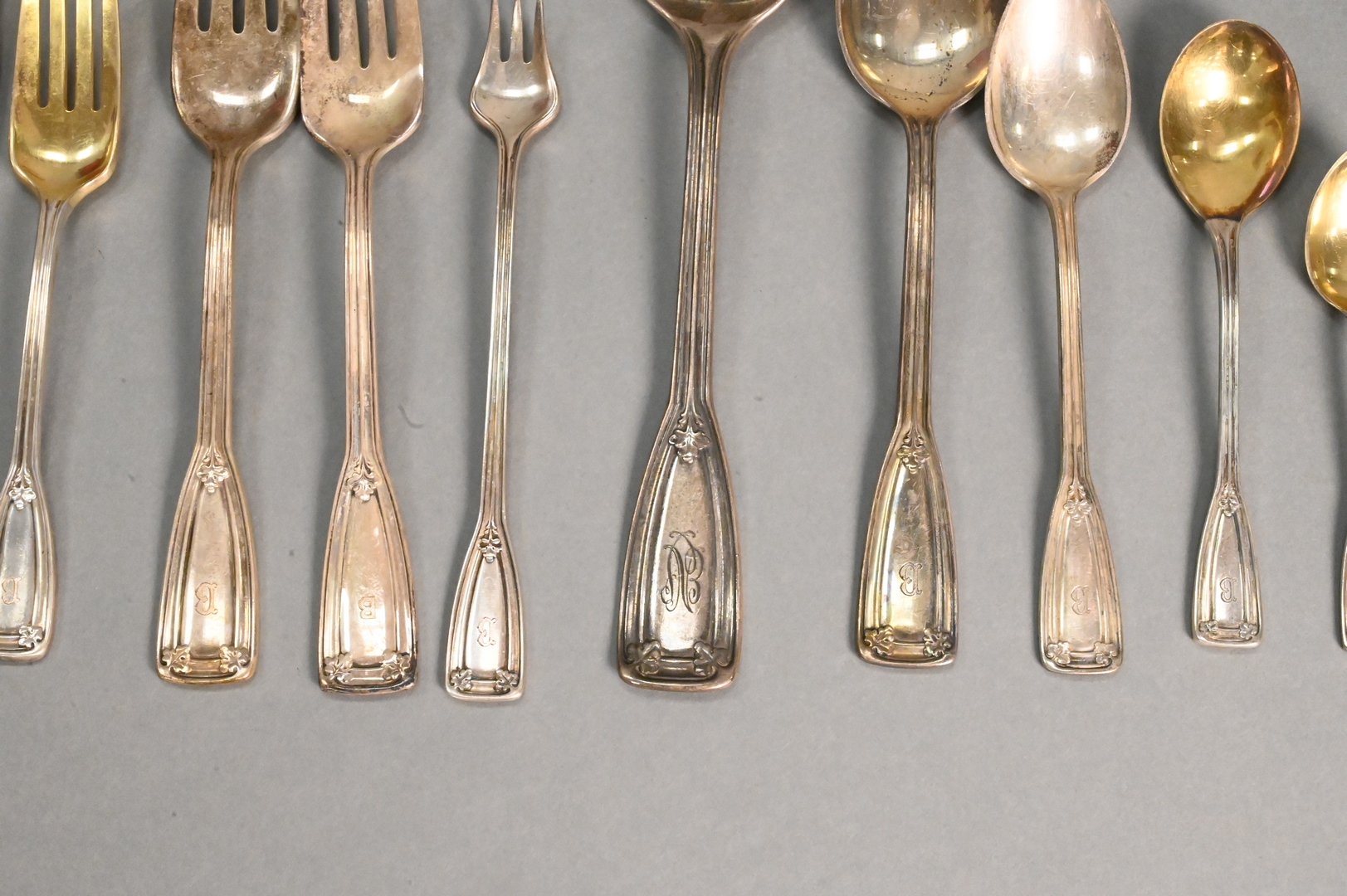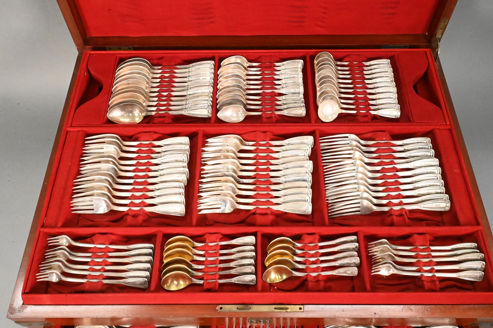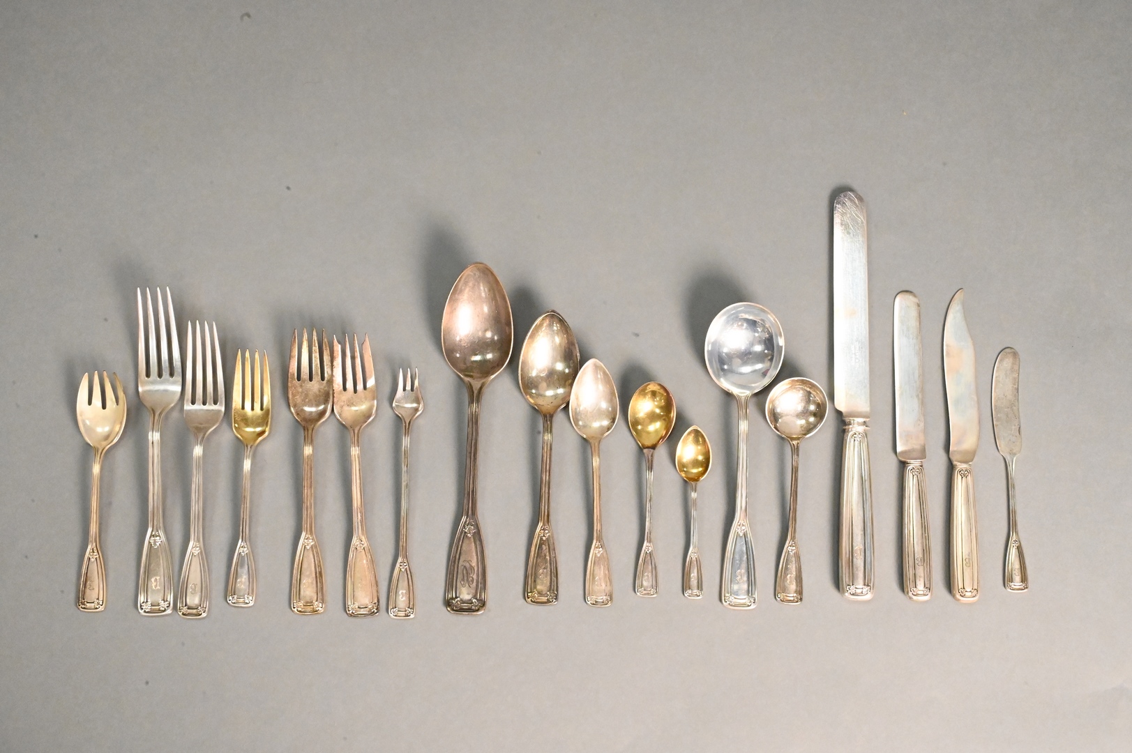 St. Dunstan pattern, to include 12 dinner forks, 24 luncheon forks, 24 salad forks, 12 dessert forks, 12 cocktail forks, 12 fish forks, 12 tablespoons, 16 teaspoons, 12 bouillon spoons, 12 soup spoons, 12 dessert spoons, 11 demitasse spoons, 24 luncheon knives, 12 dinner knives, 12 butter knives, 12 fish knives, 12 salad knives, 2 extra knives