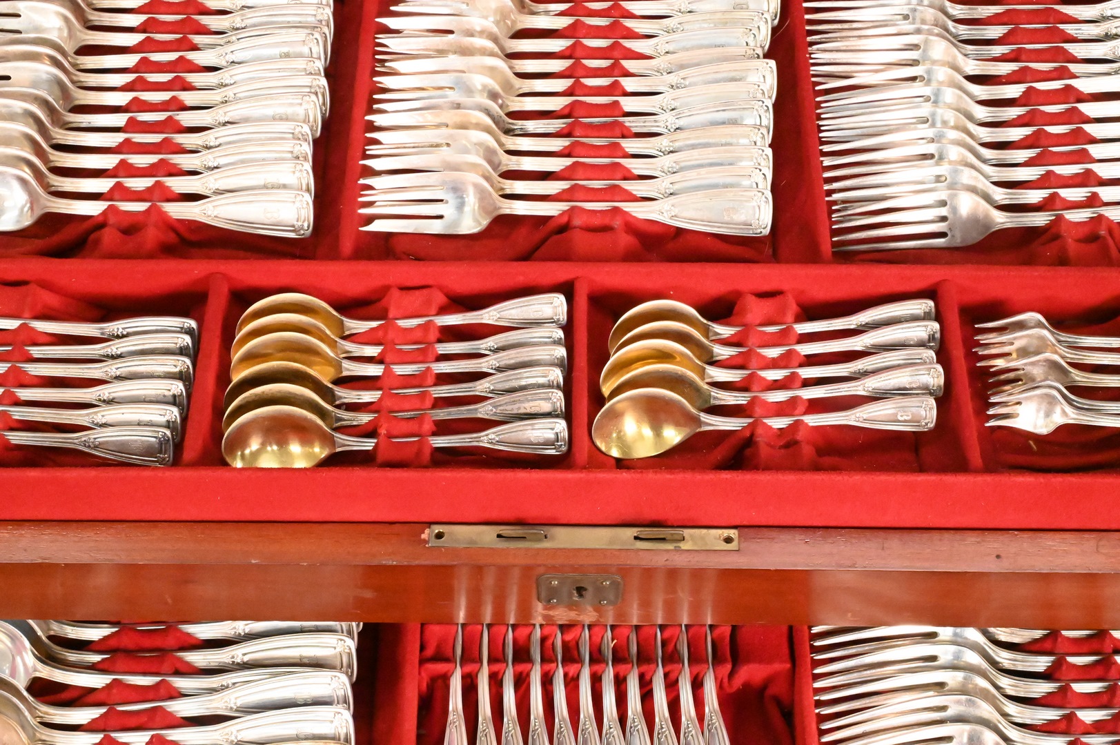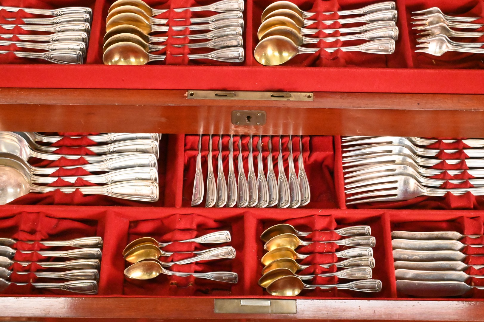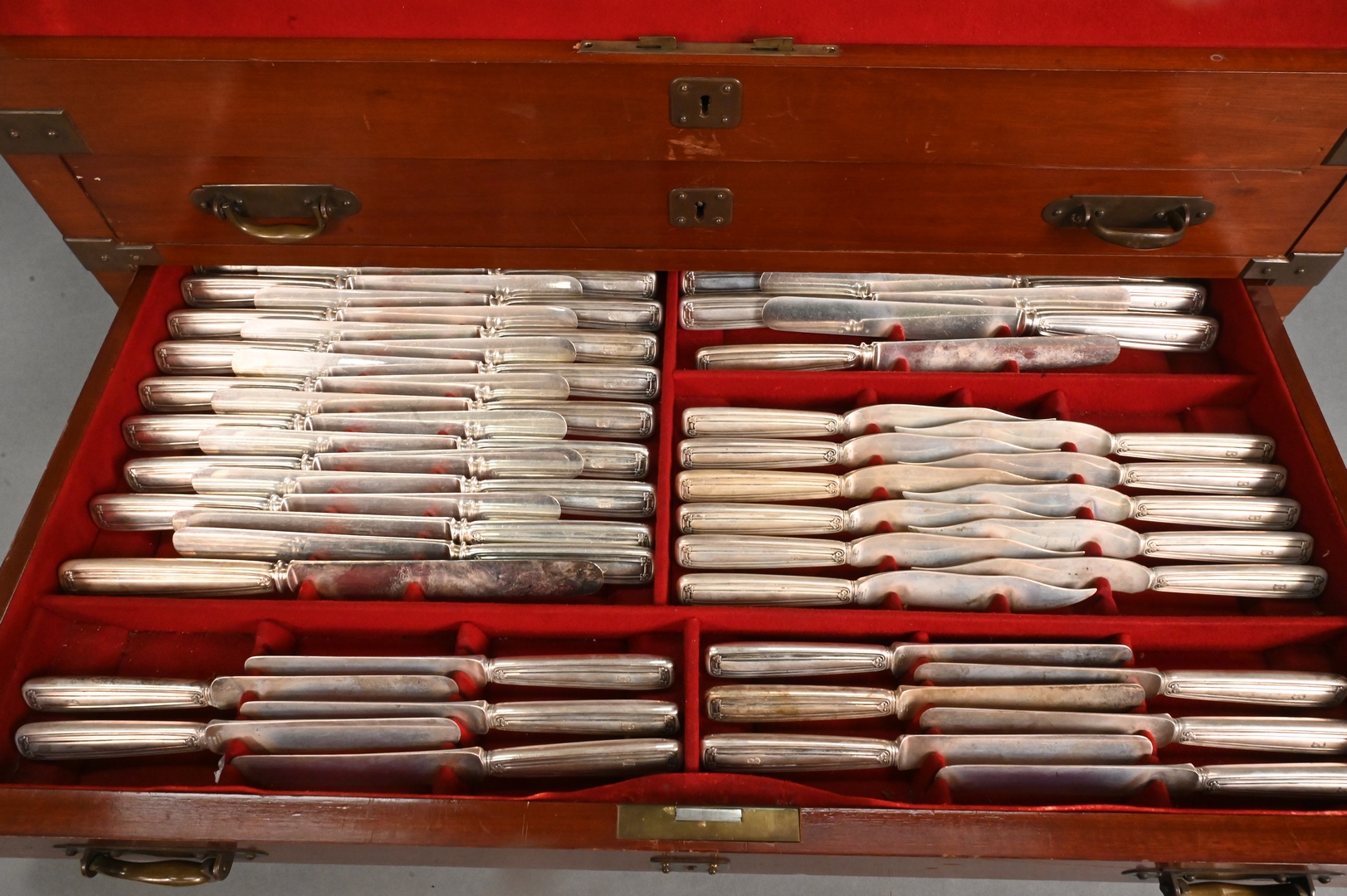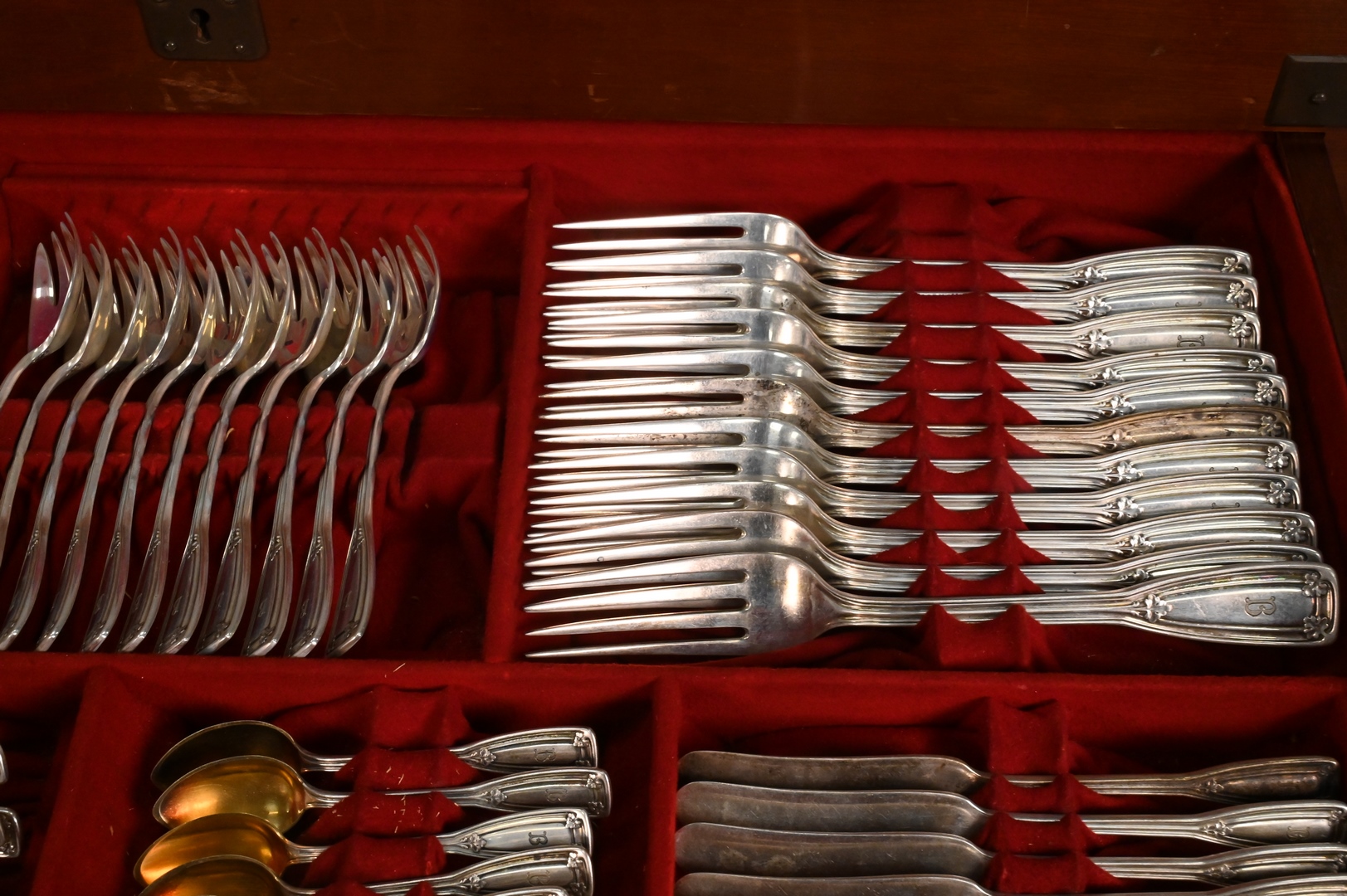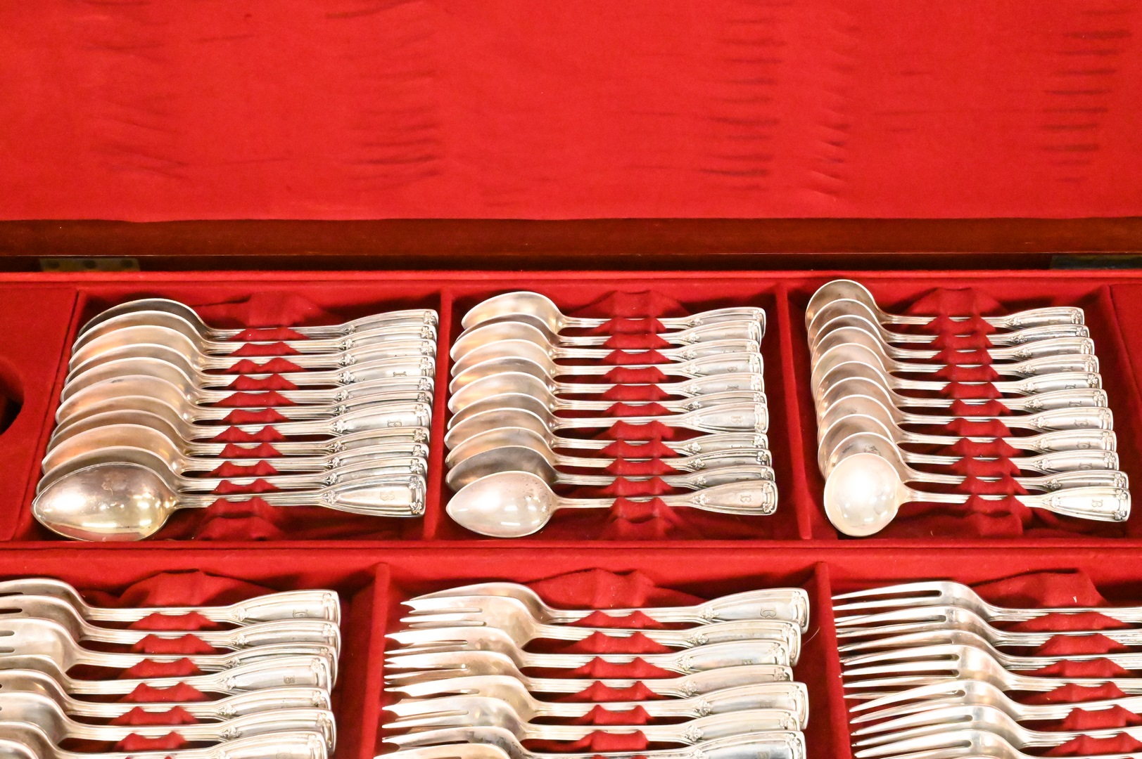 St. Dunstan pattern, to include 12 dinner forks, 24 luncheon forks, 24 salad forks, 12 dessert forks, 12 cocktail forks, 12 fish forks, 12 tablespoons, 16 teaspoons, 12 bouillon spoons, 12 soup spoons, 12 dessert spoons, 11 demitasse spoons, 24 luncheon knives, 12 dinner knives, 12 butter knives, 12 fish knives, 12 salad knives, 2 extra knives