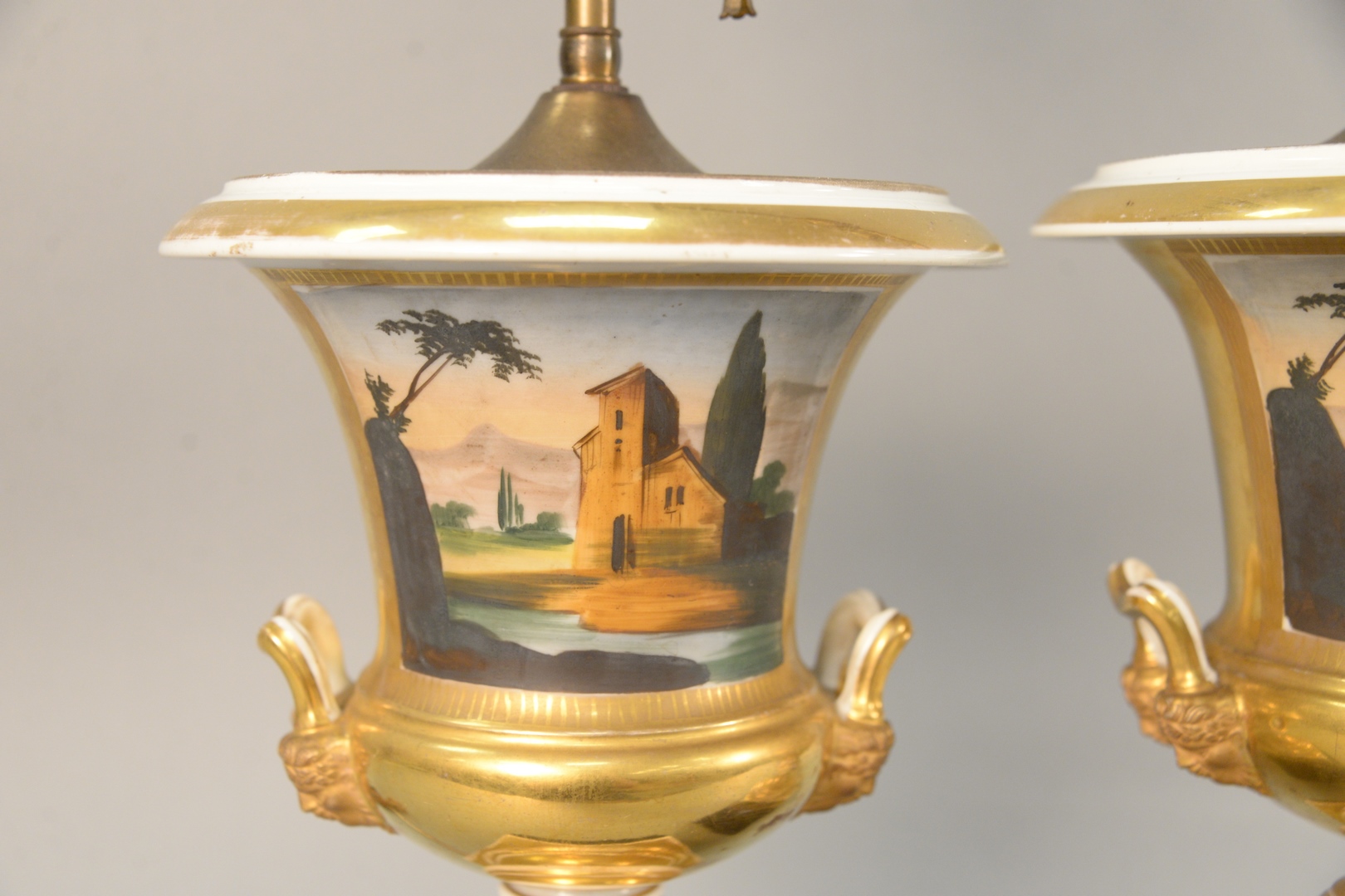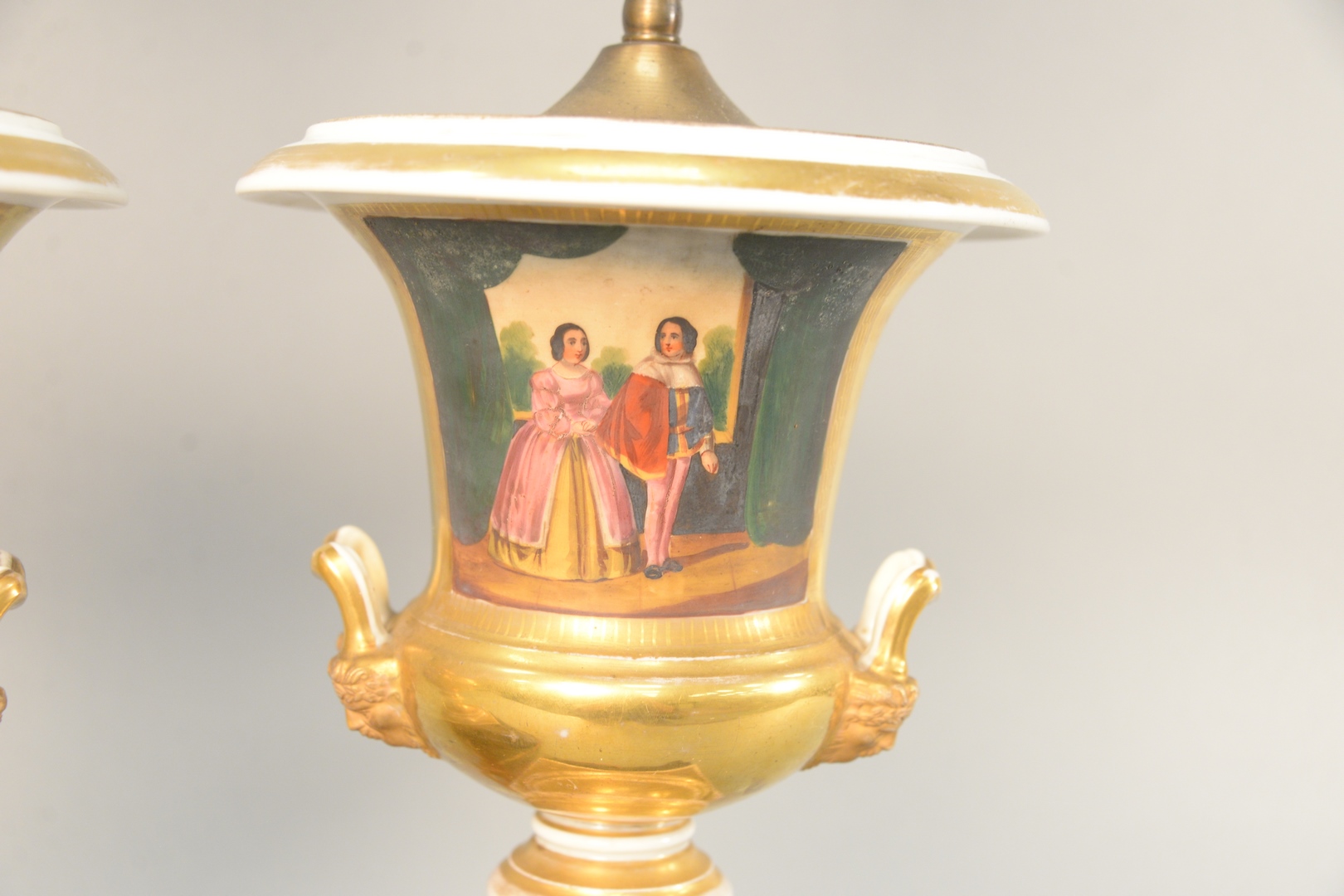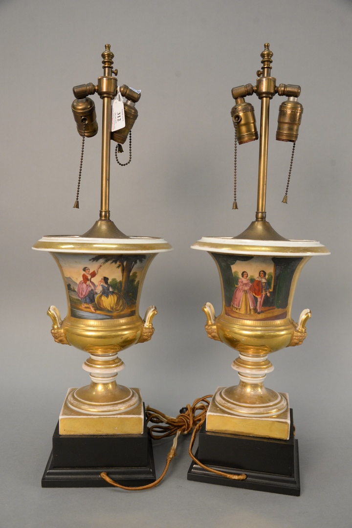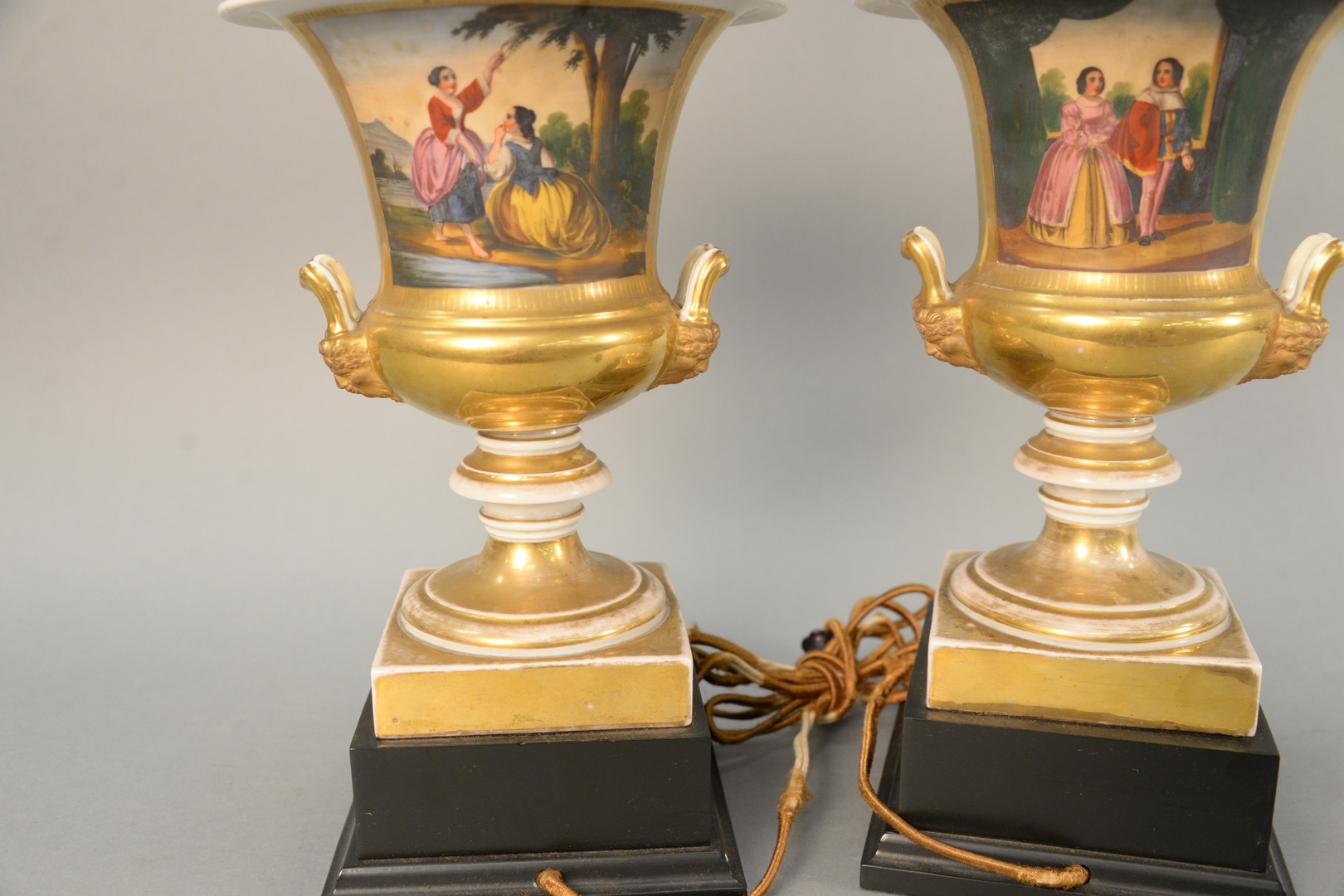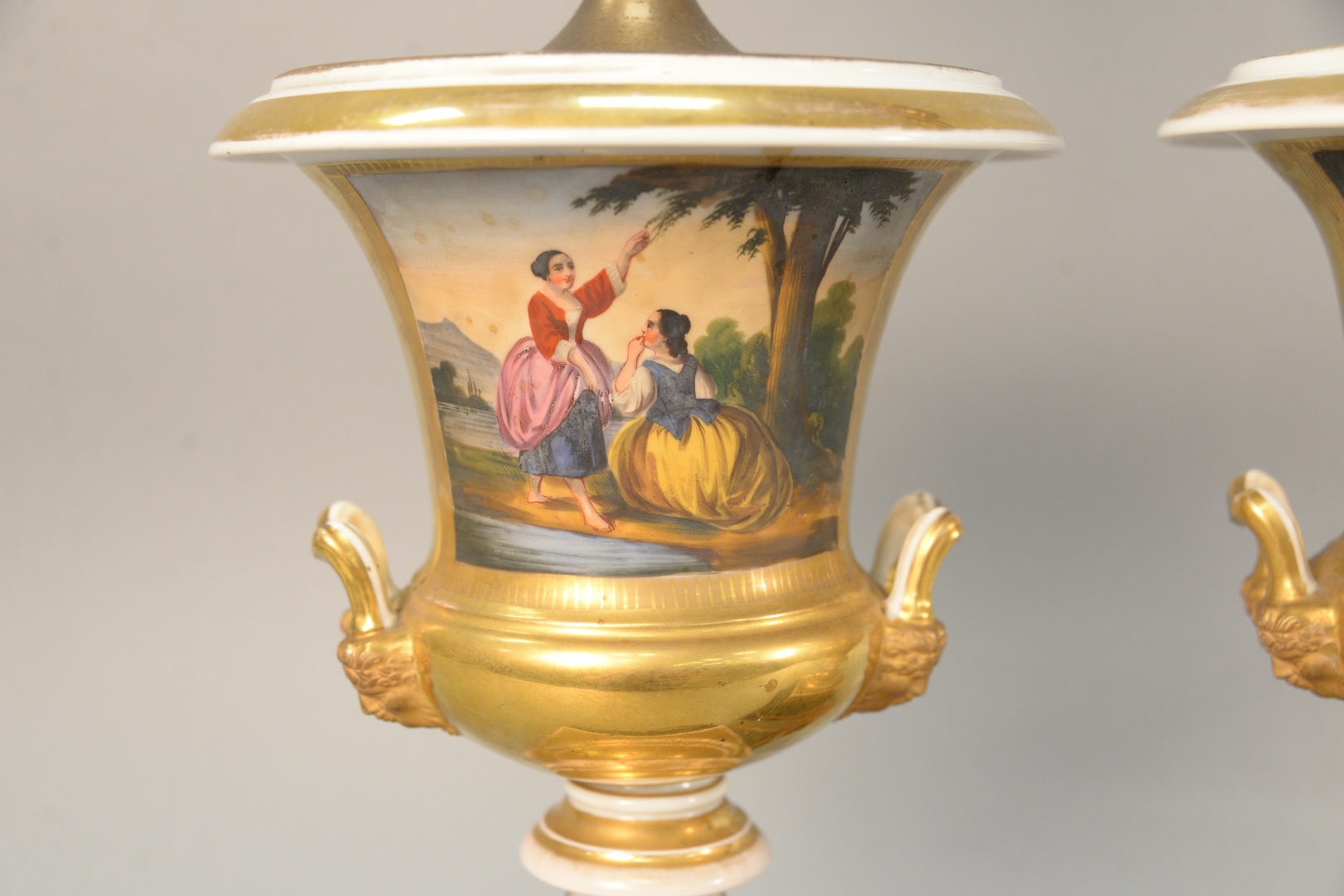Lot 312: A Pair of Paris Porcelain Urns having painted scenes on each side, gilt mask handles, on wood plinth base height of urn on base 14 i…