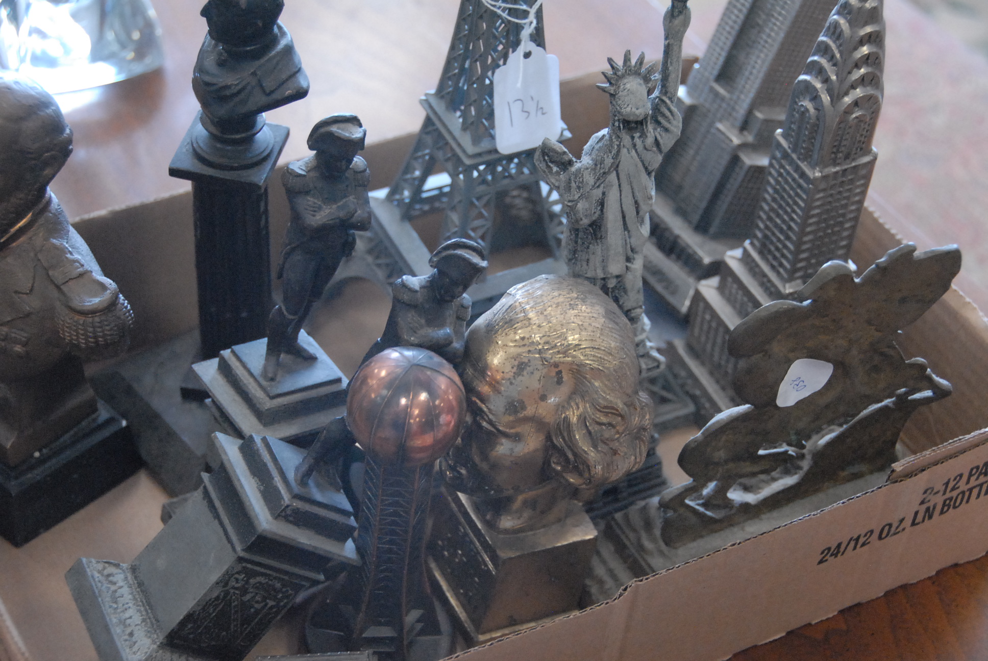Box lot to include models of Eifel Tower, Statue of Liberty, Empire States Building, and bust.