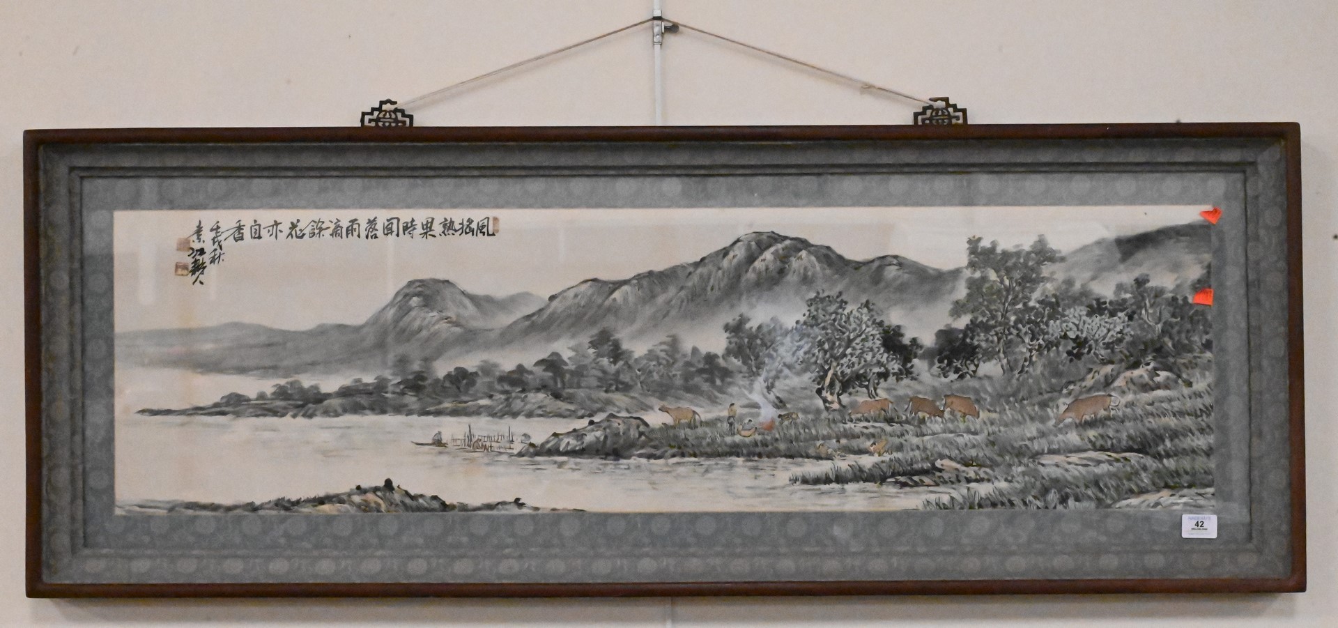 Chinese Landscape, watercolor, depicting figures working along river bank with Mountainous background, having silk border and characters, along with seal, image 12″ x 47″.
