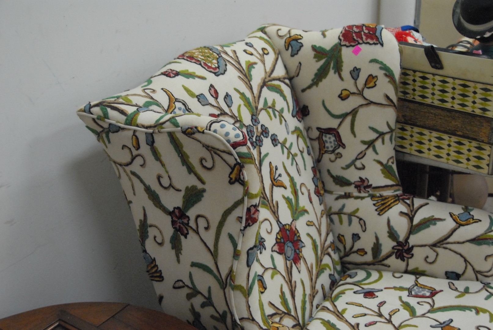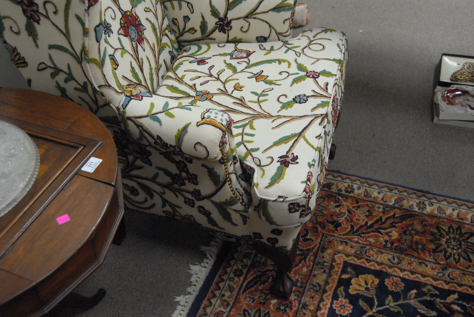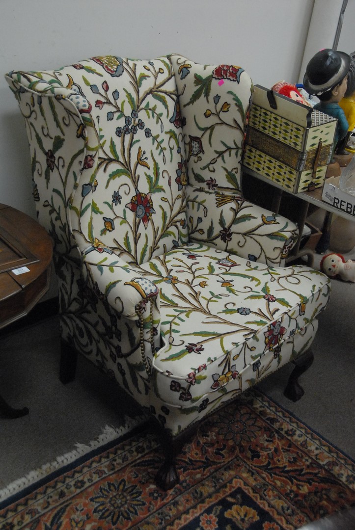 Crewel upholstered wing chair with ball and claw feet.