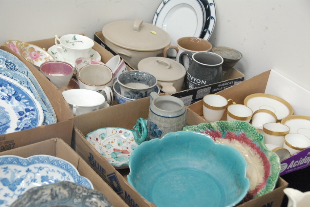 Eight box lots blue and white china, Majolica, cups and saucers etc.