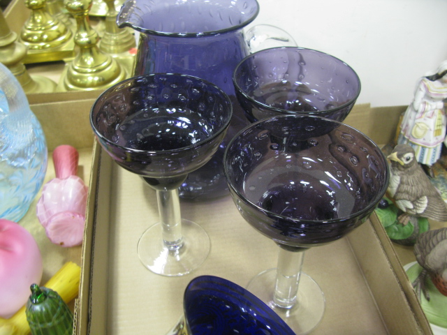Five box lots of artglass including Fenton glass, signed vases, blue pitcher, Amberina tumbler, satin glass, perfume, artglass fruit, paperweights, cobalt blue pieces, pitcher with large margarita glasses