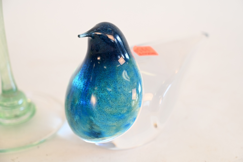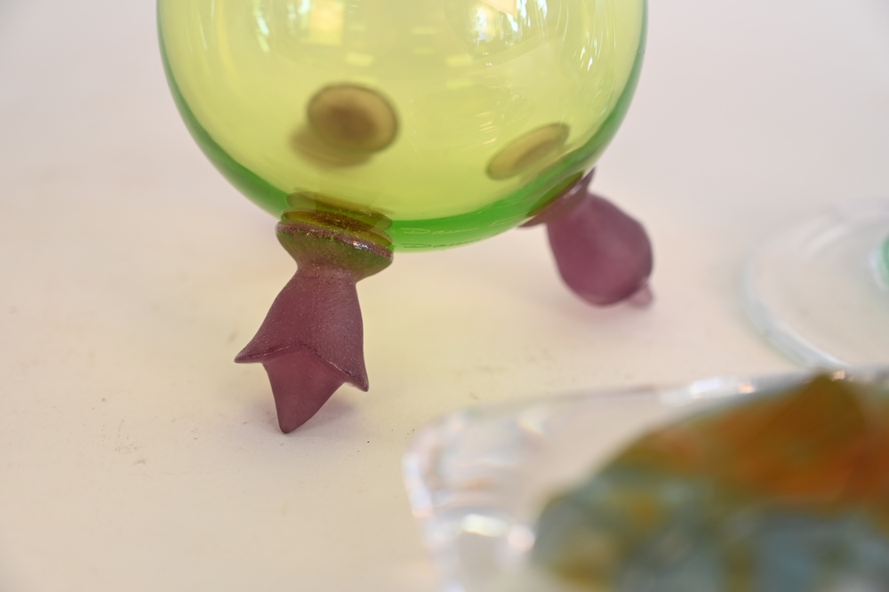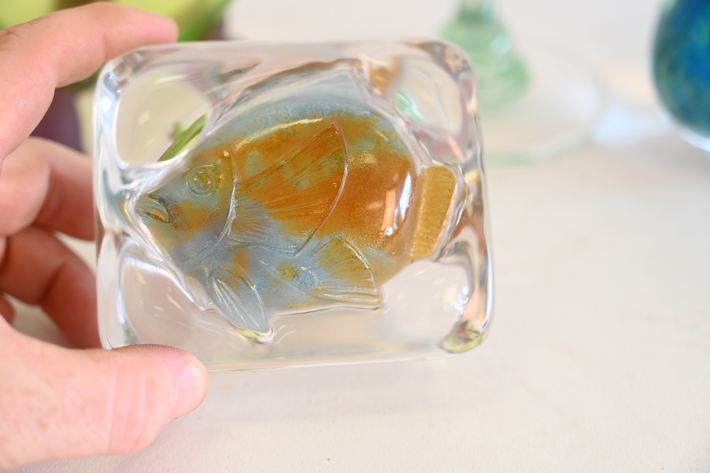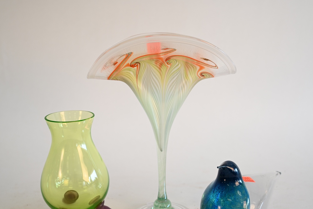 Lot 312: Four Piece Art Glass Group, to include Vandermark art glass fan vase “4358”, in green and orange, signed and dated “1977” to the underside, Daum France vase, along with a bird and fish, marked illegibly.