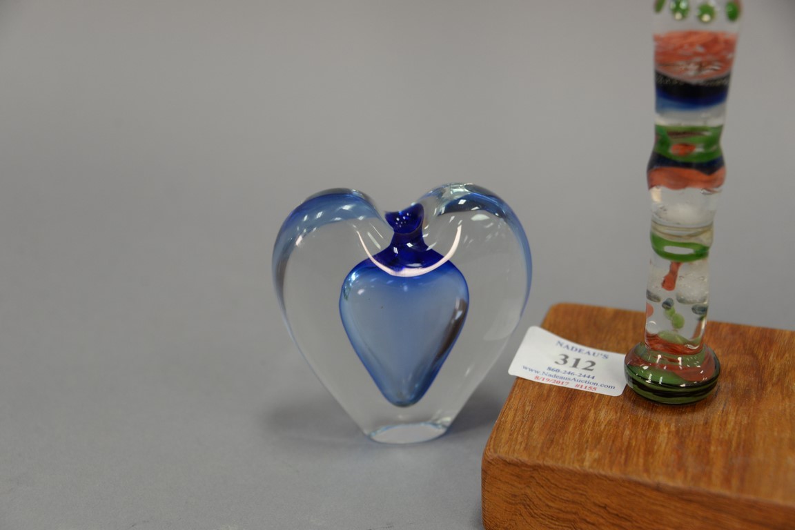 Four piece lot to include Zellique Studio art glass heart shaped perfume without stopper ht. 3 1/2in., Baccarat heart paperweight ht. 2 3/4in., paperweight, and art glass candle stick on wood base ht. 8 1/2in..