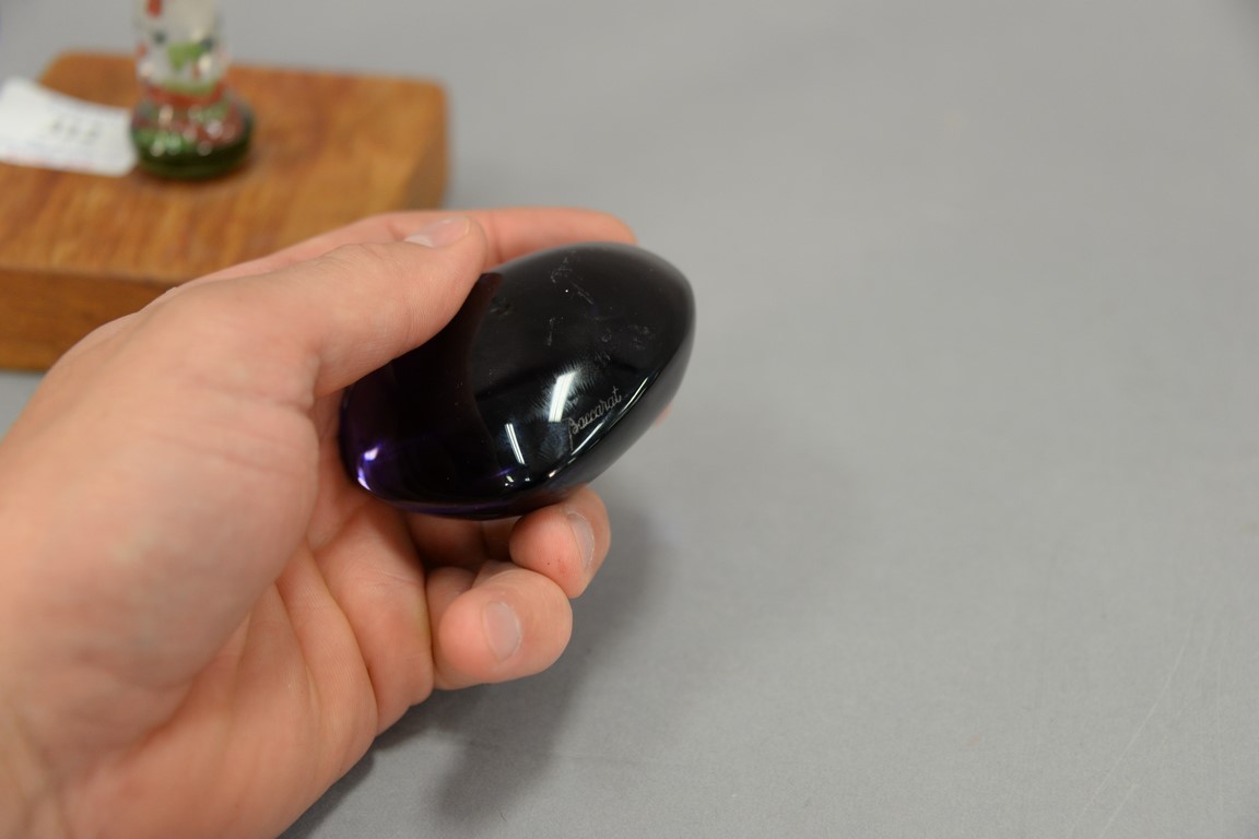 Lot 312: Four piece lot to include Zellique Studio art glass heart shaped perfume without stopper ht. 3 1/2in., Baccarat heart paperweight …