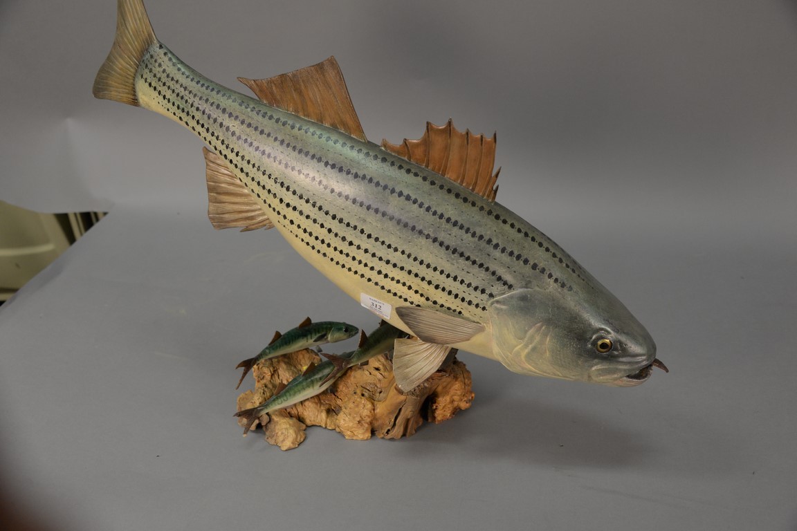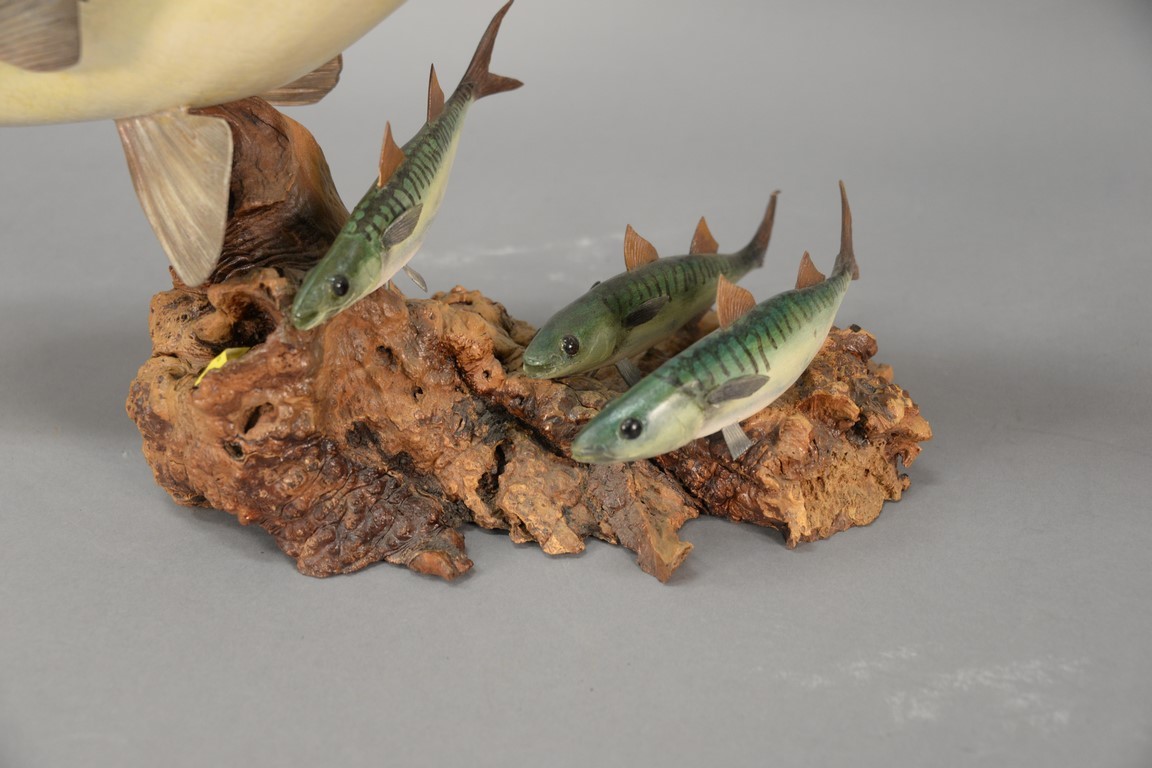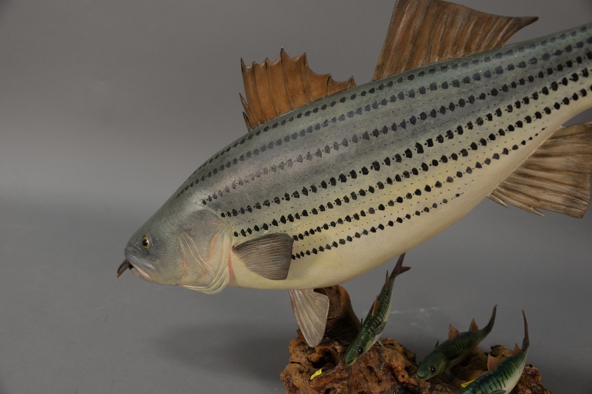 Gallagher striped bass decoy sculpture with three small macerals. ht. 22 1/2in., lg. 30in.