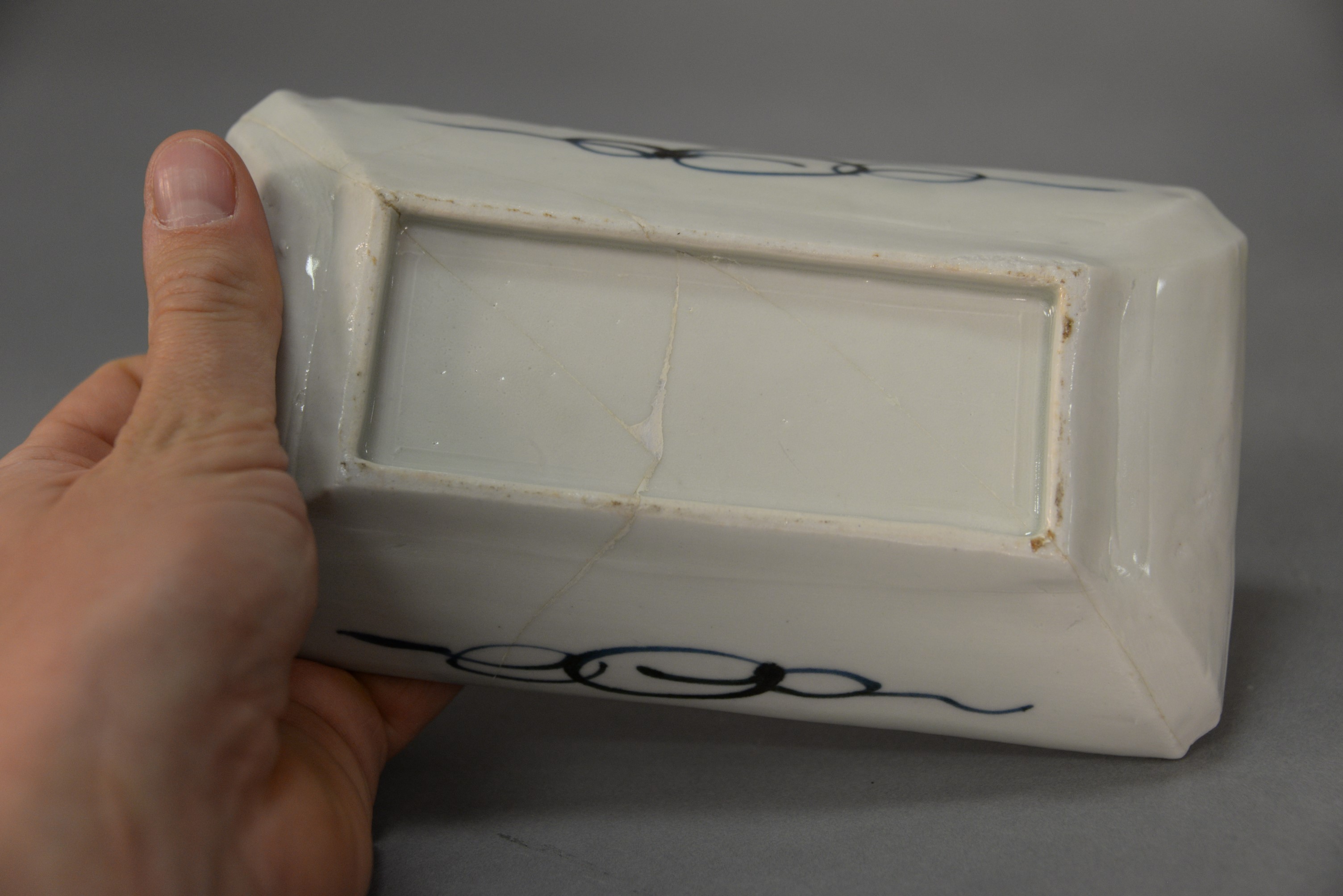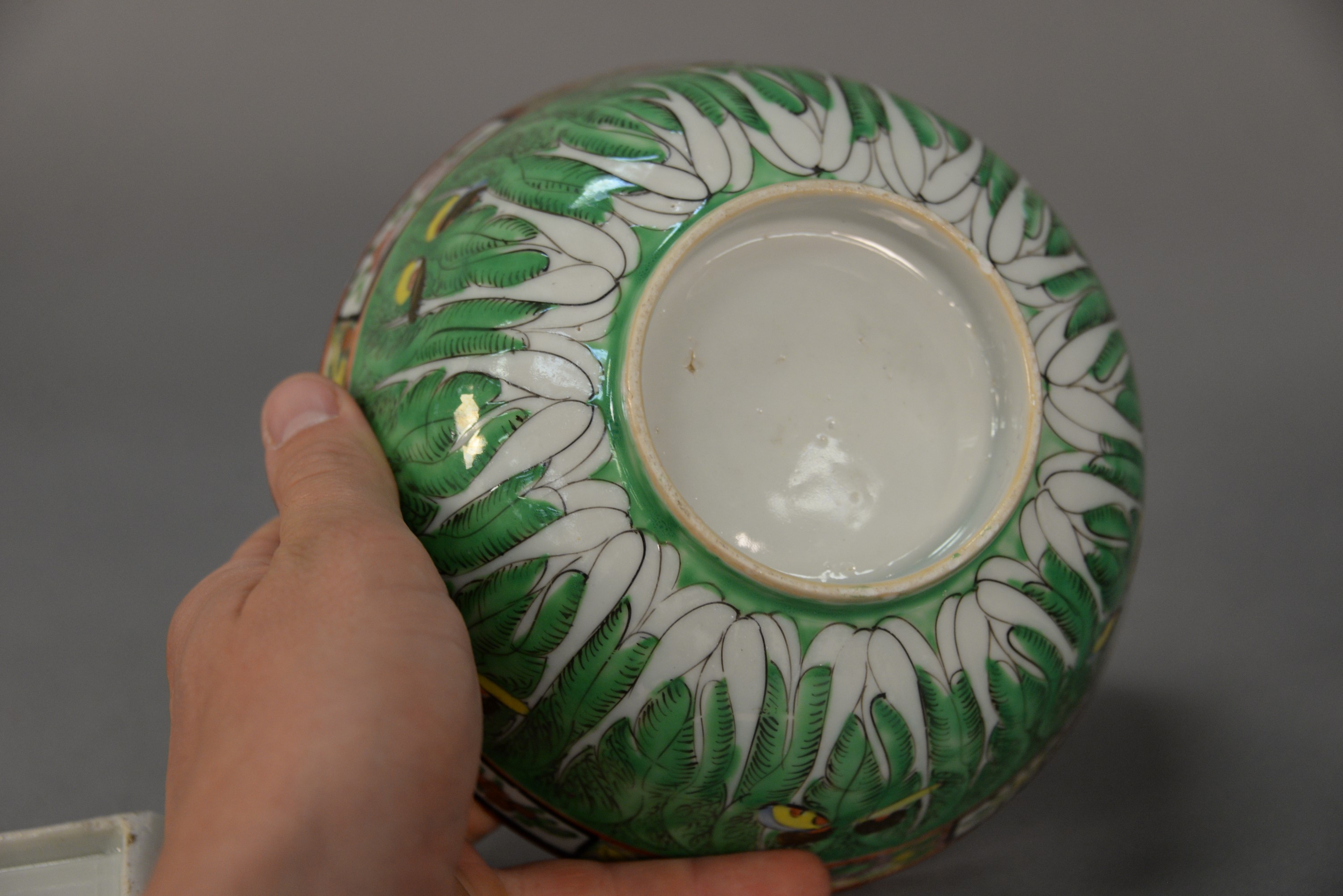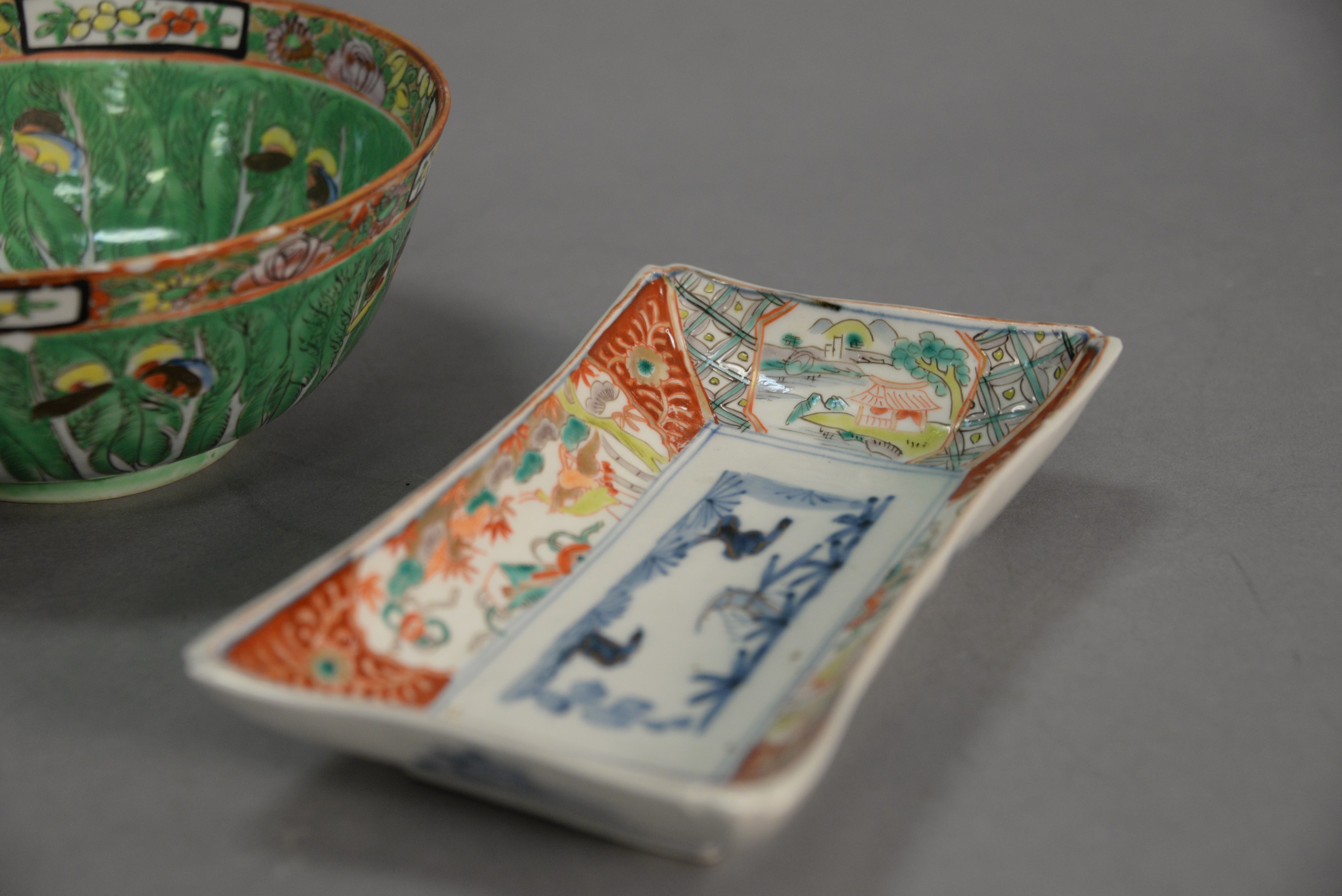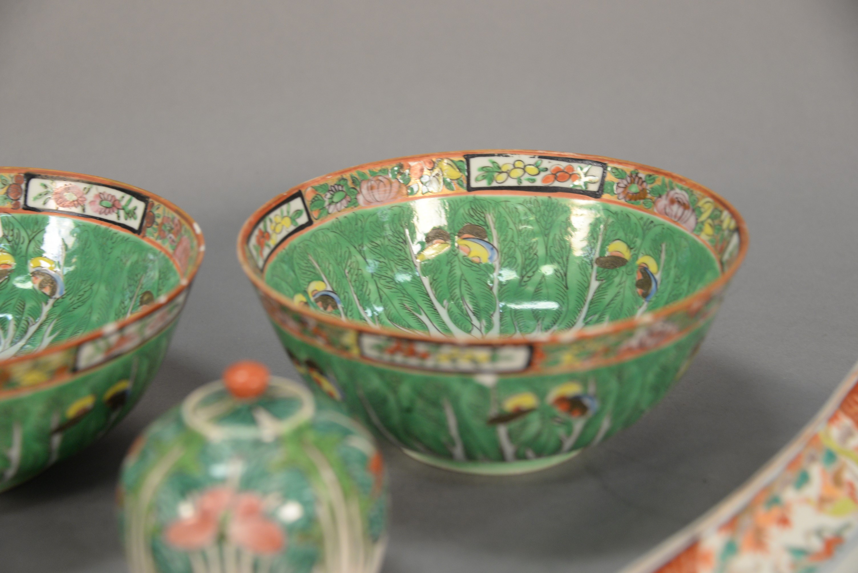 Group of five Chinese porcelain pieces to include Chinese Export Famille Verte butterfly pattern jar and two bowls, and two rectangular dishes some chips. bowls: ht. 3 in. dia. 7 in. Provenance: The Estate of Natalie Rafferty
