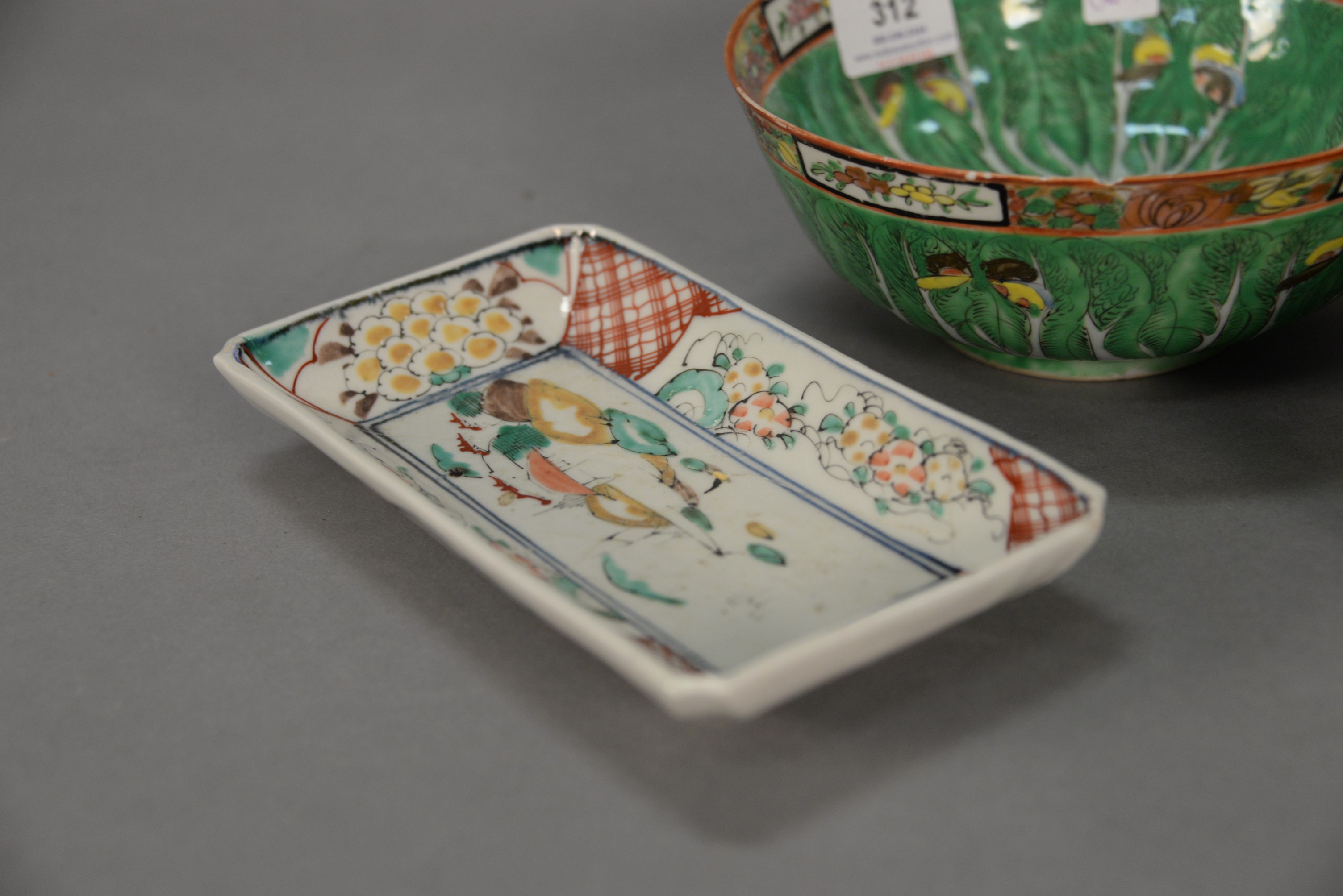 Lot 312: Group of five Chinese porcelain pieces to include Chinese Export Famille Verte butterfly pattern jar and two bowls, and two rectangu…