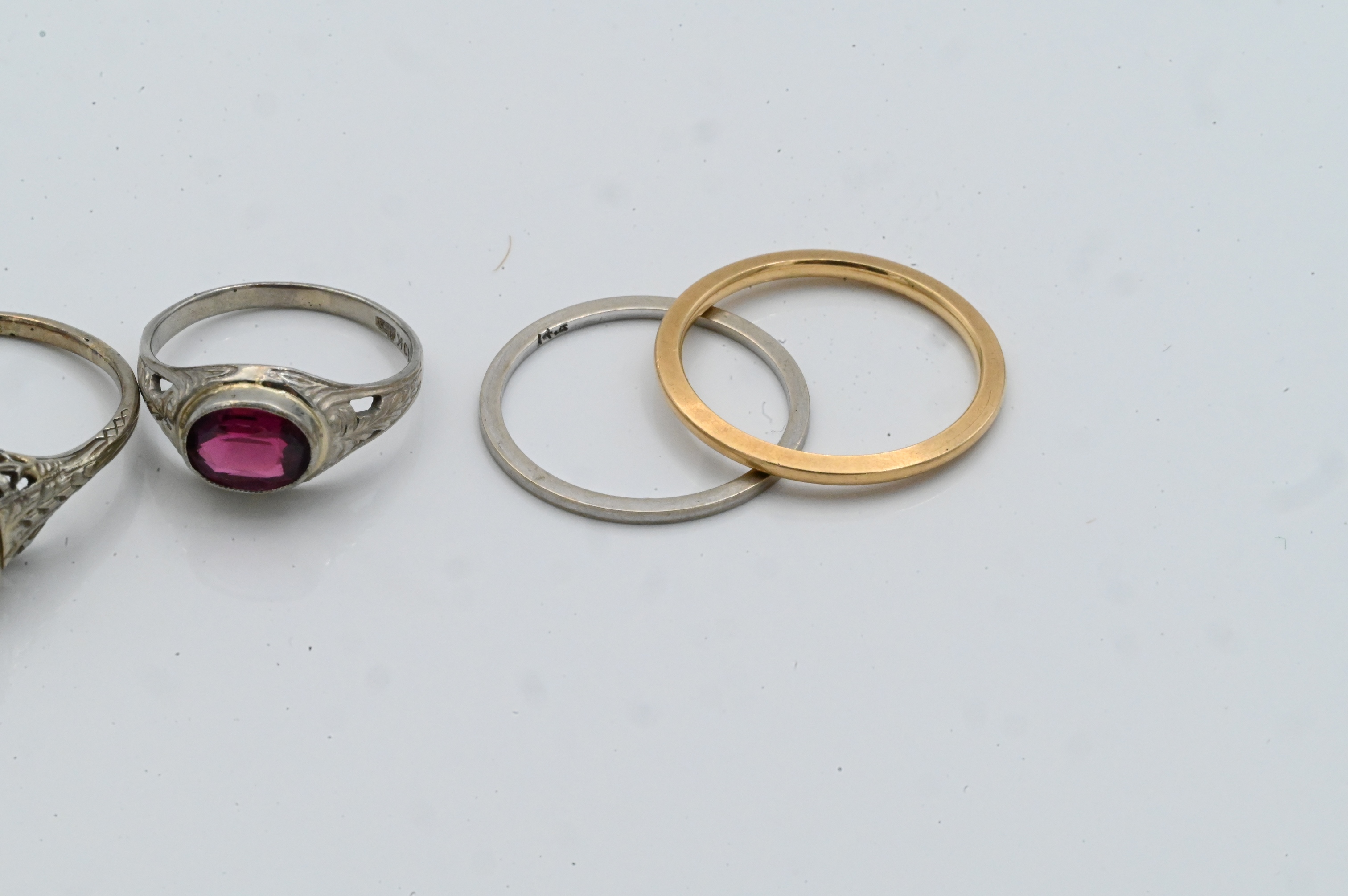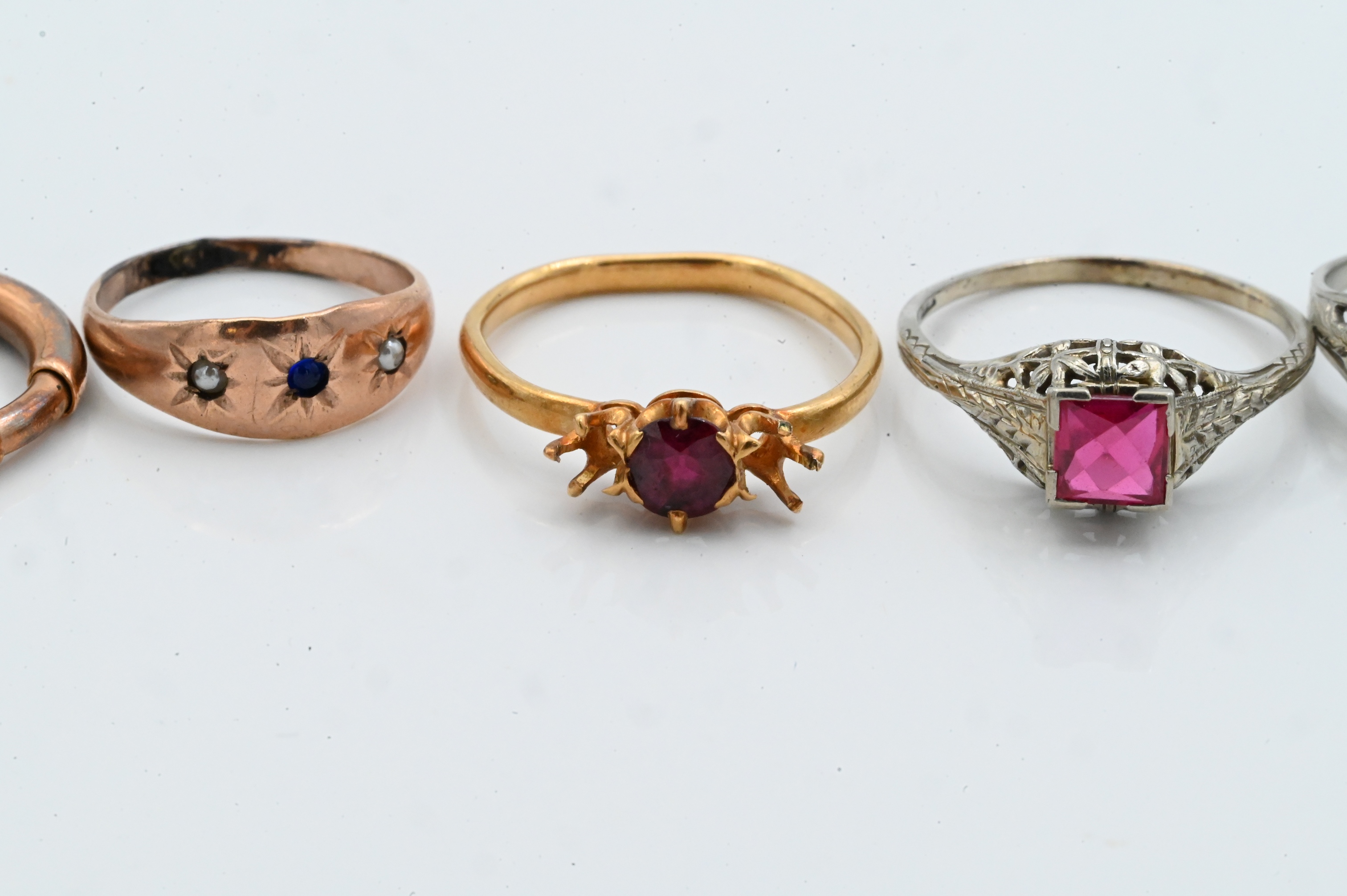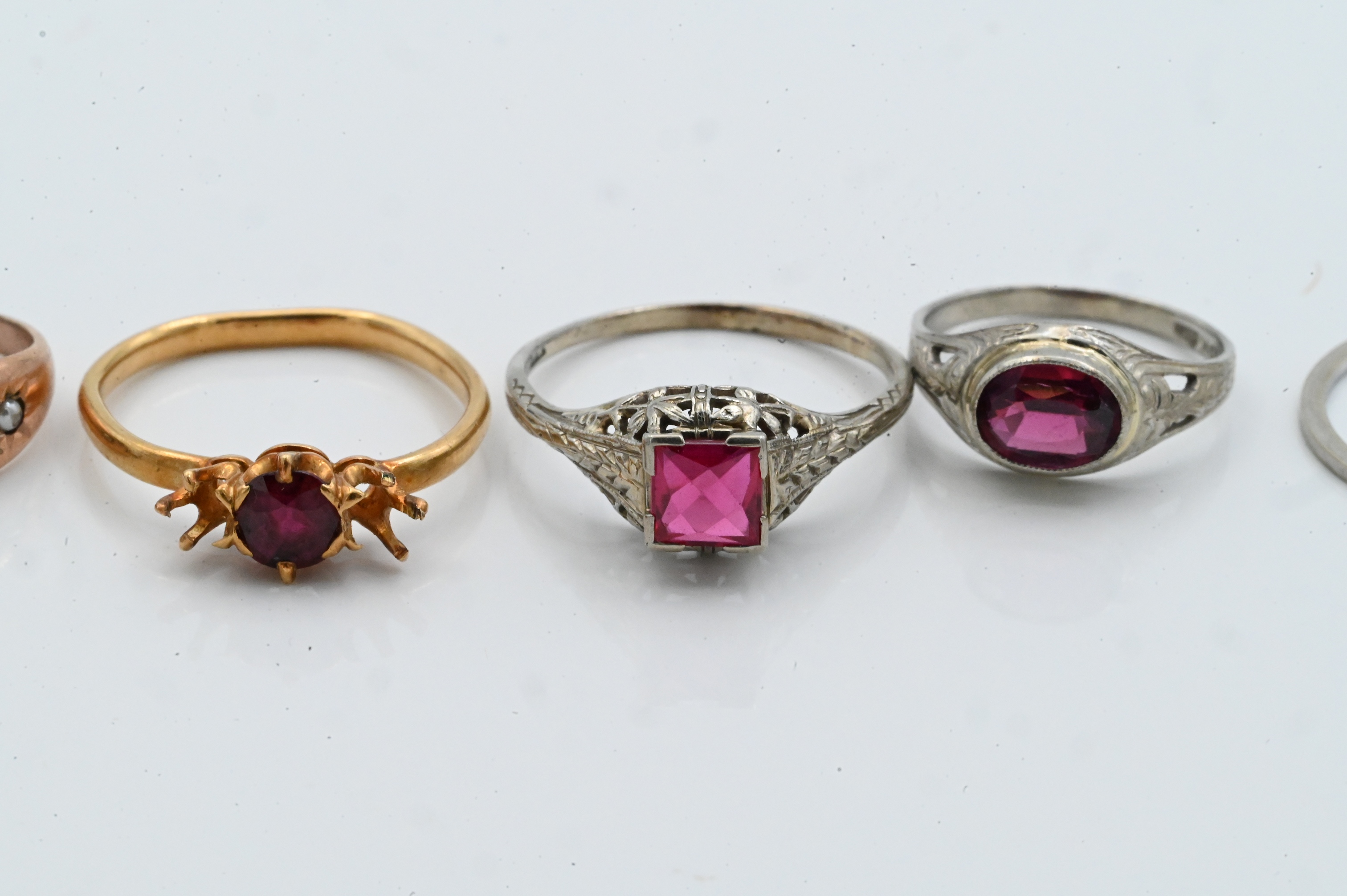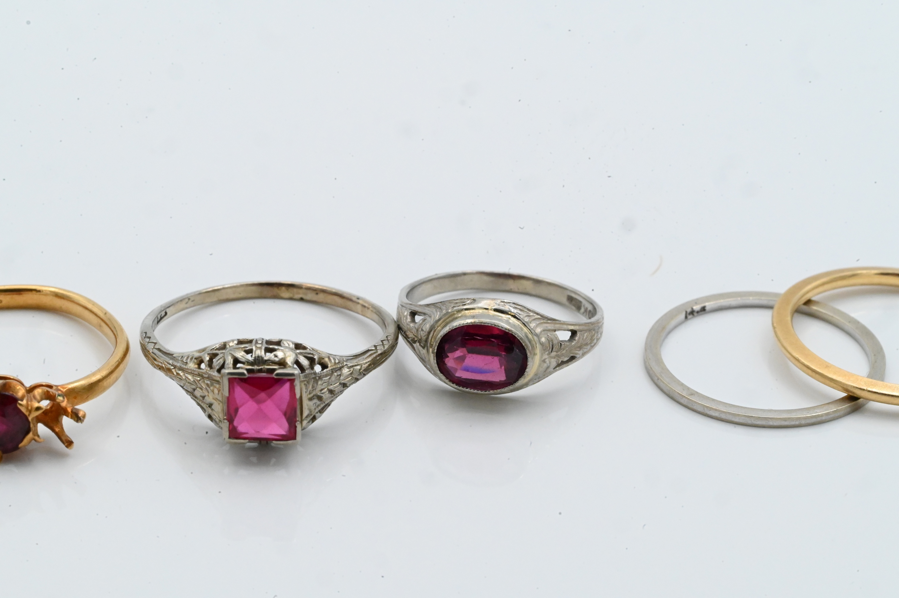 Including three 10K gold rings set with imitation rubies and sapphires, total weight 5.1 grams; two 14K gold wedding bands, total weight 2.1 grams; and one 18K white gold ring by Belais, total weight 1.9 grams.