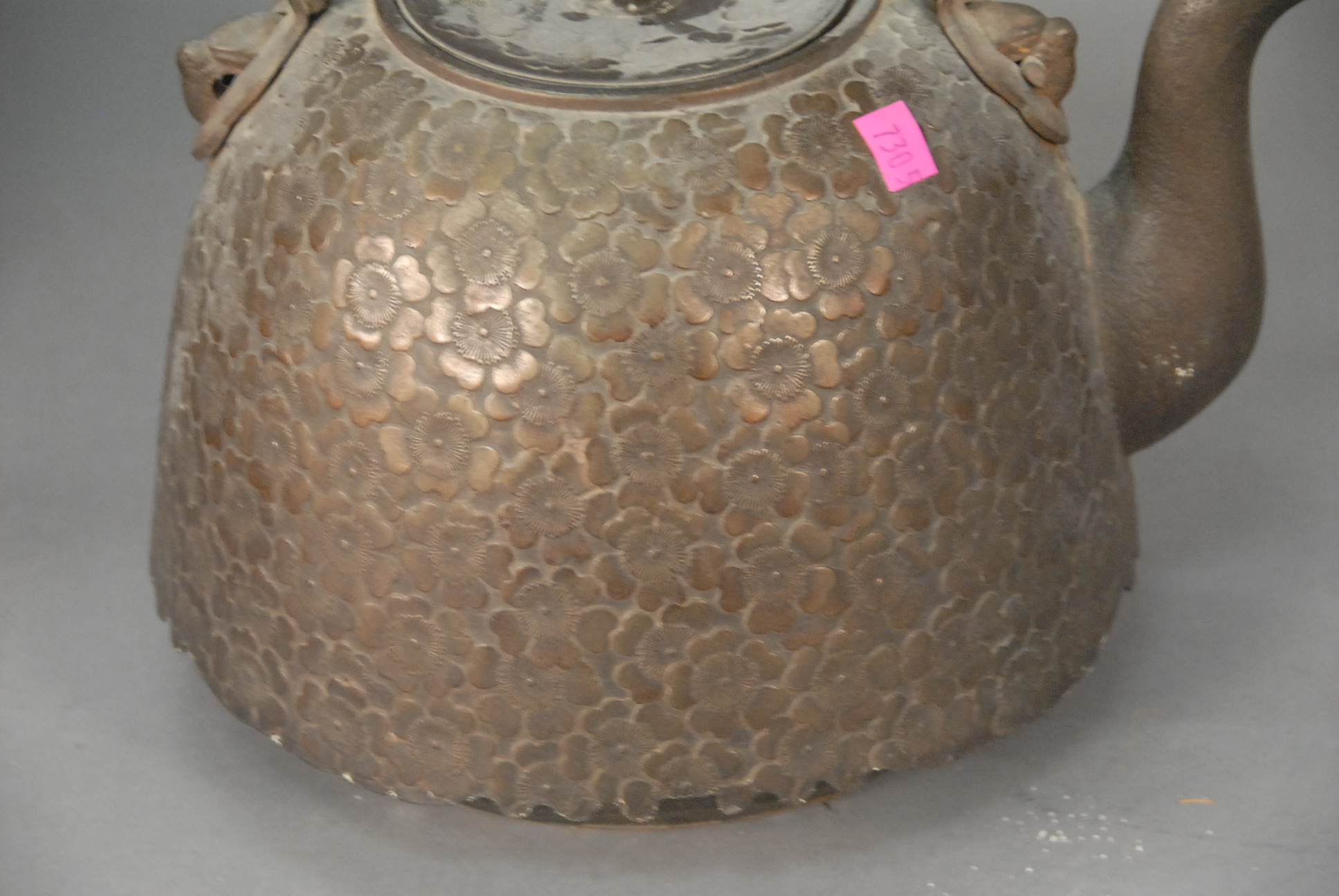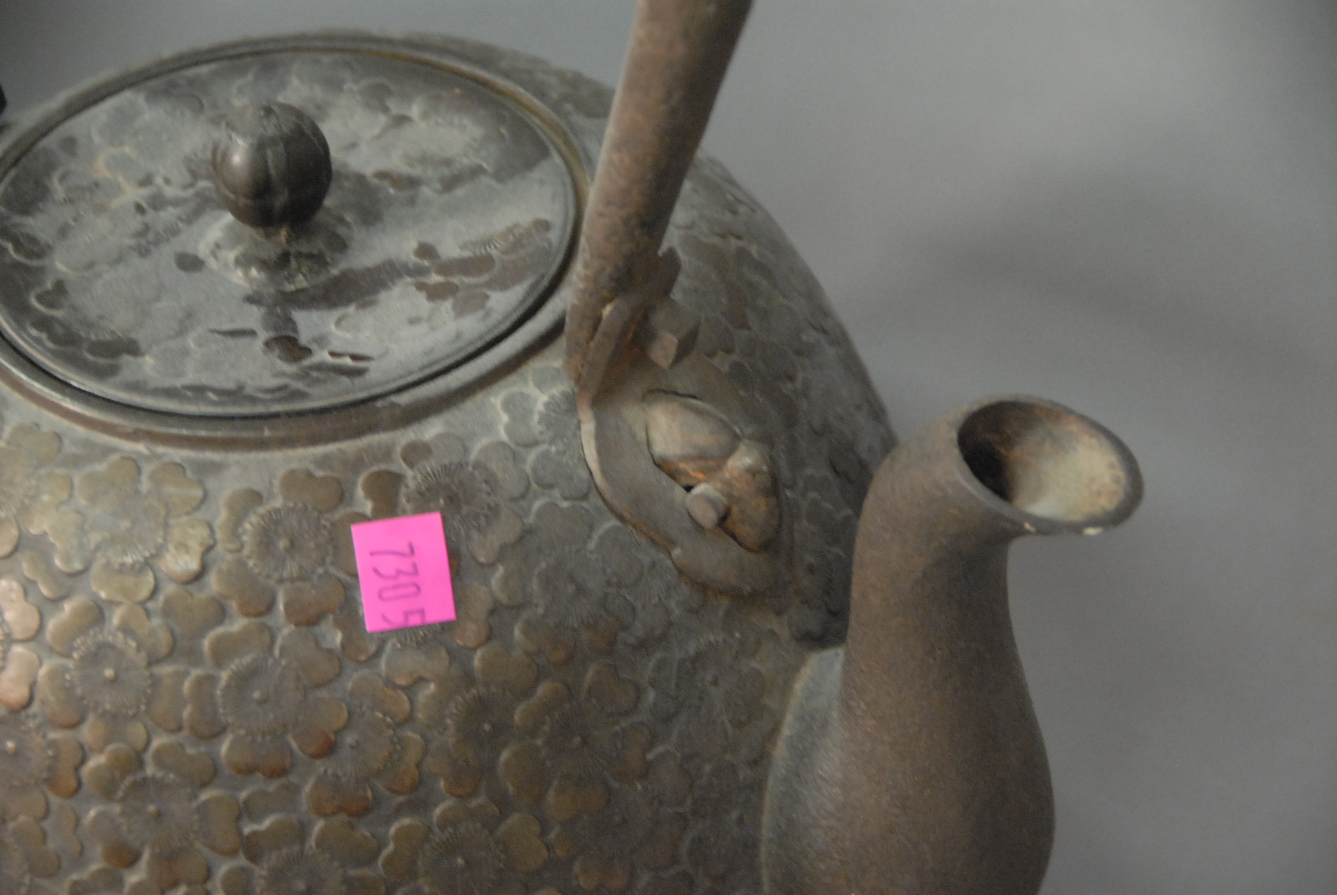 Iron Chinese tea pot molded with flowers. ht. 16 in.
