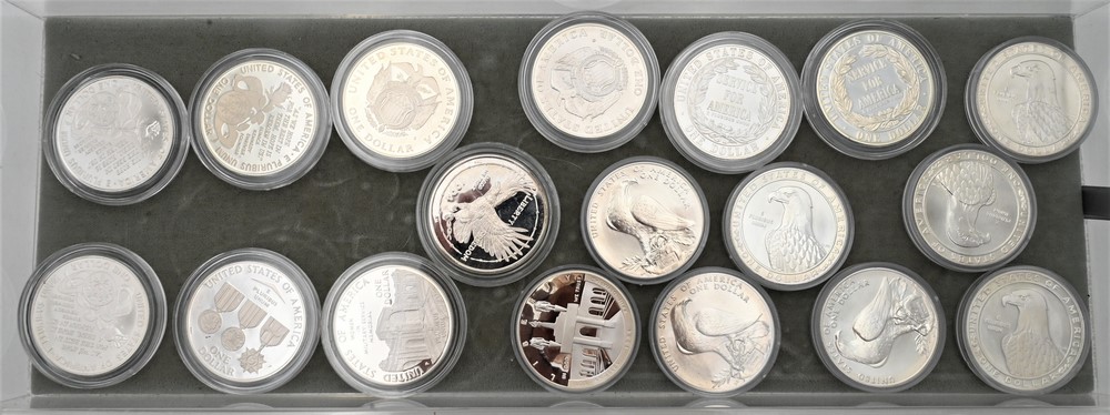 Lot of 18 Coins, to include 8 Olympic coins, 1983 P-D-S uncirculated dollars, 1986 P-D-S uncirculated dollars; 1983-S proof; 1984-S proof; 5 1994 silver dollars, (1 uncirculated and 4 proofs), Women in Military Service, National POW, Vietnam Veterans Memorial, Capital, 1 uncirculated and 1 proof; 1995 Special Olympics World Games 3 piece set to include silver dollars, 2 uncirculated, 1 proof; along with 2 1996 Community Service uncirculated silver dollars, and 1 dollar silver proof.