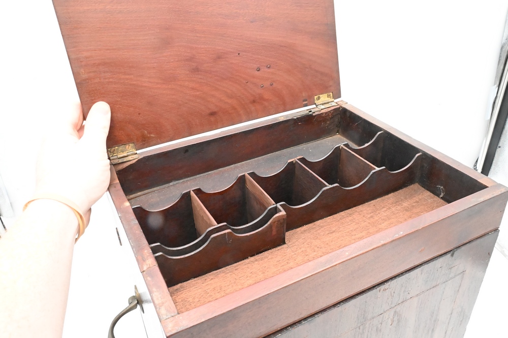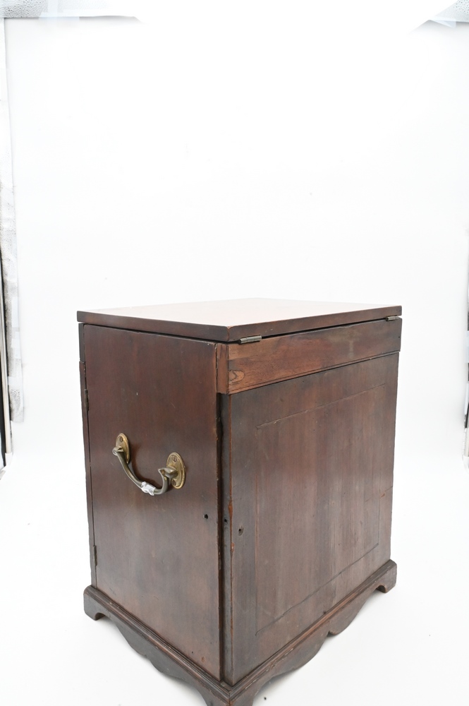 Lot 312: Mahogany Doctors Medicine Traveling Chest, double sided, doors open to fitted bottle holders and drawers, height 15 3/4 inches, top 10″ x 13″.