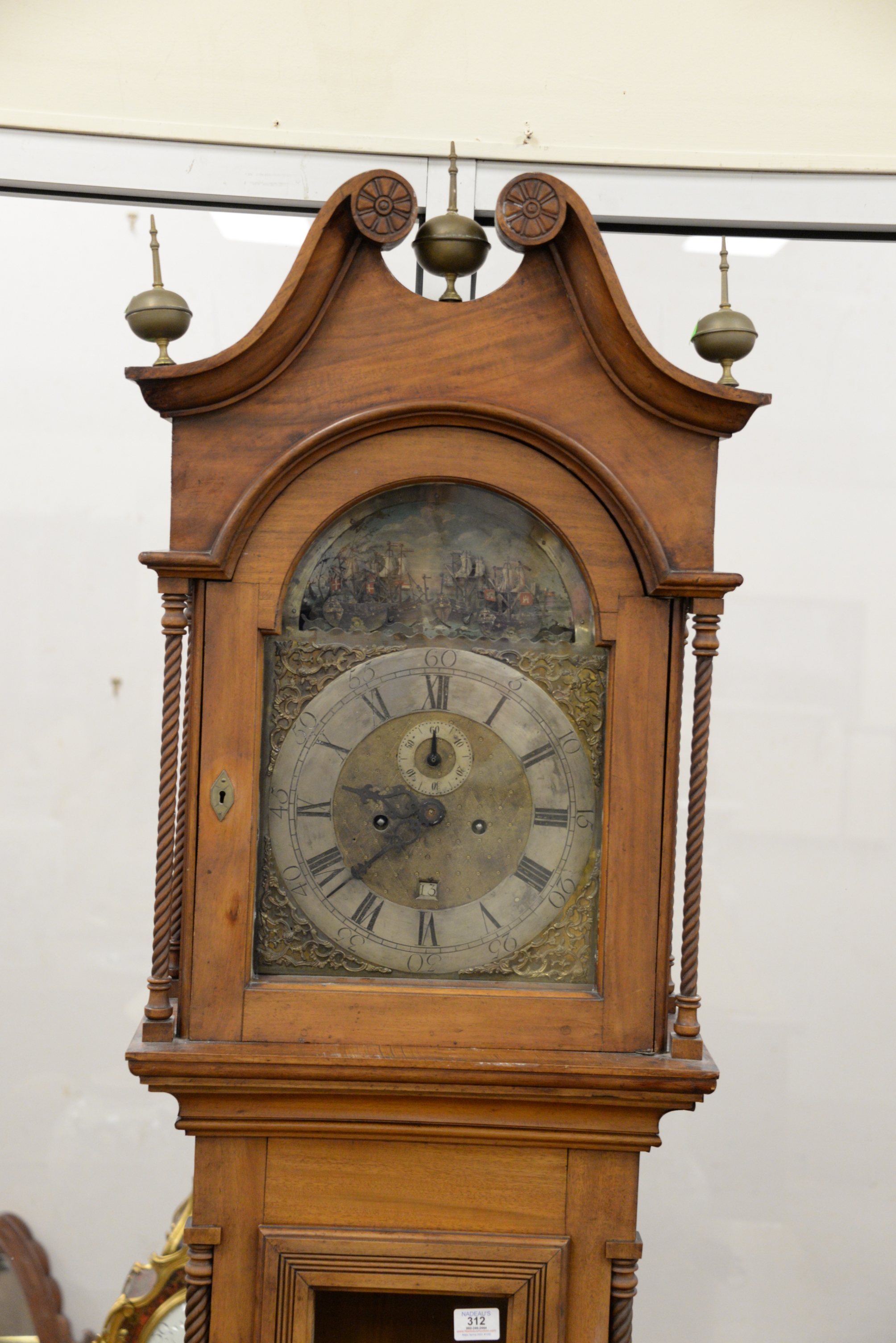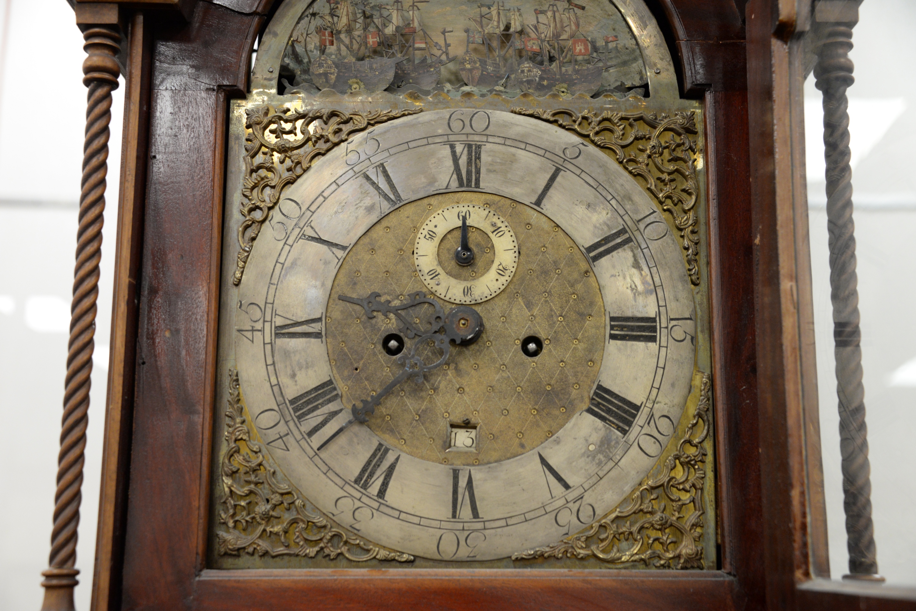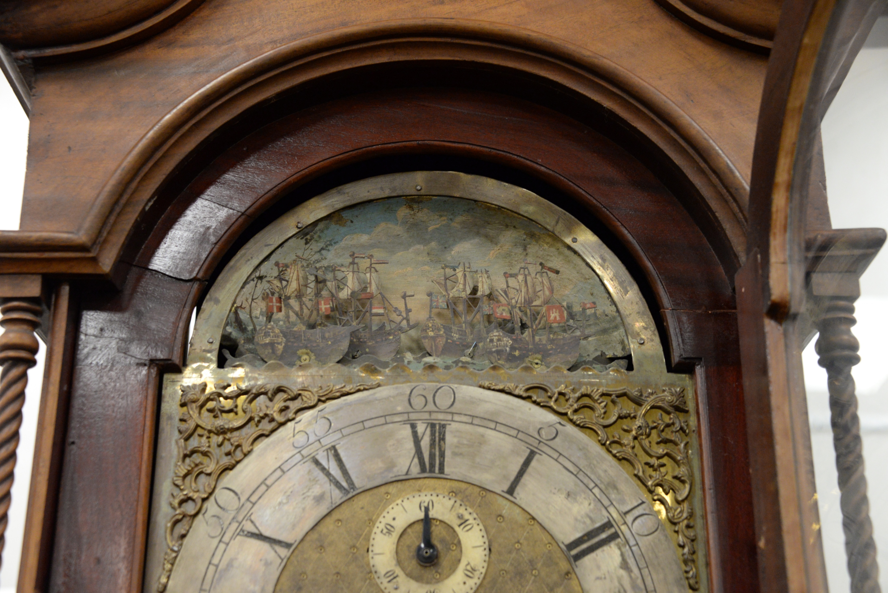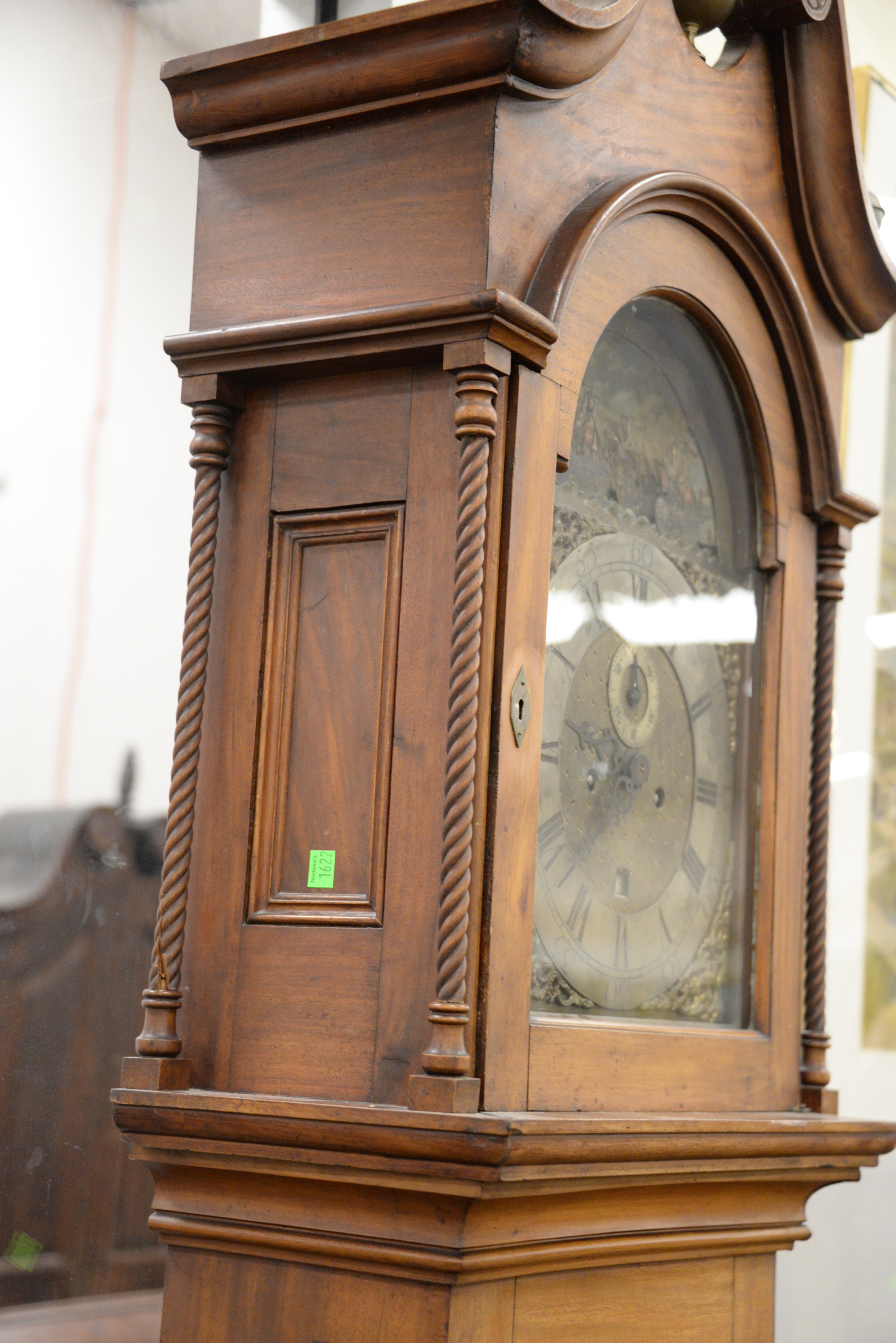 Mahogany Tall Case Clock, having broken arch top over tombstone dial over glass door, all flanked by spiral columns on plain base with ogee feet, brass and painted dial with rocking ship, works with ships, calendar and second hand, height 96 inches.
