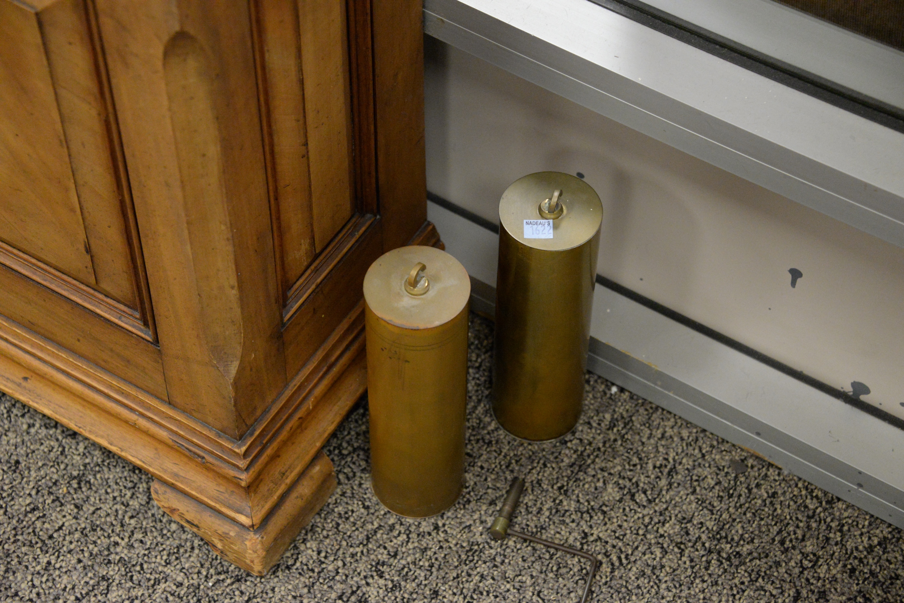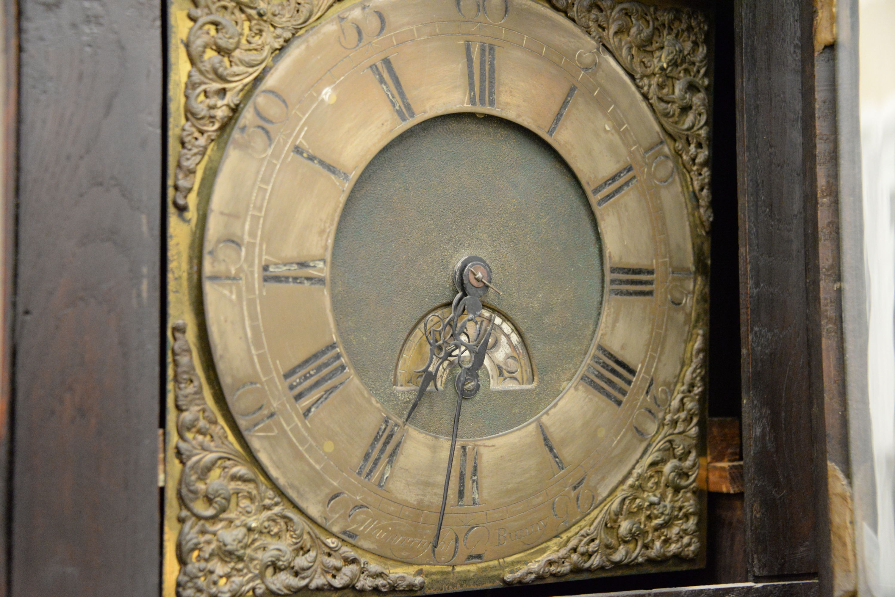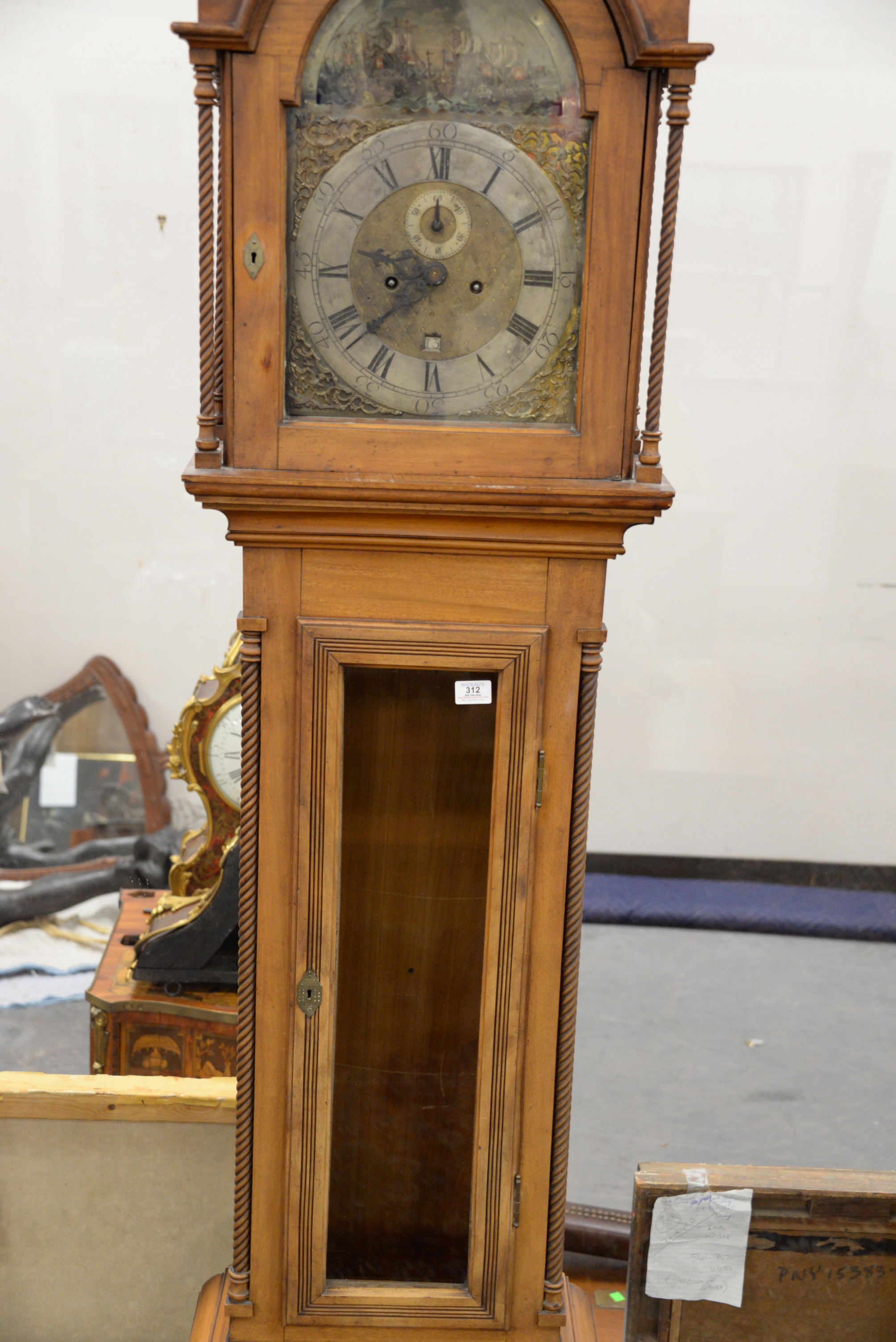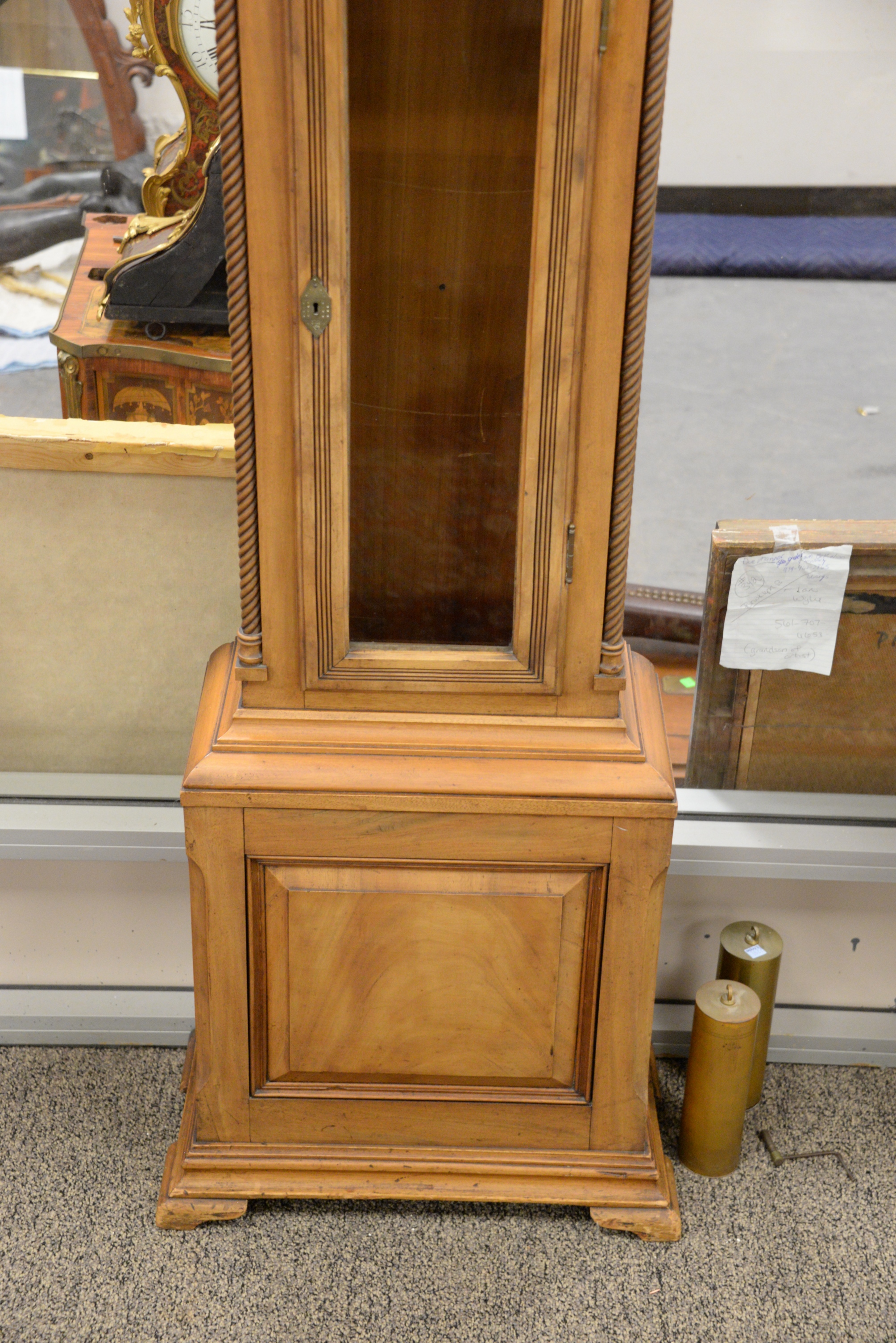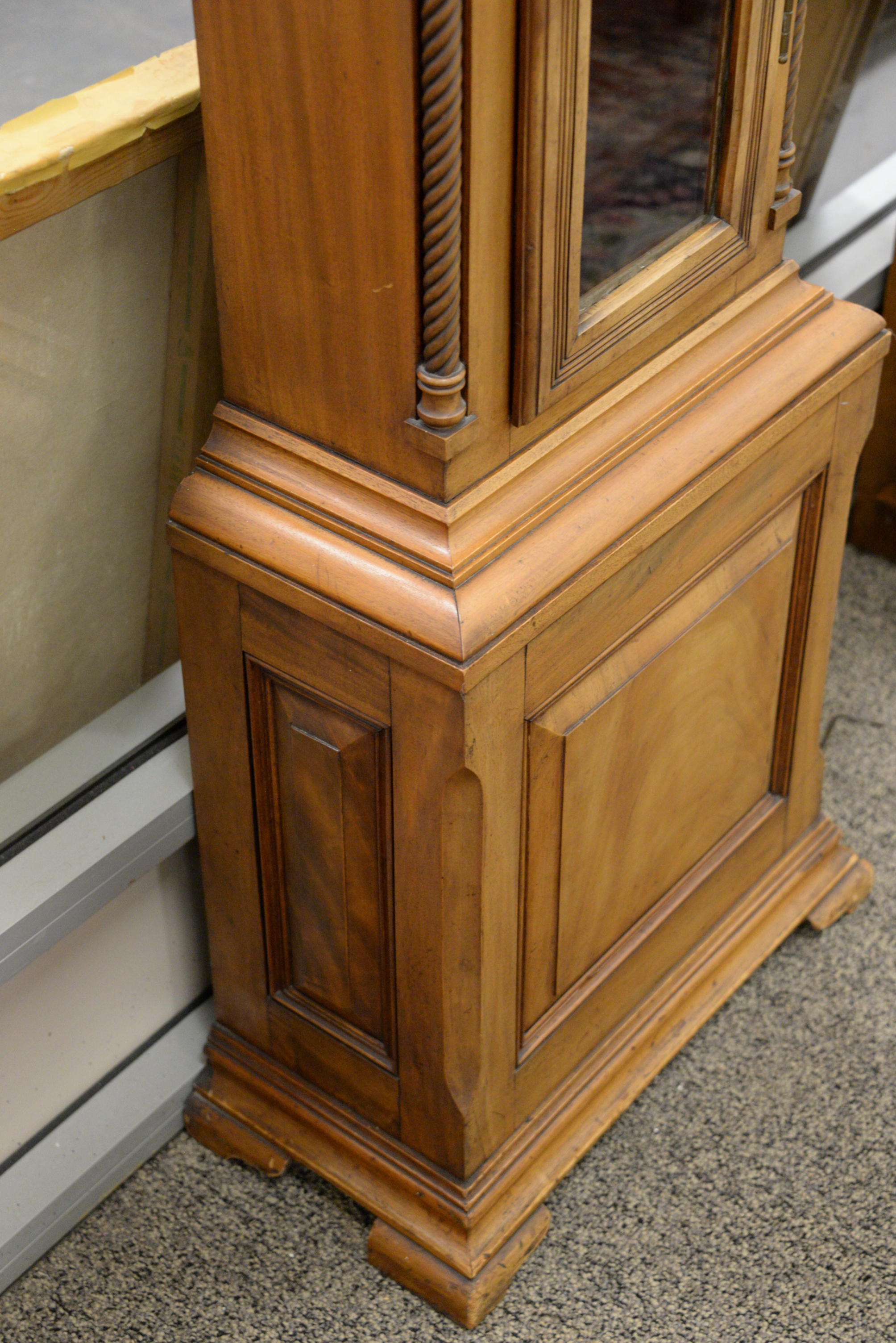 Mahogany Tall Case Clock, having broken arch top over tombstone dial over glass door, all flanked by spiral columns on plain base with ogee feet, brass and painted dial with rocking ship, works with ships, calendar and second hand, height 96 inches.