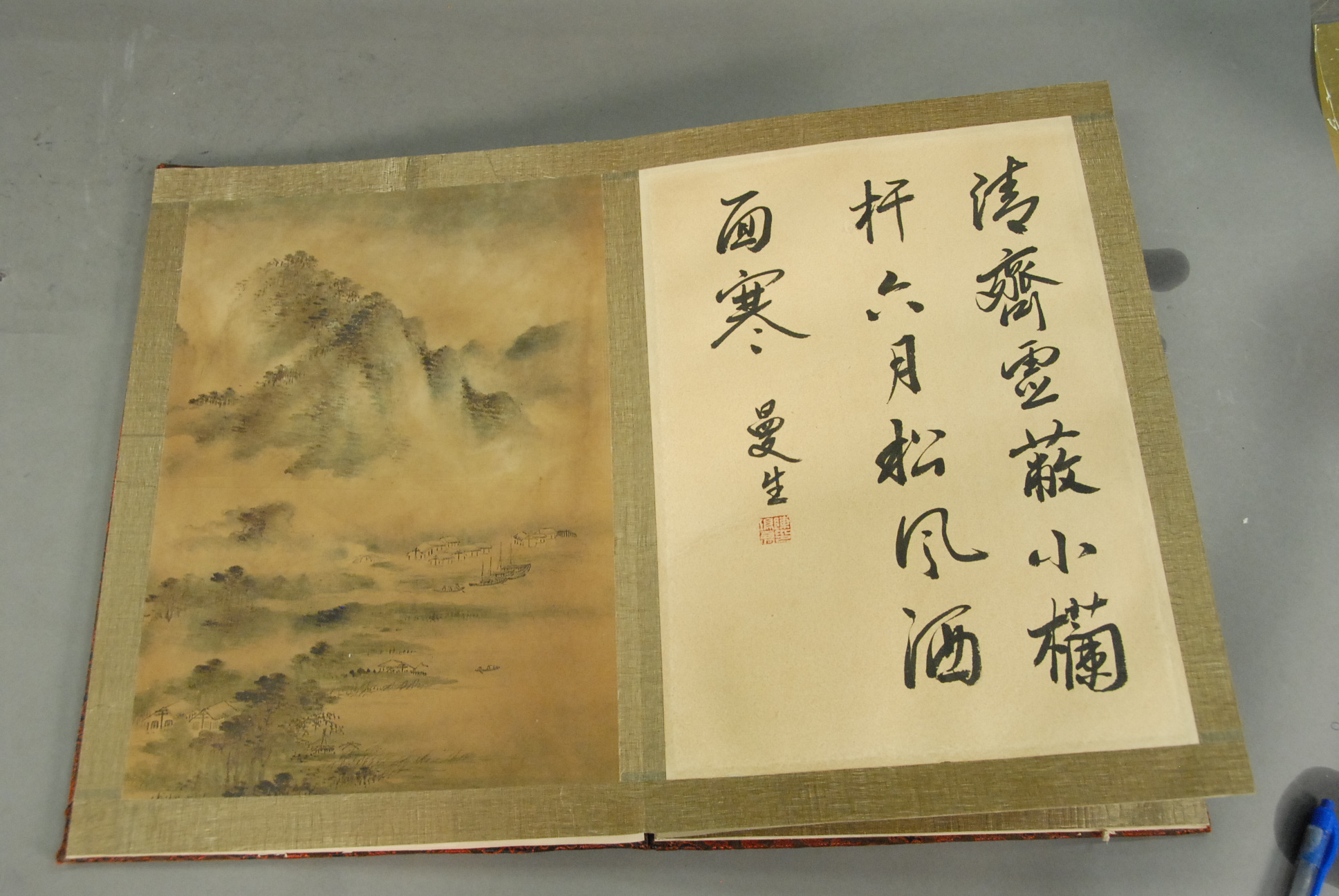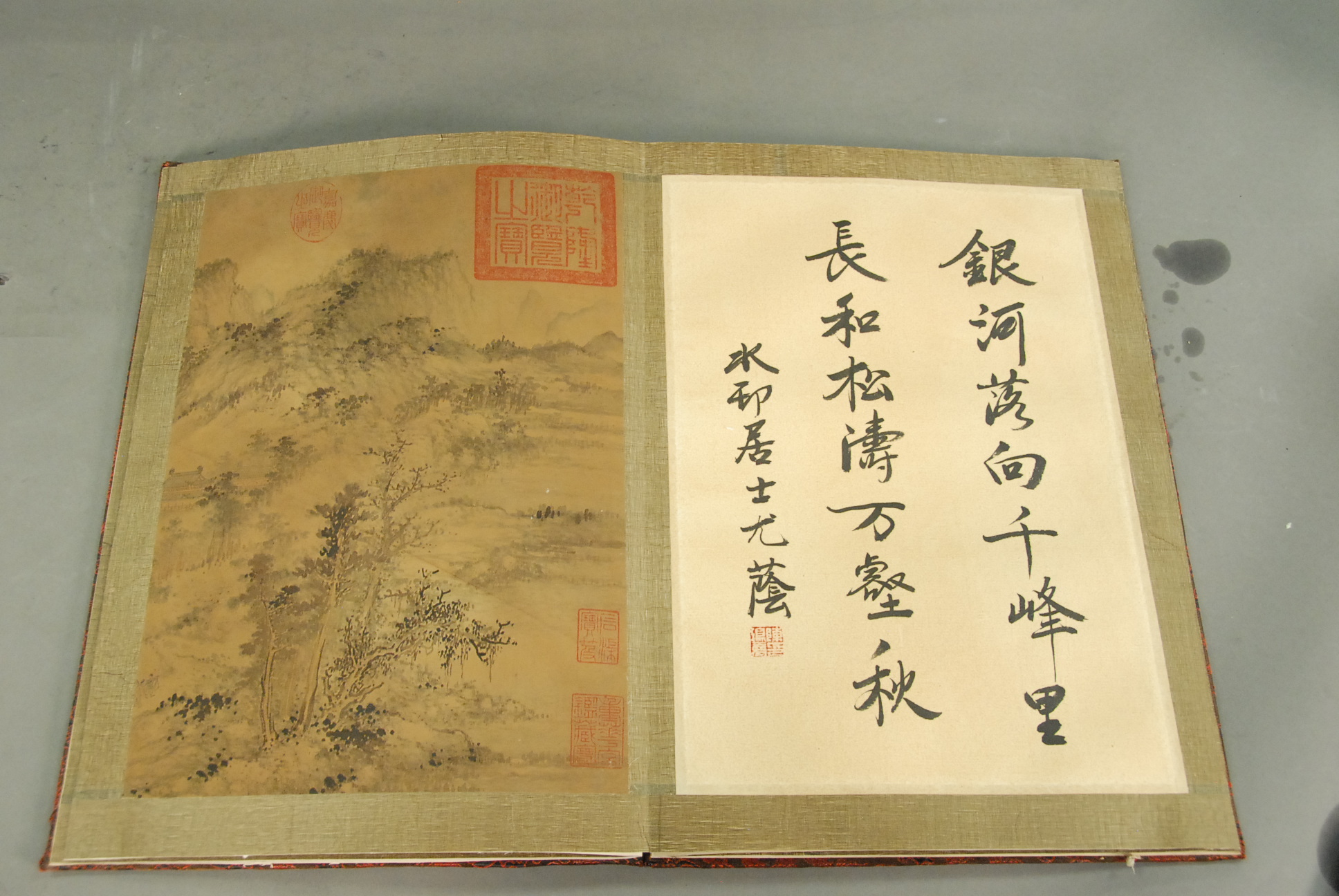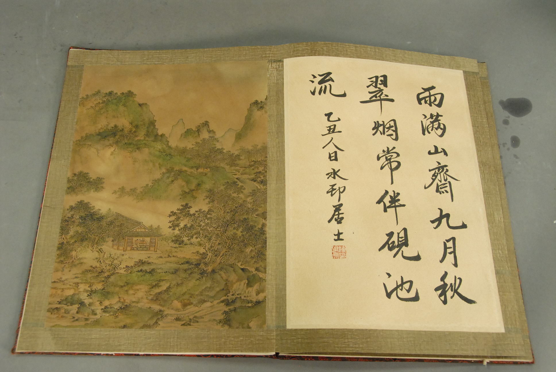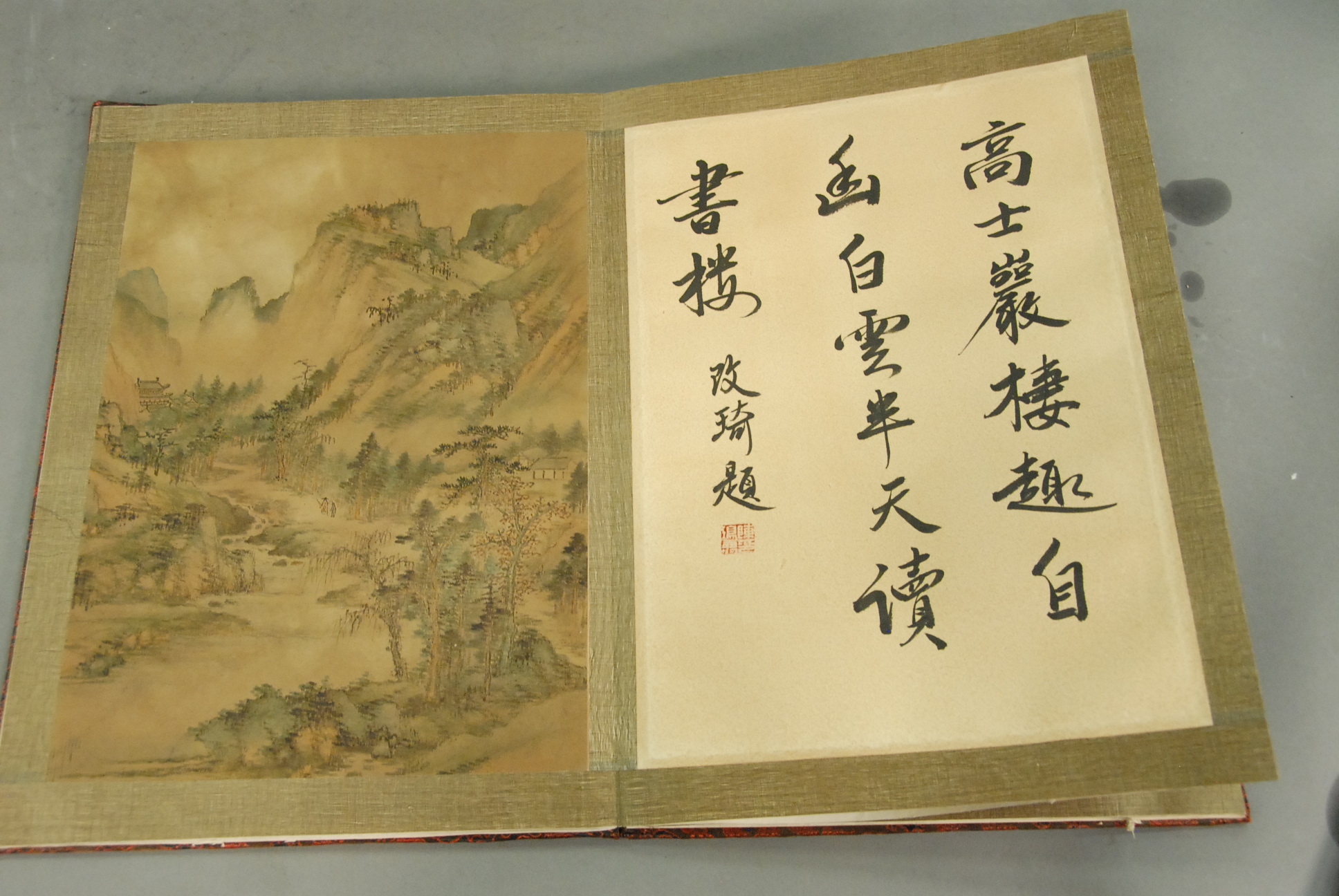 Oriental book with eight paintings on silk, landscapes.