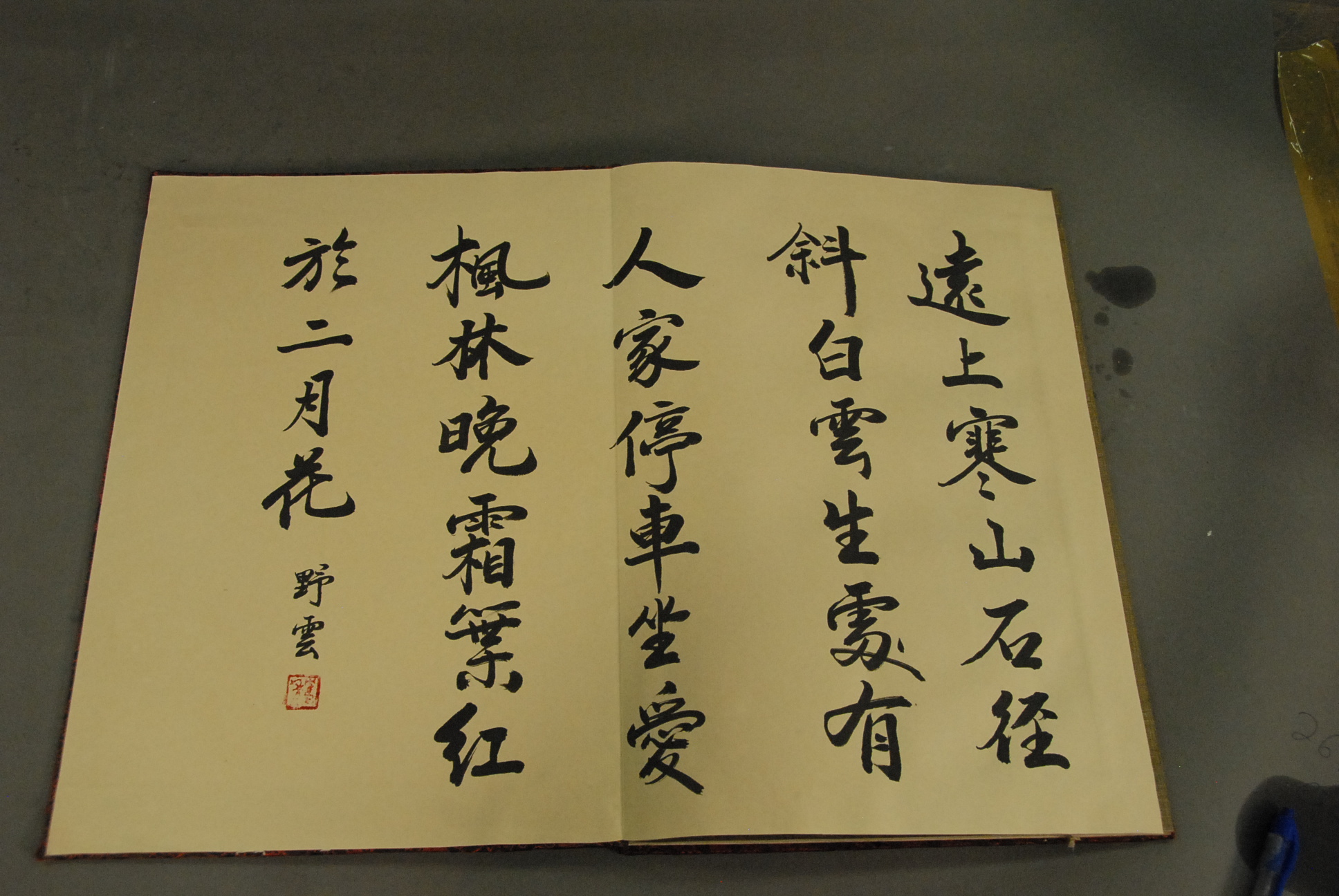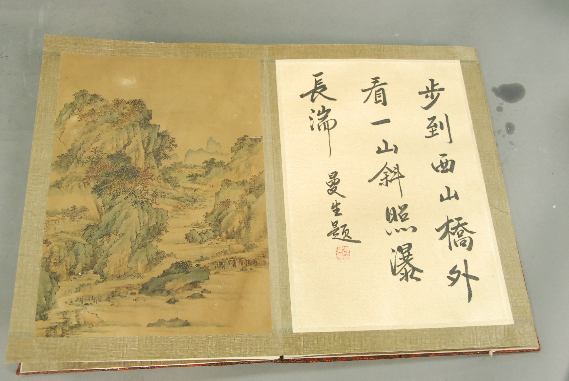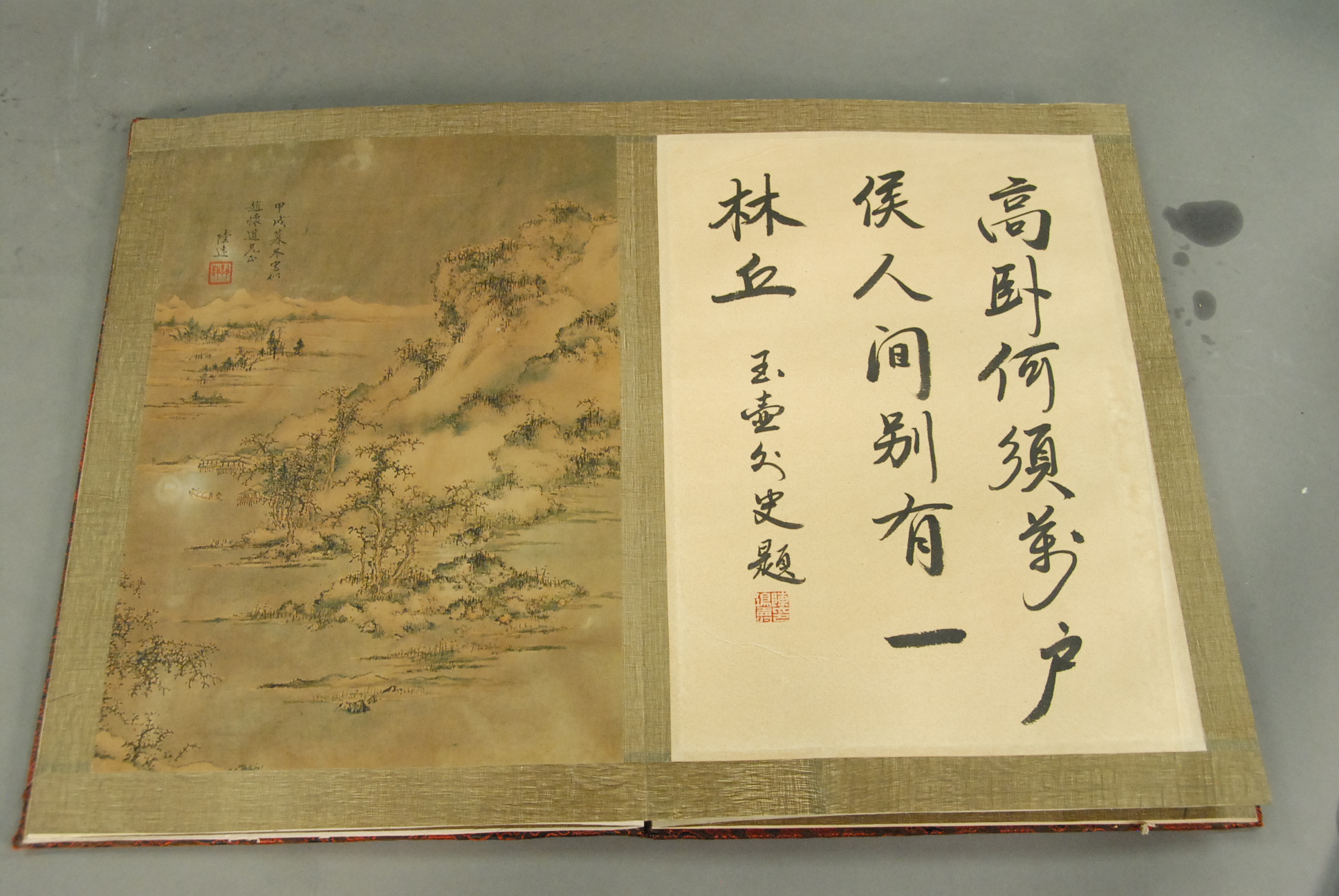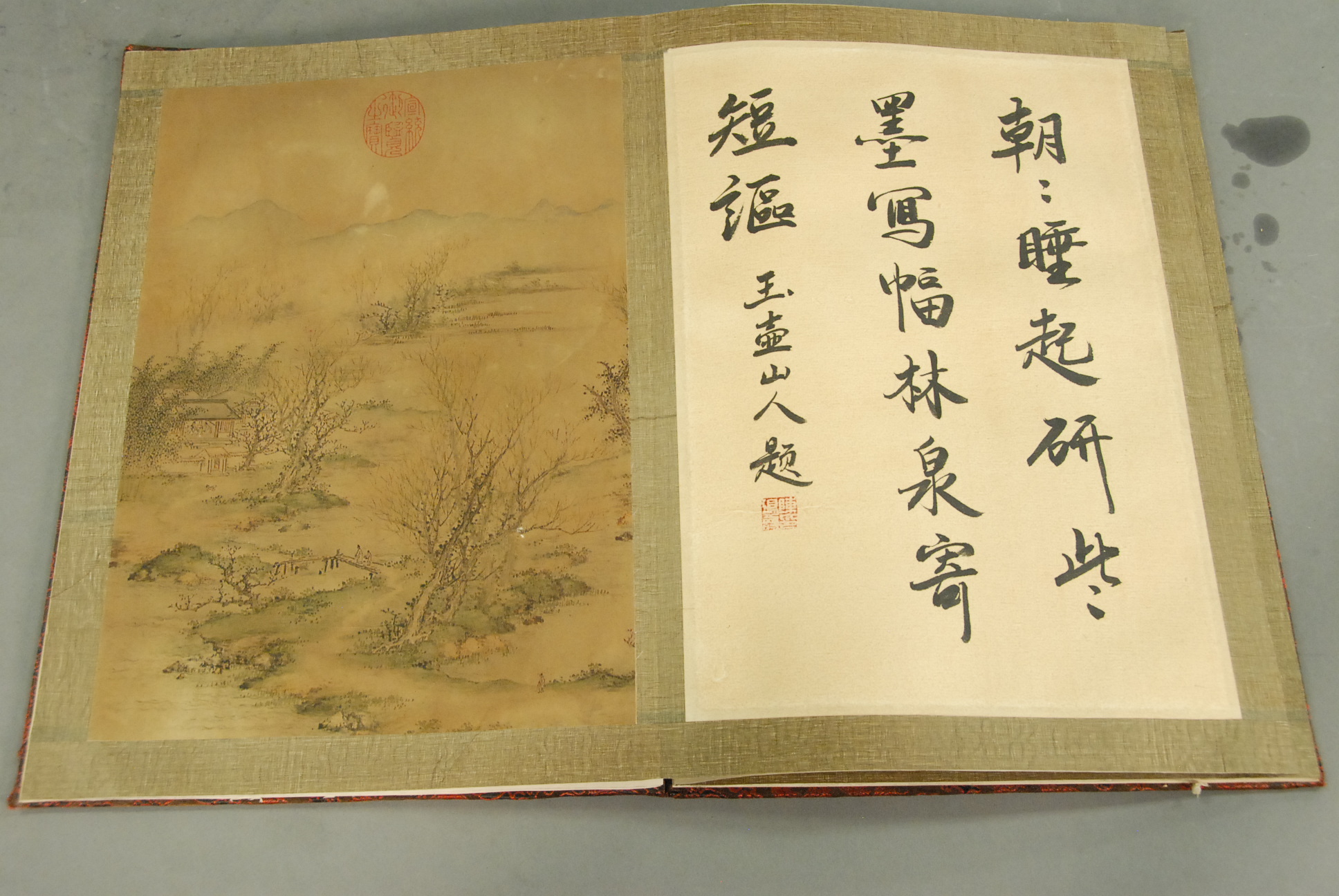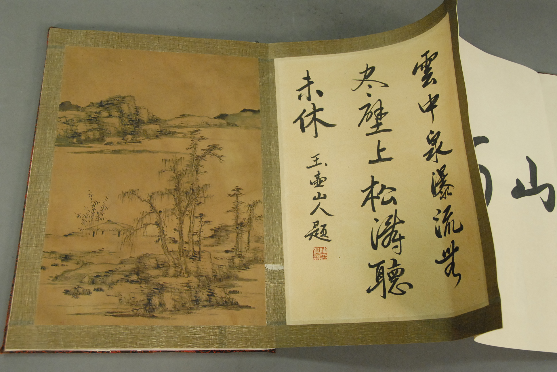 Oriental book with eight paintings on silk, landscapes.