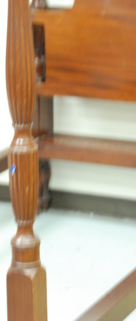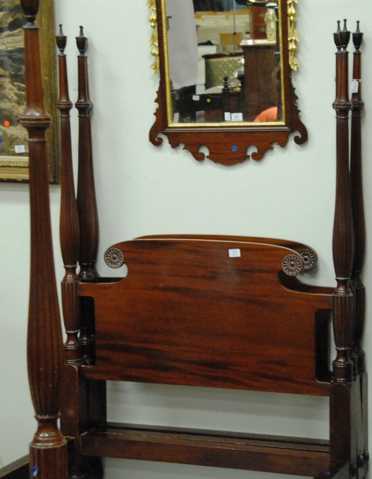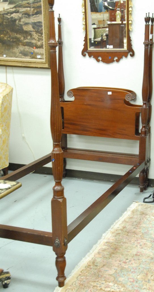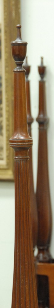 Pair of Margolis mahogany four post twin beds with tall fluted posts and urn finials, signed Margolis 1930. height 72in.