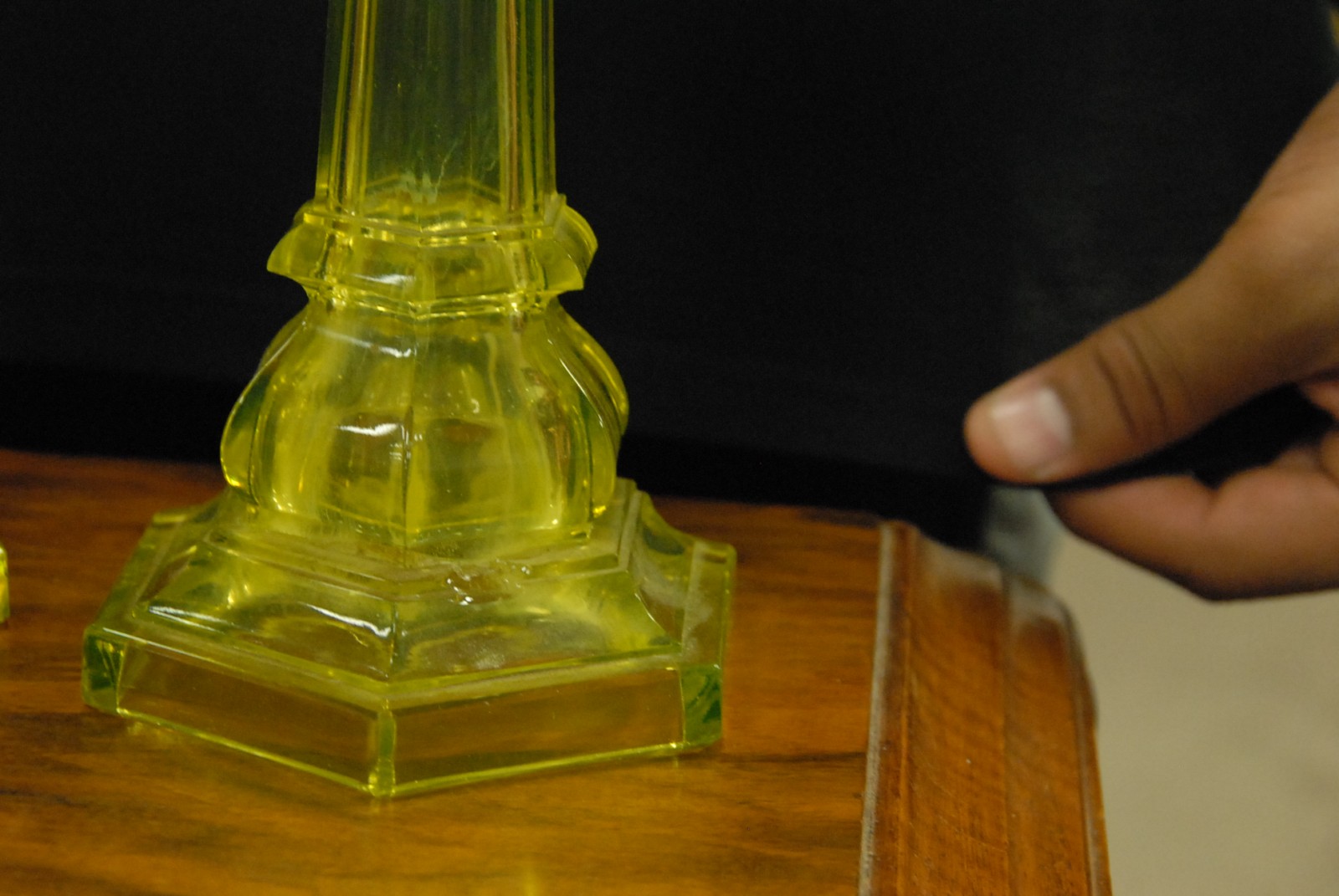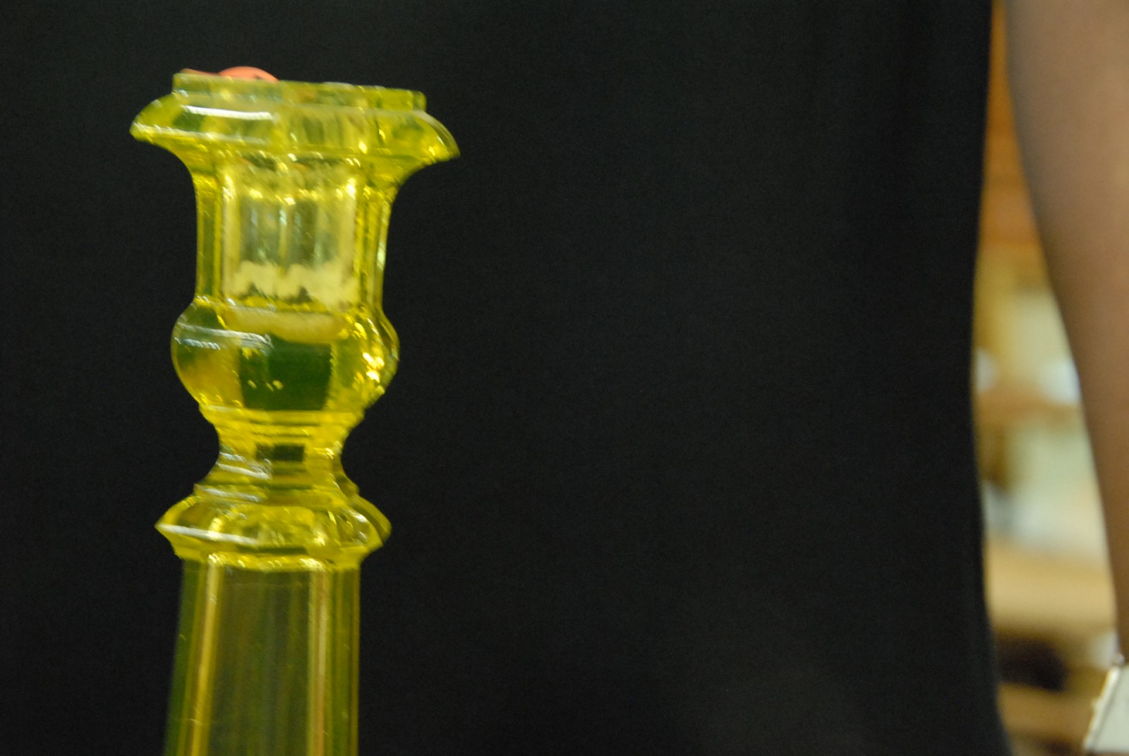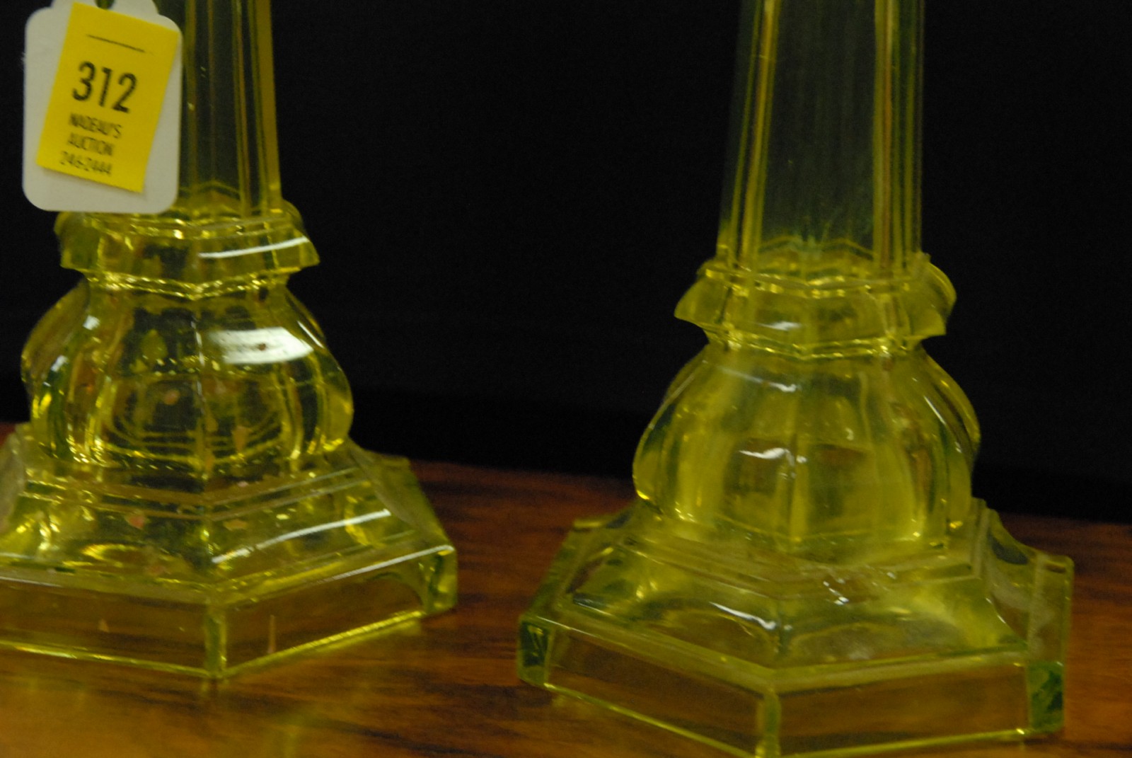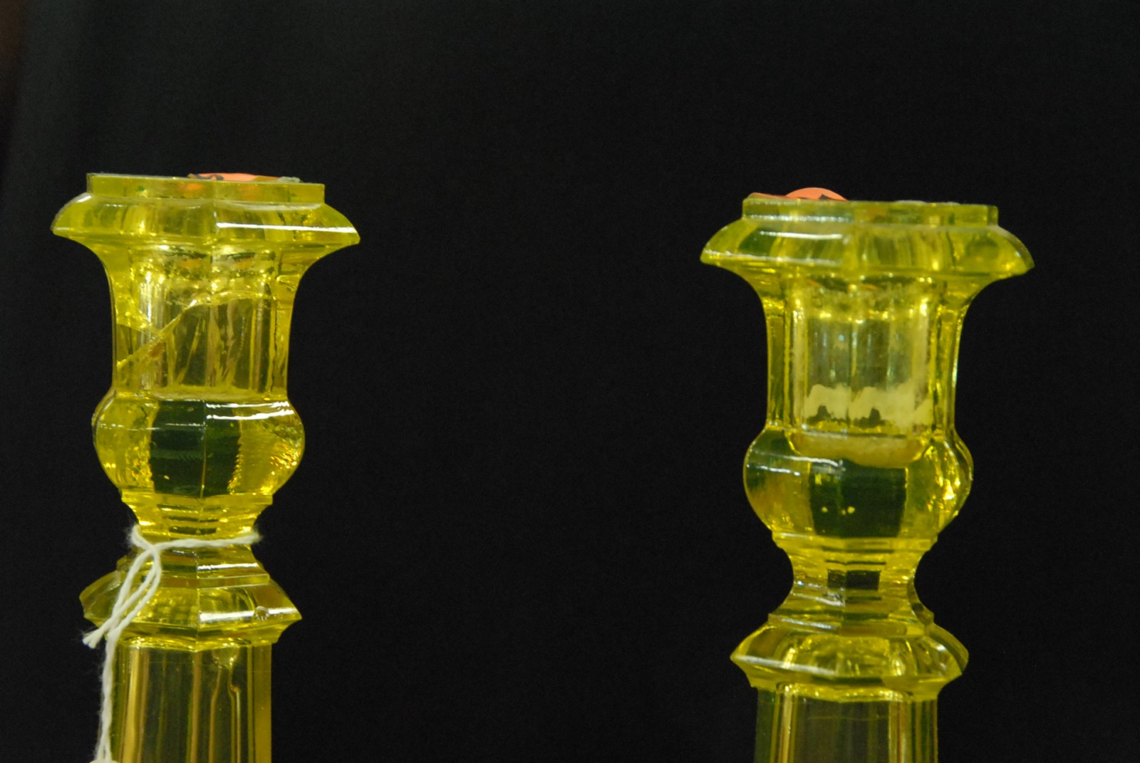 Pair of vaseline colored candlesticks, one with chip, one with crack