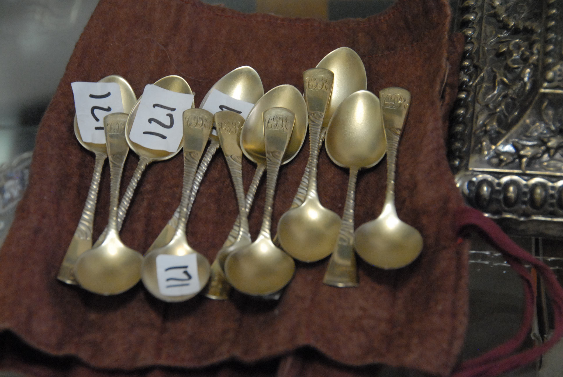 Set of twelve small silver teaspoons and a silver plated candlestick.