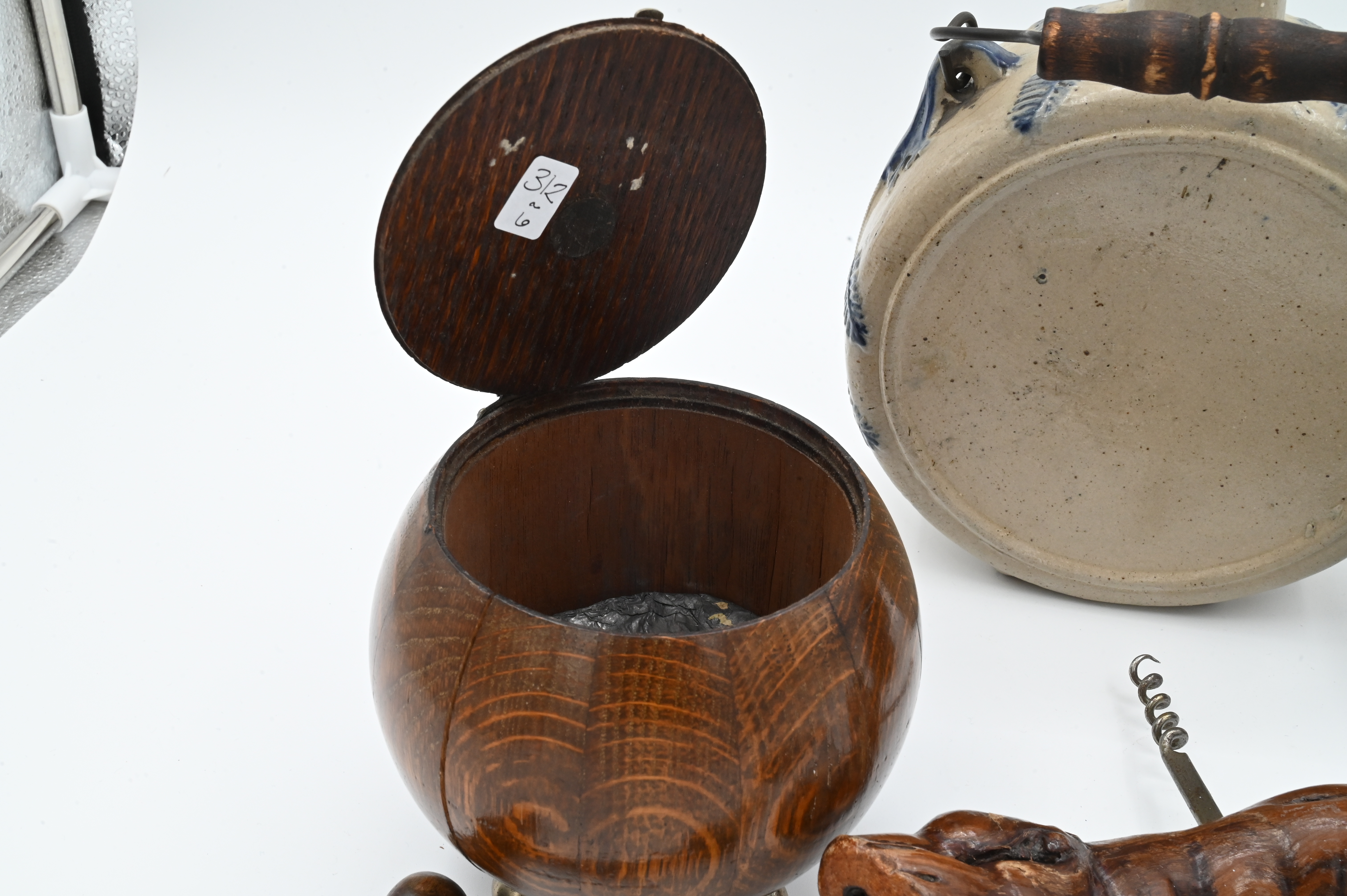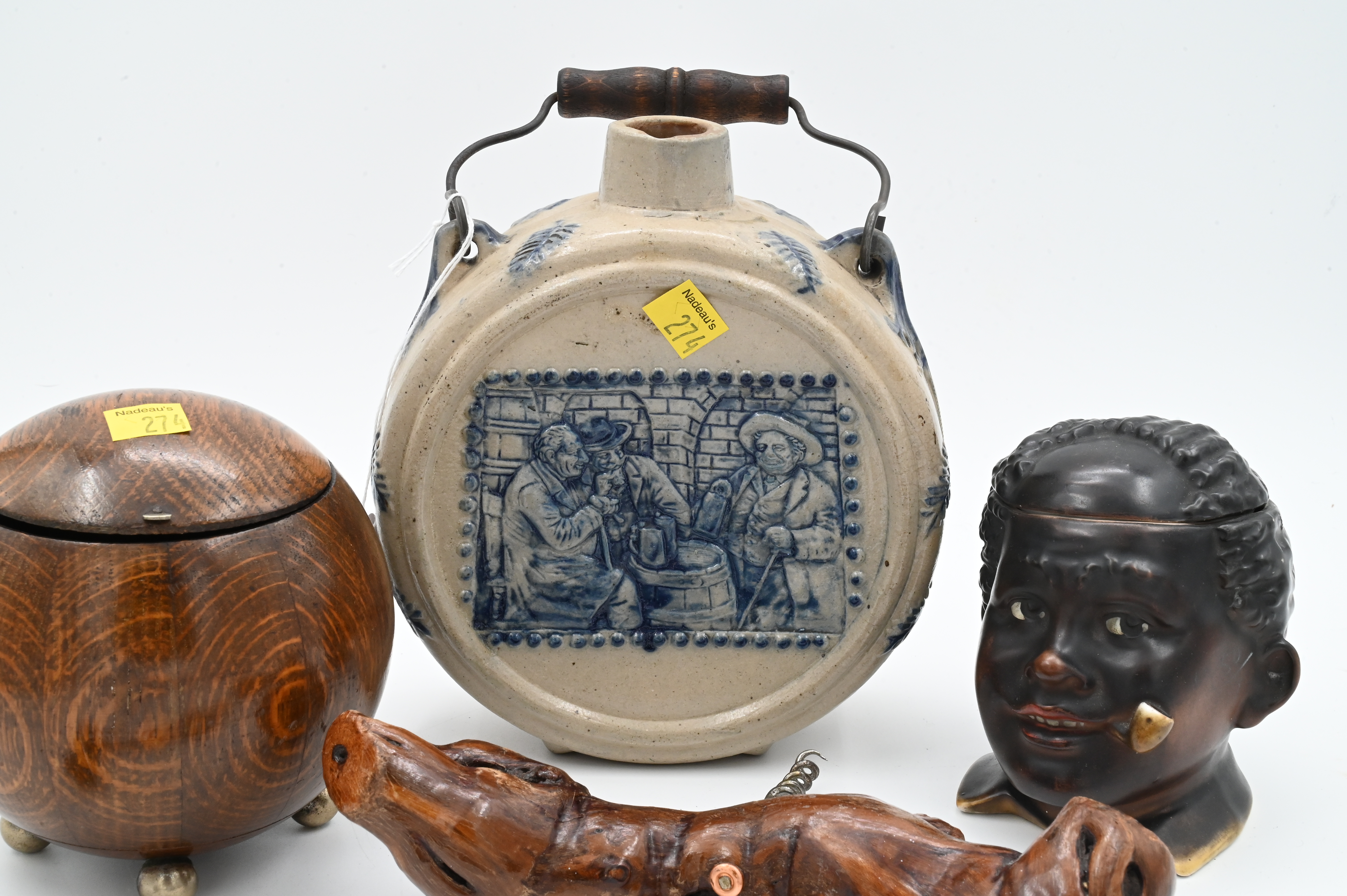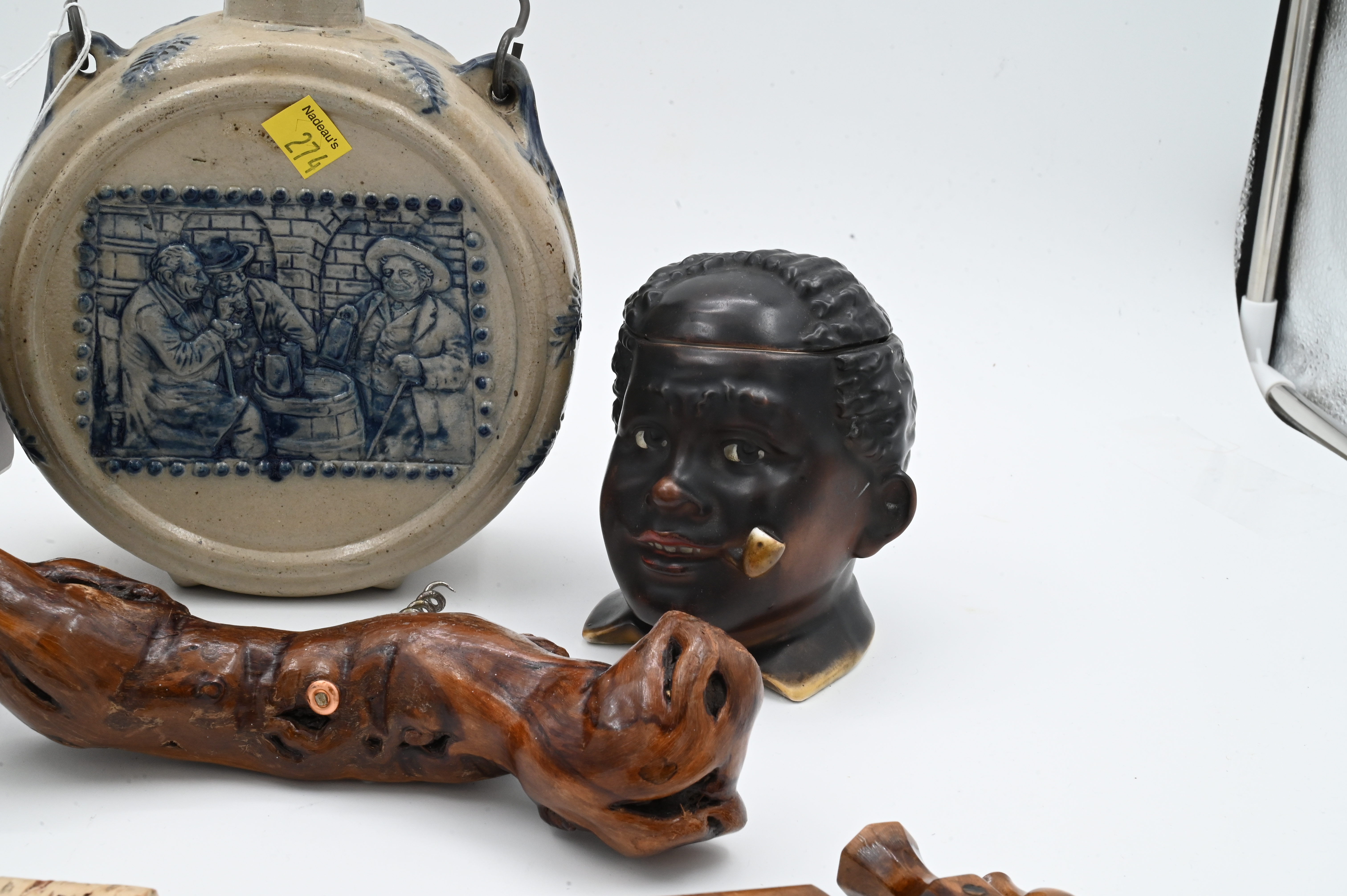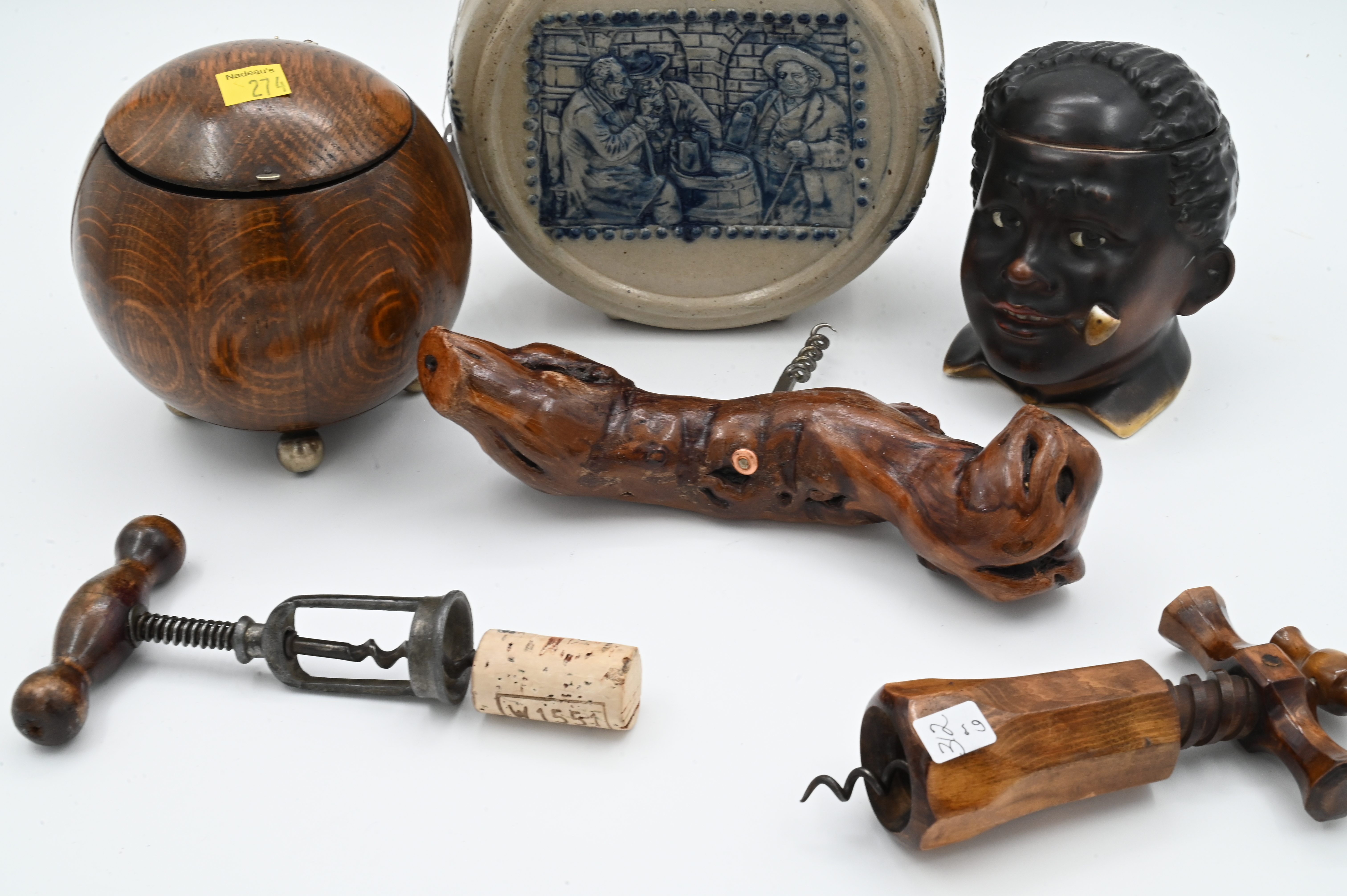 to include Black Americana humidor of a smoking pipe, spherical wooden humidor/tobacco jar having hinged lid and set on three metal ball feet, along with three carved wooden corkscrews, and White’s Utica stoneware canteen in Texas style having relief of group of men sitting around a barrel