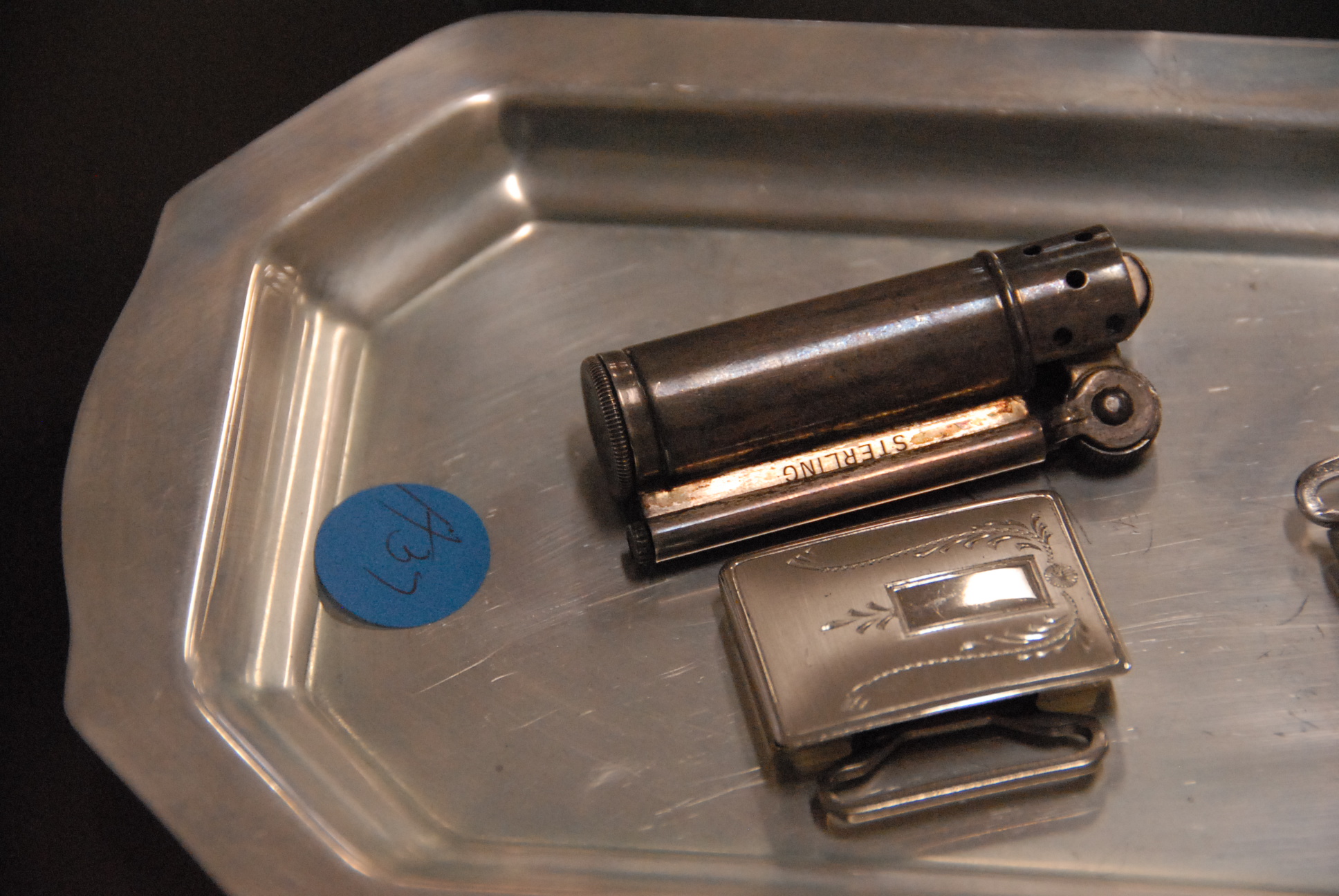 Sterling silver lot to include two buckles, sterling cigarette lighter, and a small tray