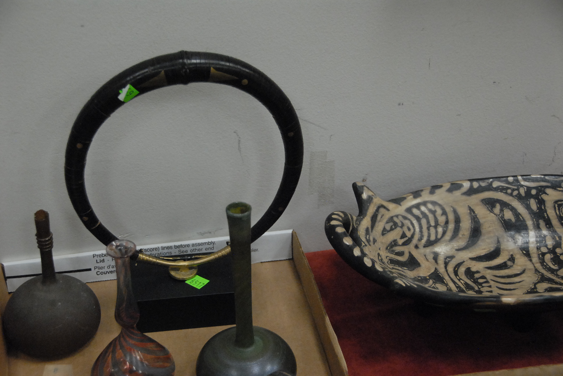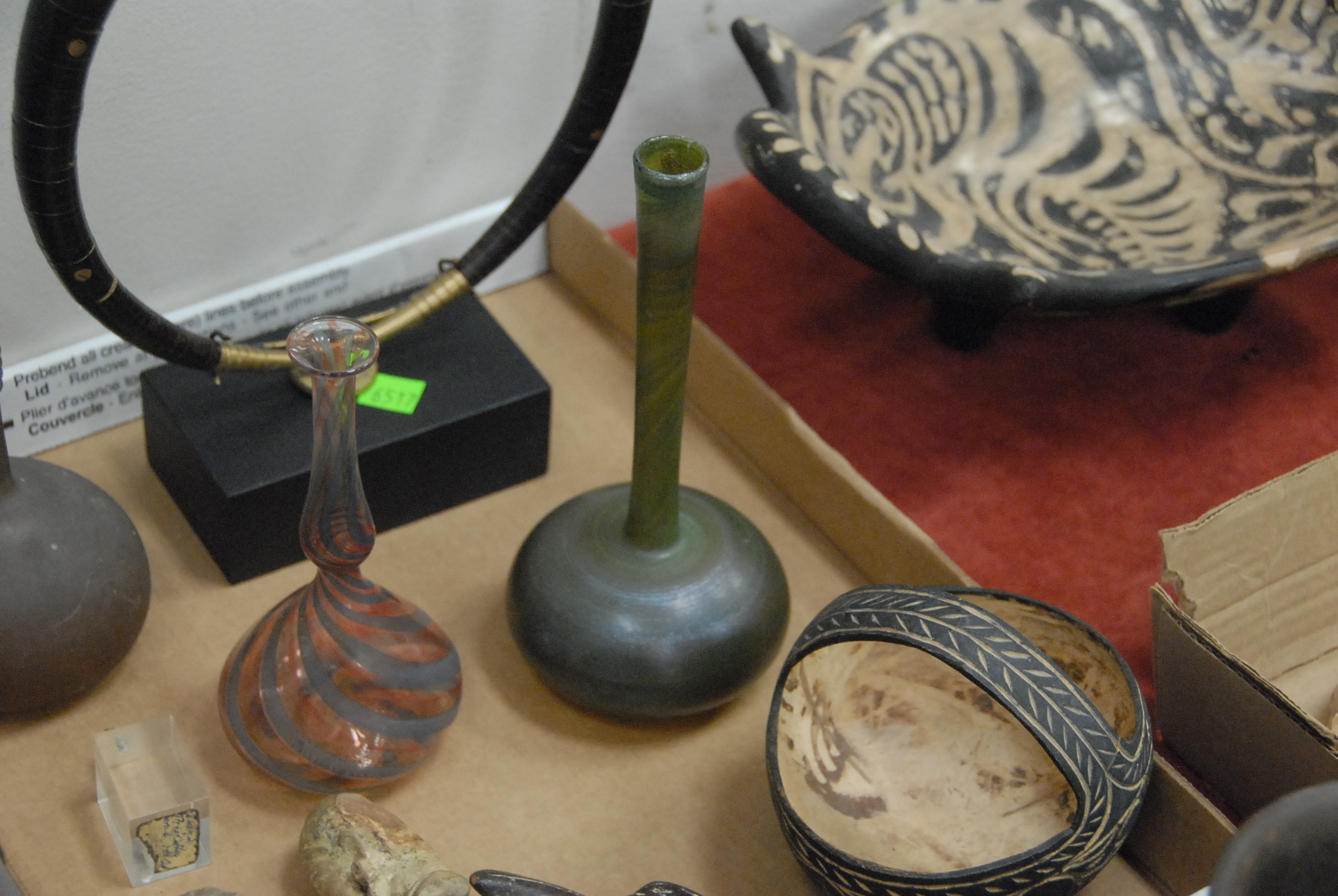 Three box lots with archaic carved heads on stands, mortar and pestal, carved wood and brass necklace, three early blown bottles, stone Eskimo sculpture etc.