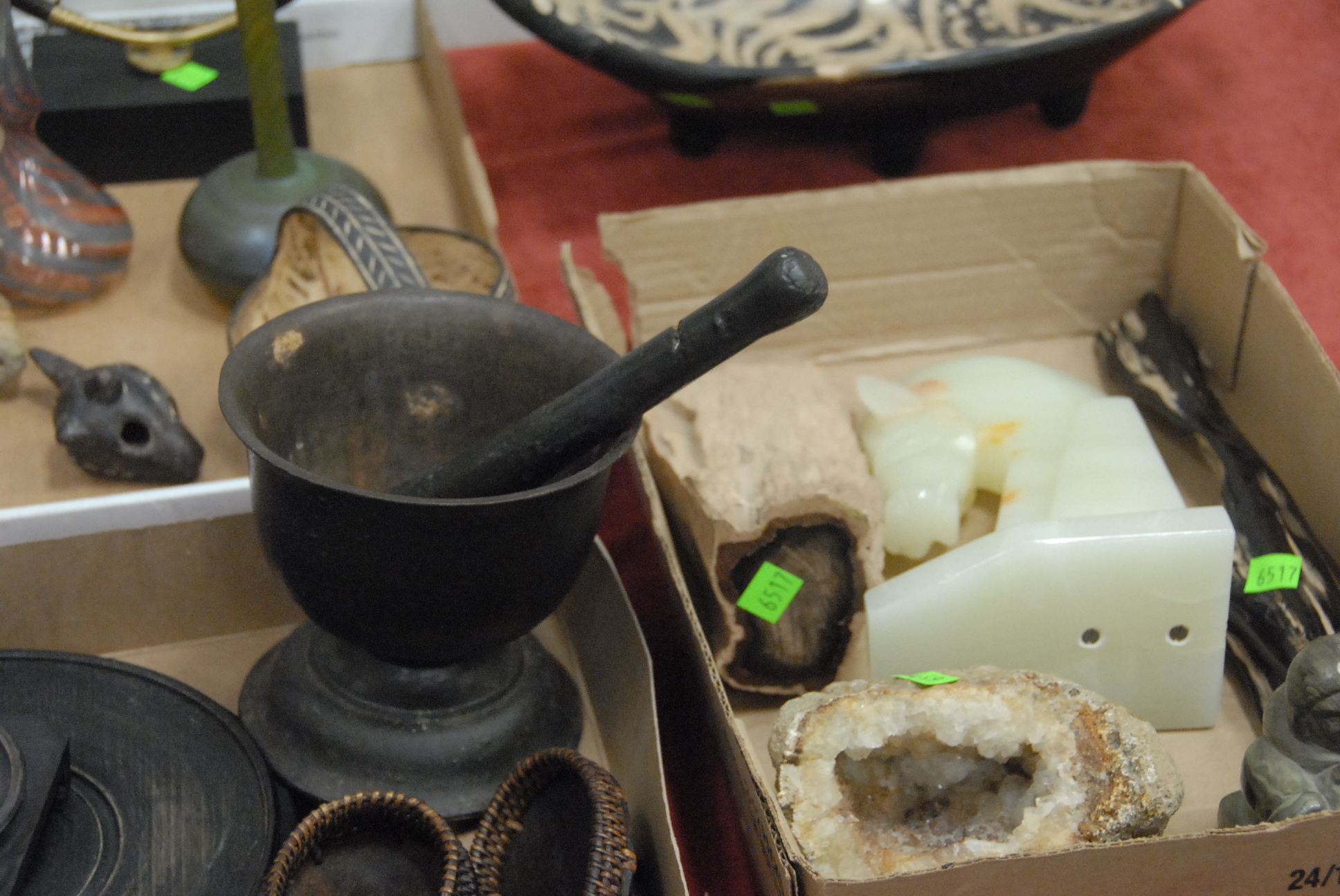 Lot 312: Three box lots with archaic carved heads on stands, mortar and pestal, carved wood and brass necklace, three early blown bottles, st…
