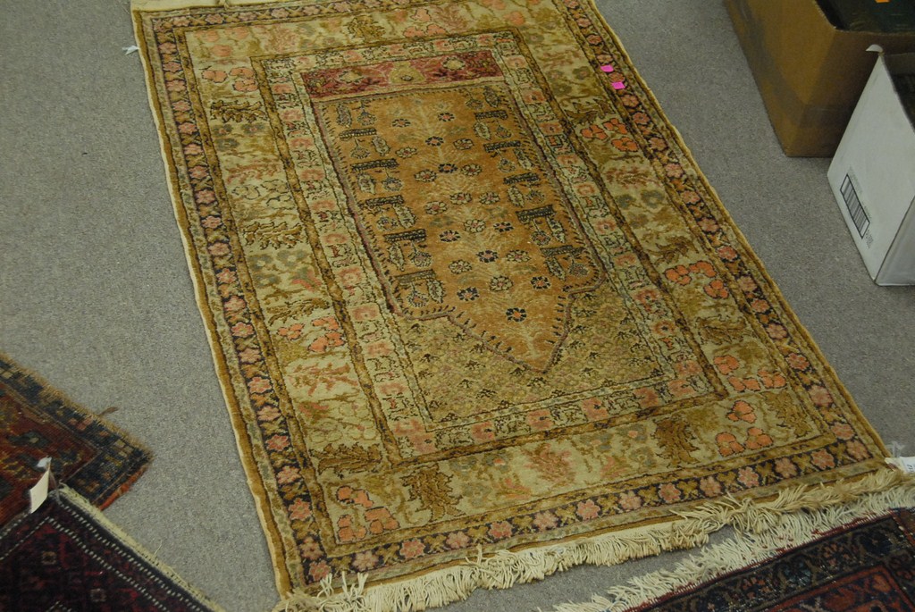 Lot 312: Three Oriental rugs cotton Oriental rug 2’9 x 3’11, small Oriental rug 2′ x 3’5, and Chinese Oriental rug 2’11 x 4’10.