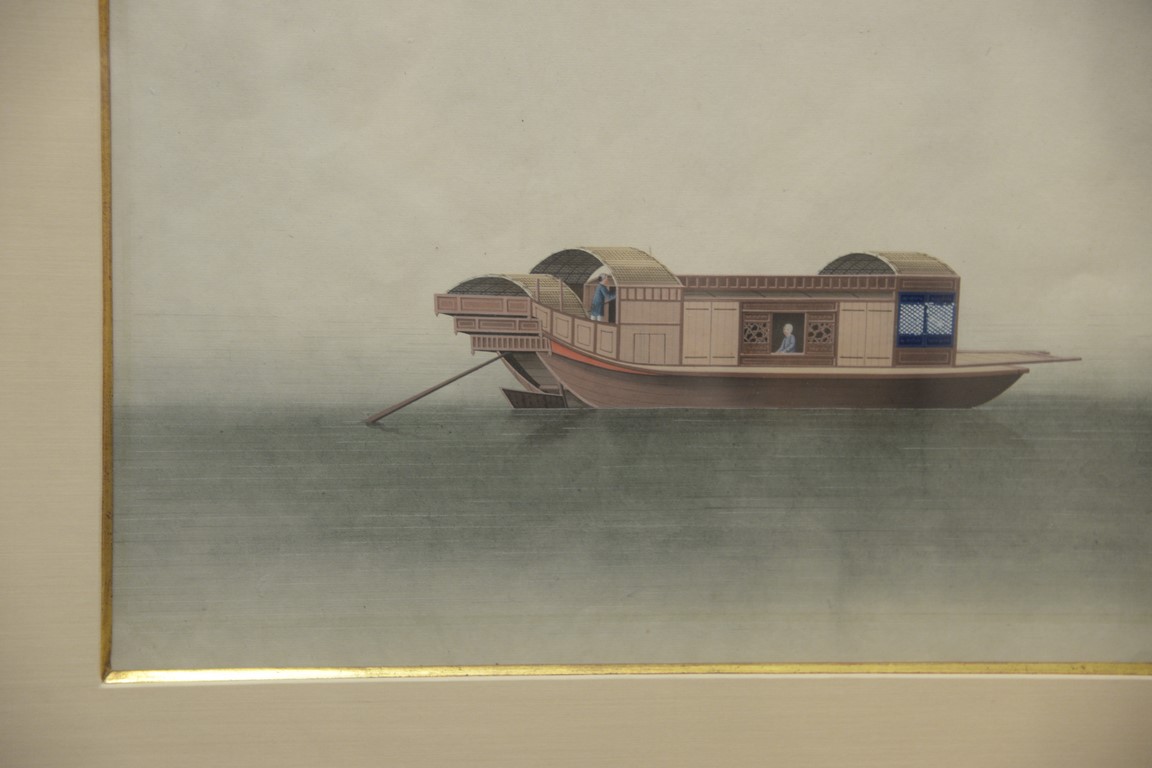 Lot 312: Tingqua Studio gouache on paper Chinese Export Painting of a Barge or Houseboat sight size 13 1/4 x 16 1/4 Provenance: From th…