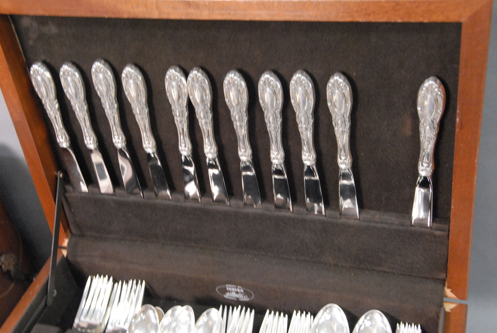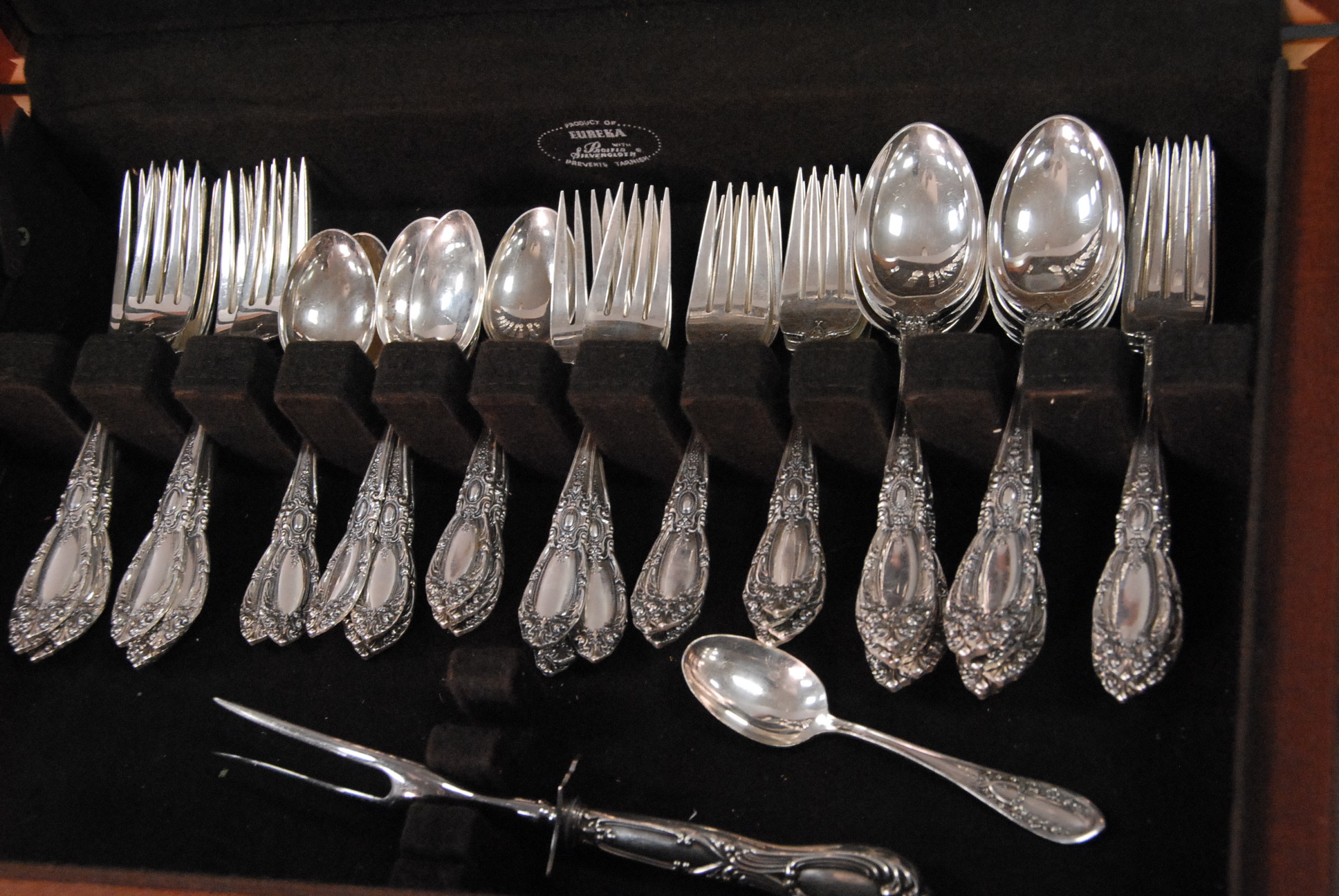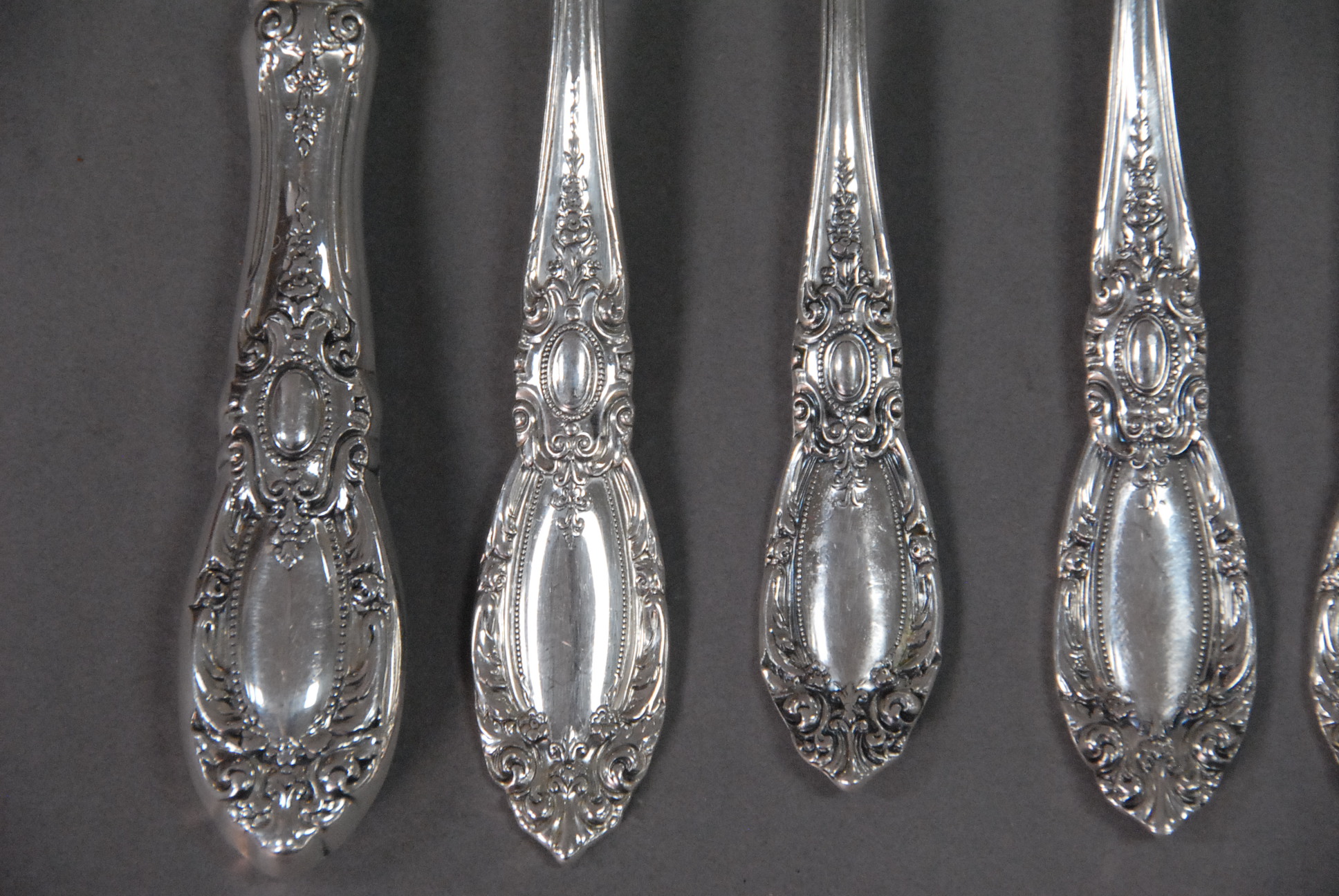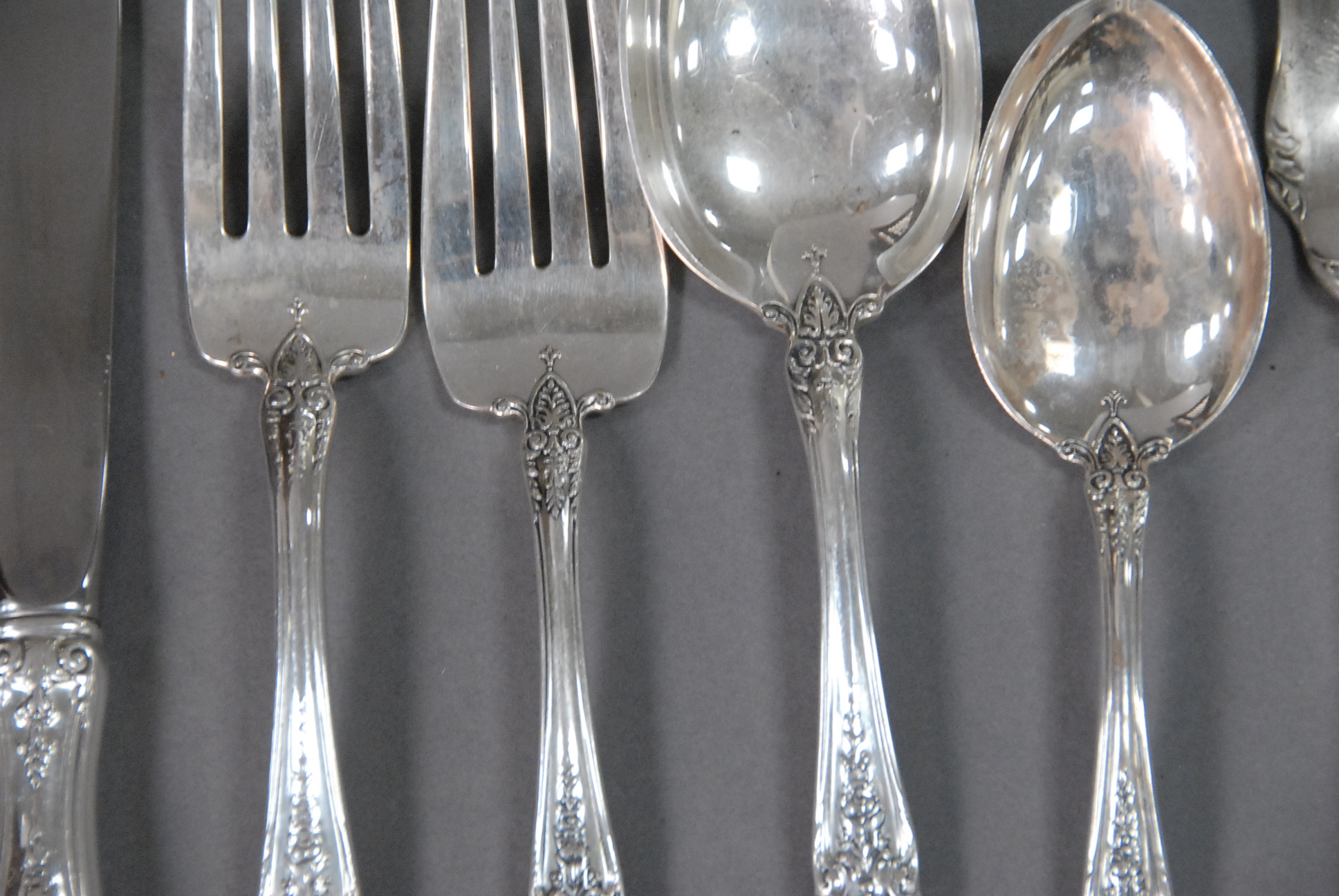 Towle sterling silver flatware setting for 12, including 12 dinner forks, 12 dinner knives, 12 luncheon forks, 12 tablespoons, 12 teaspoons, 12 tablespoons, 87 troy oz. weighable plus 12 handles.