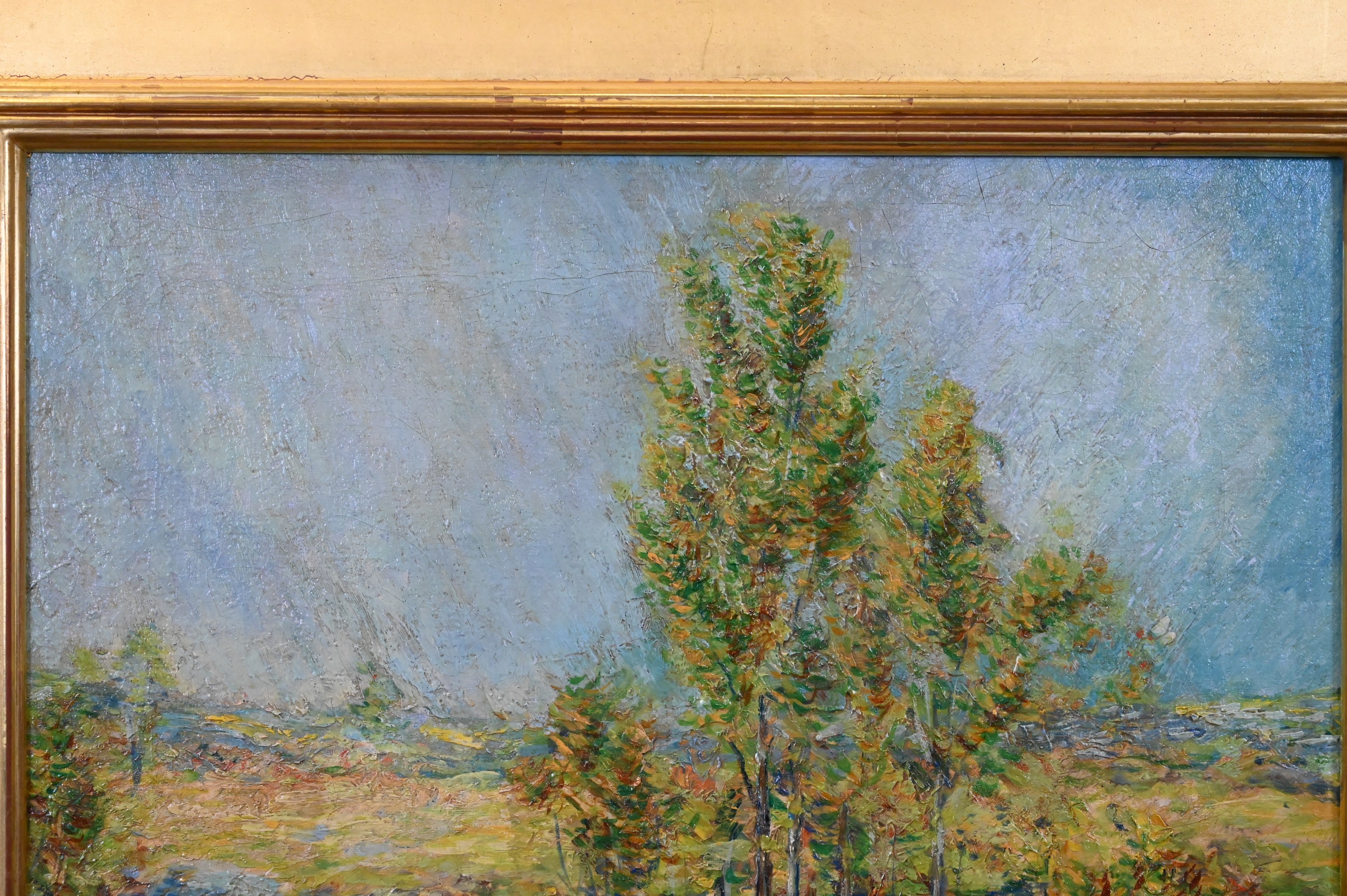Presents well. craquelure. Varnish with streaking, Some possible inpainted to lower left corner, looks to be inpainting to sky.