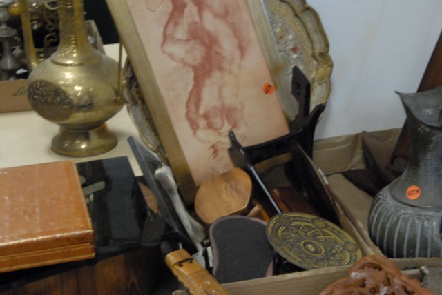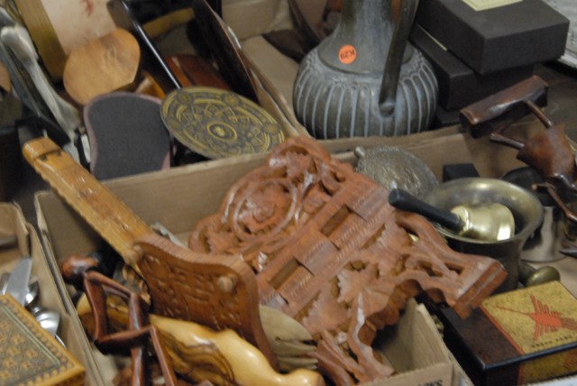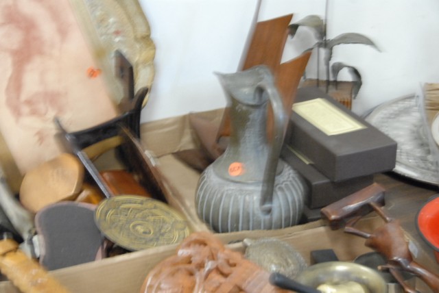 5 box lots to include stainless steel flatware, carved wooden decorations, wooden sailboat, brass mortar and pestle, various other pieces.