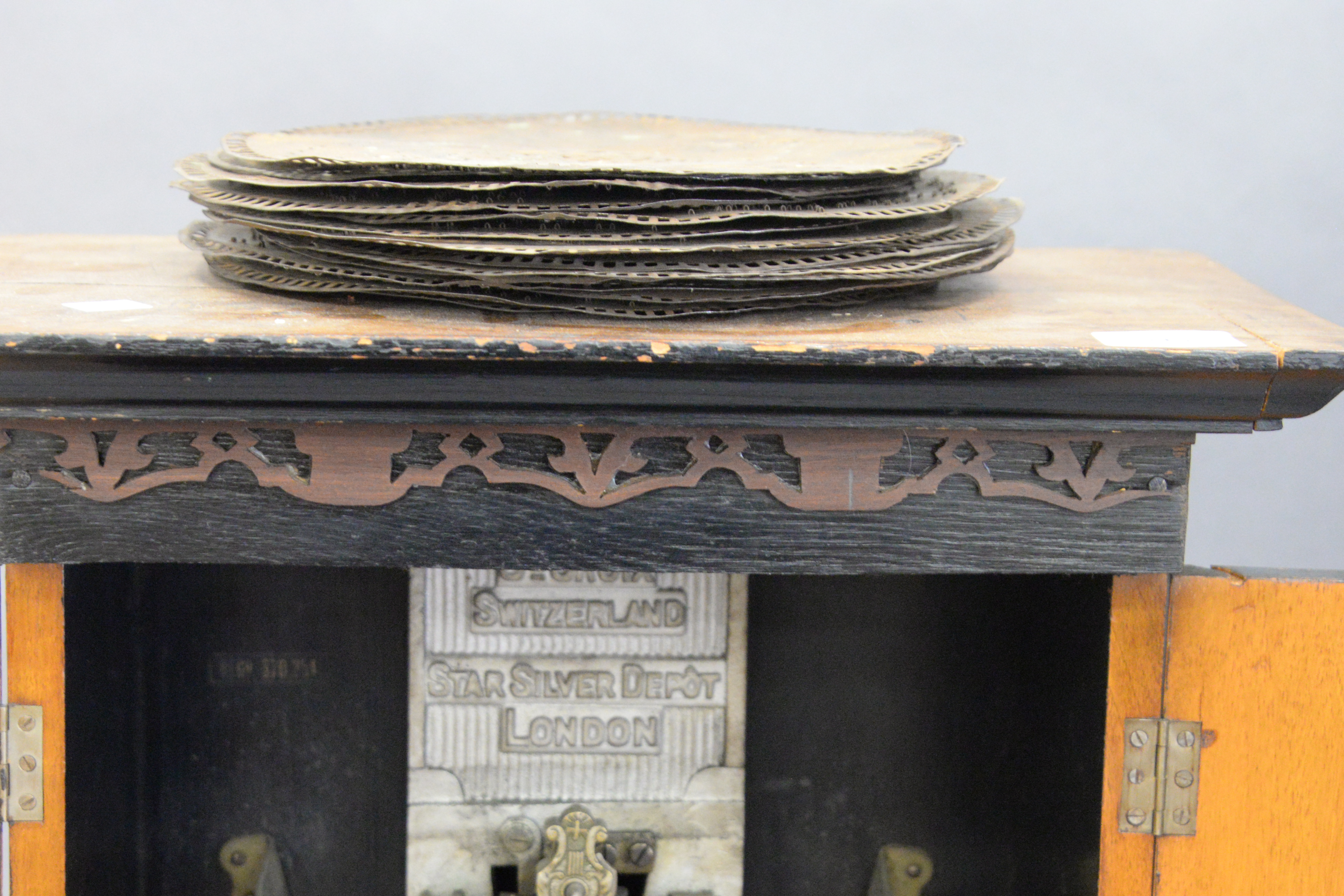 Britannia Swiss Upright Music Box, with ebonized interior along with 15, 9 inch disks, height 21 1/2 inches