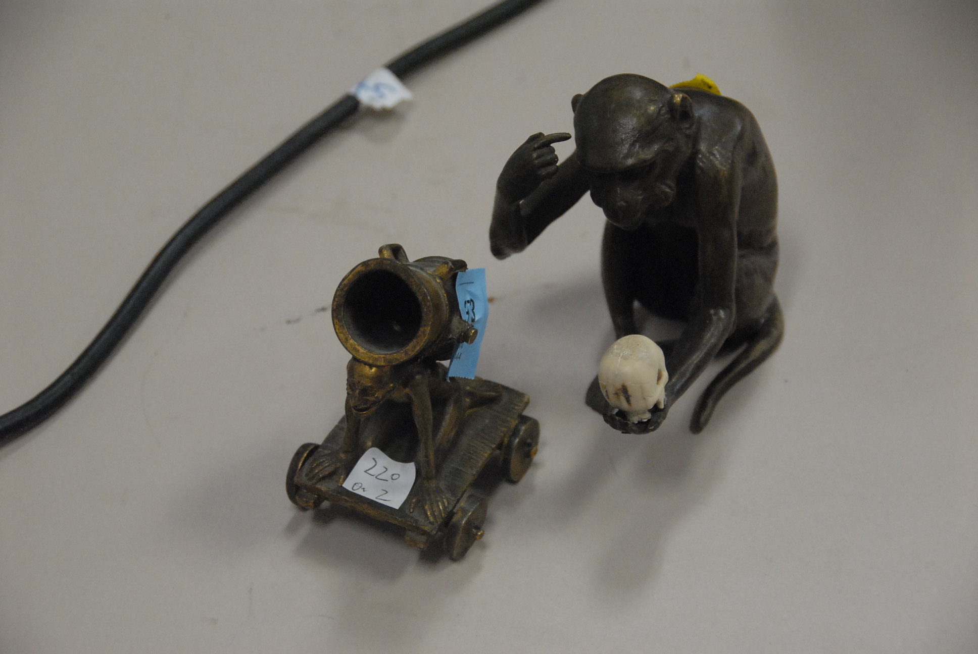 Bronze monkey with ivory skull and Napoleon I bronze mortar cannon, 4in. – 5in.
