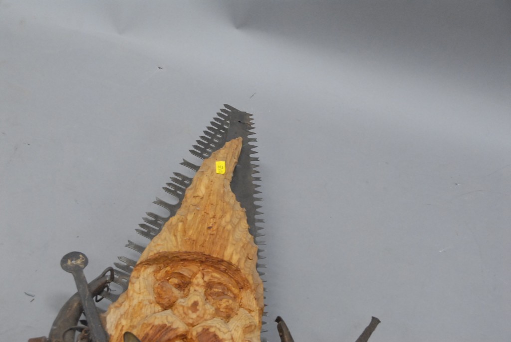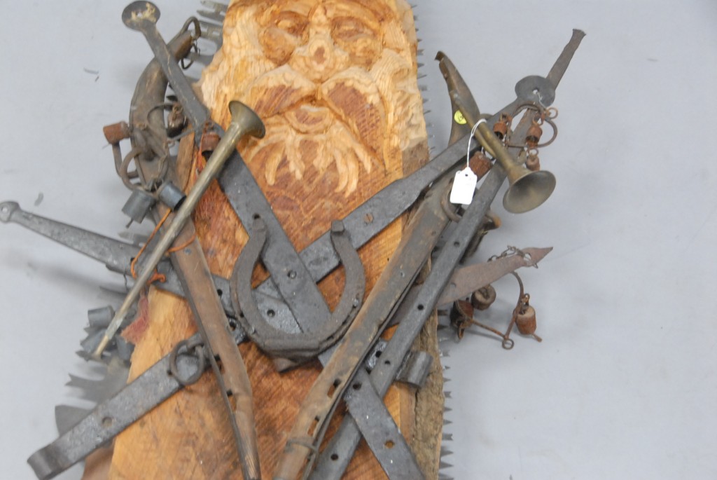 Carved wood with a collage of iron including saws, horseshoes, horns, etc.