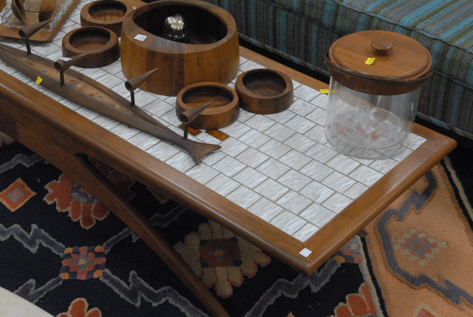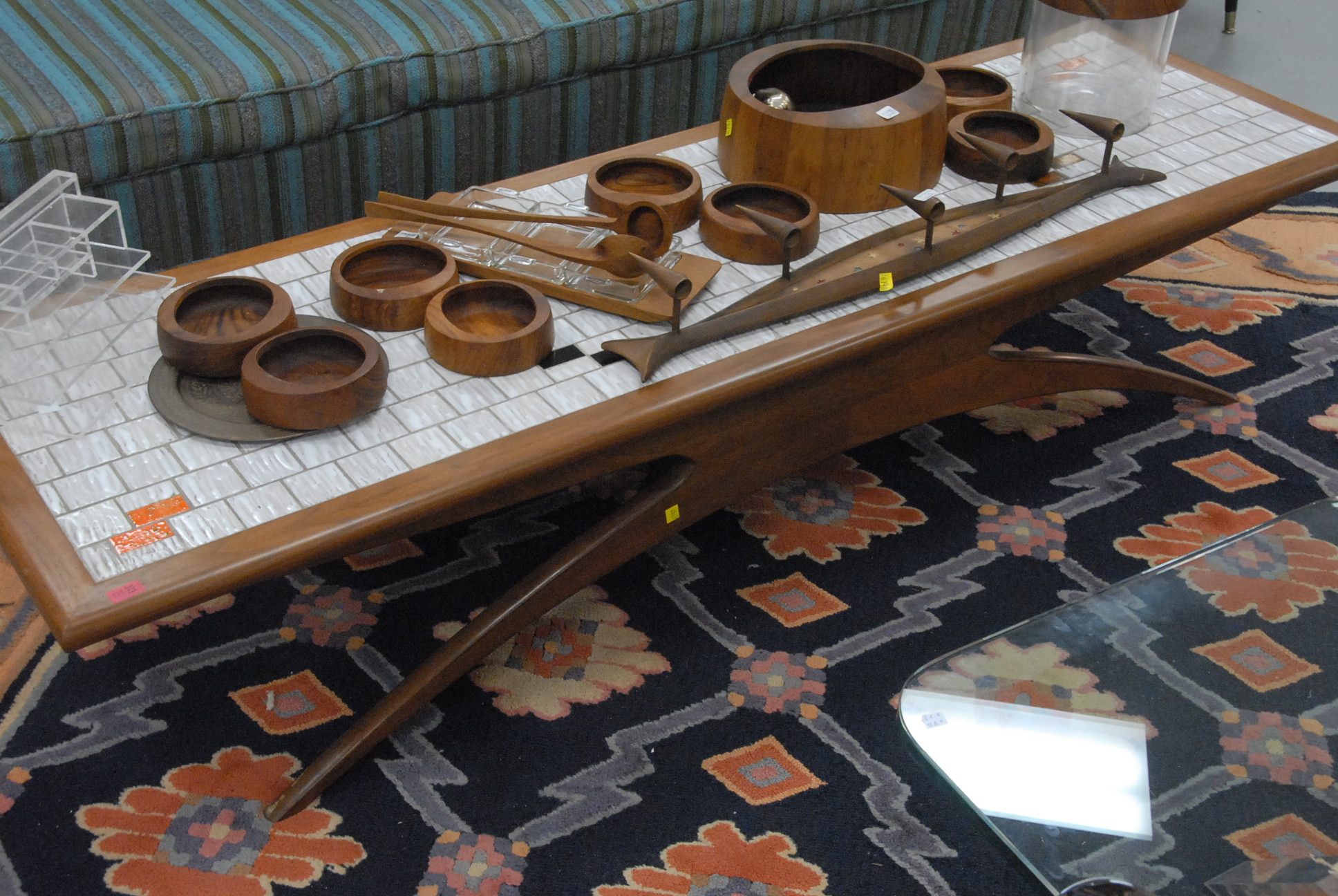 Lot 313: Custom made Vladimir Kagan style Mid-Century Modern walnut coffee table with a white tile inset top manufactured by Model Decorators…