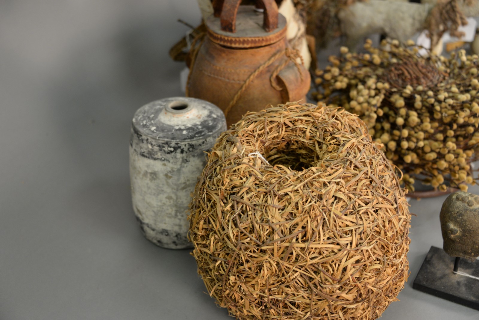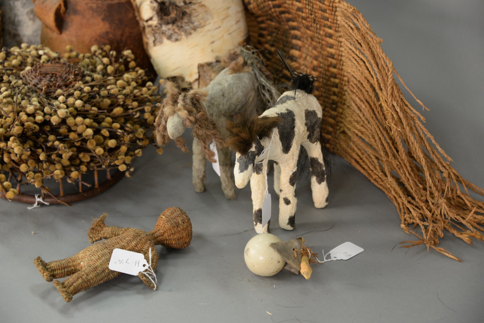 Lot 313: Eleven piece lot including African woven doll, wood lidded vessel, white birch bark carrier, etc. doll: ht. 7 1/2 in.