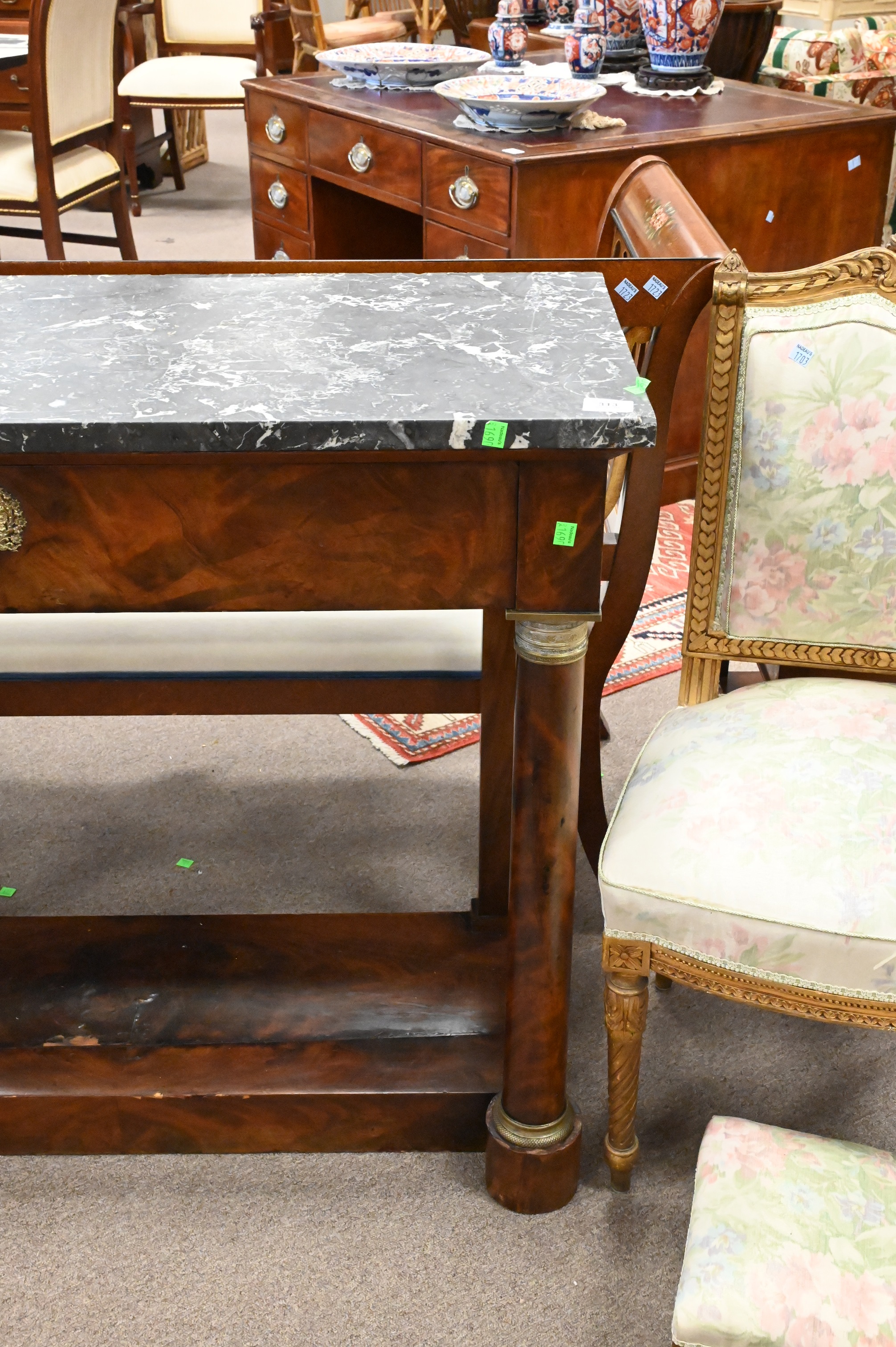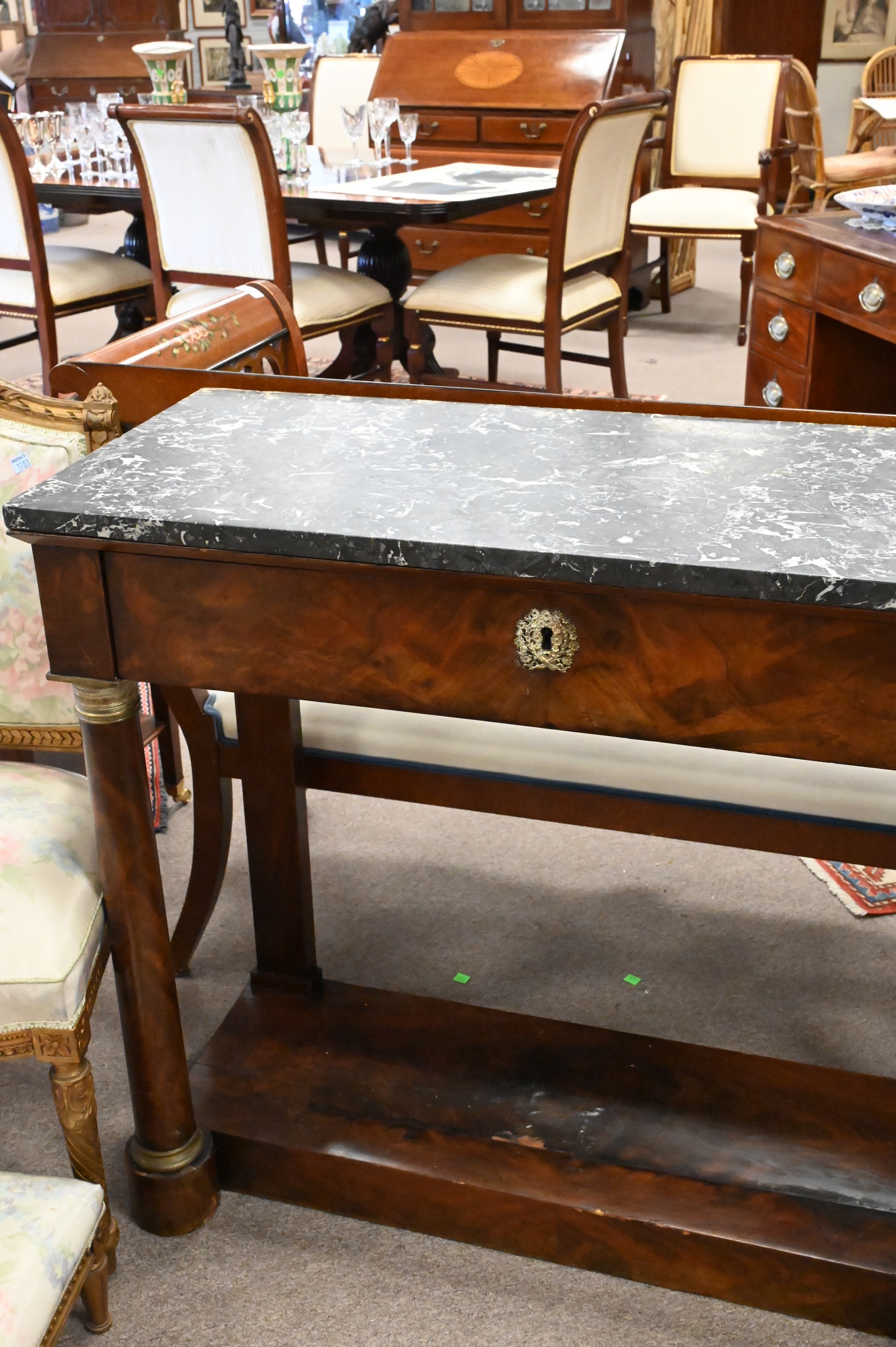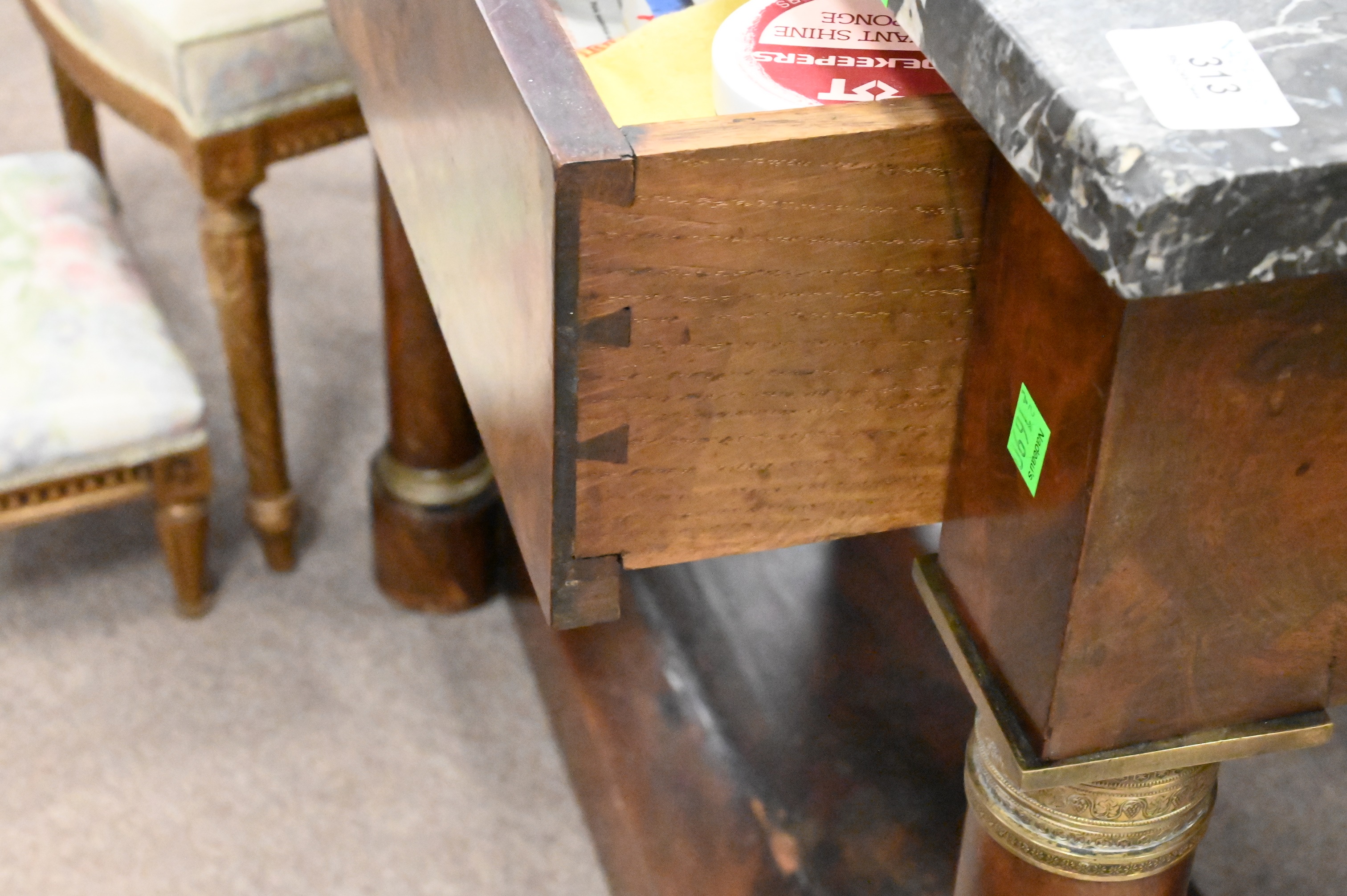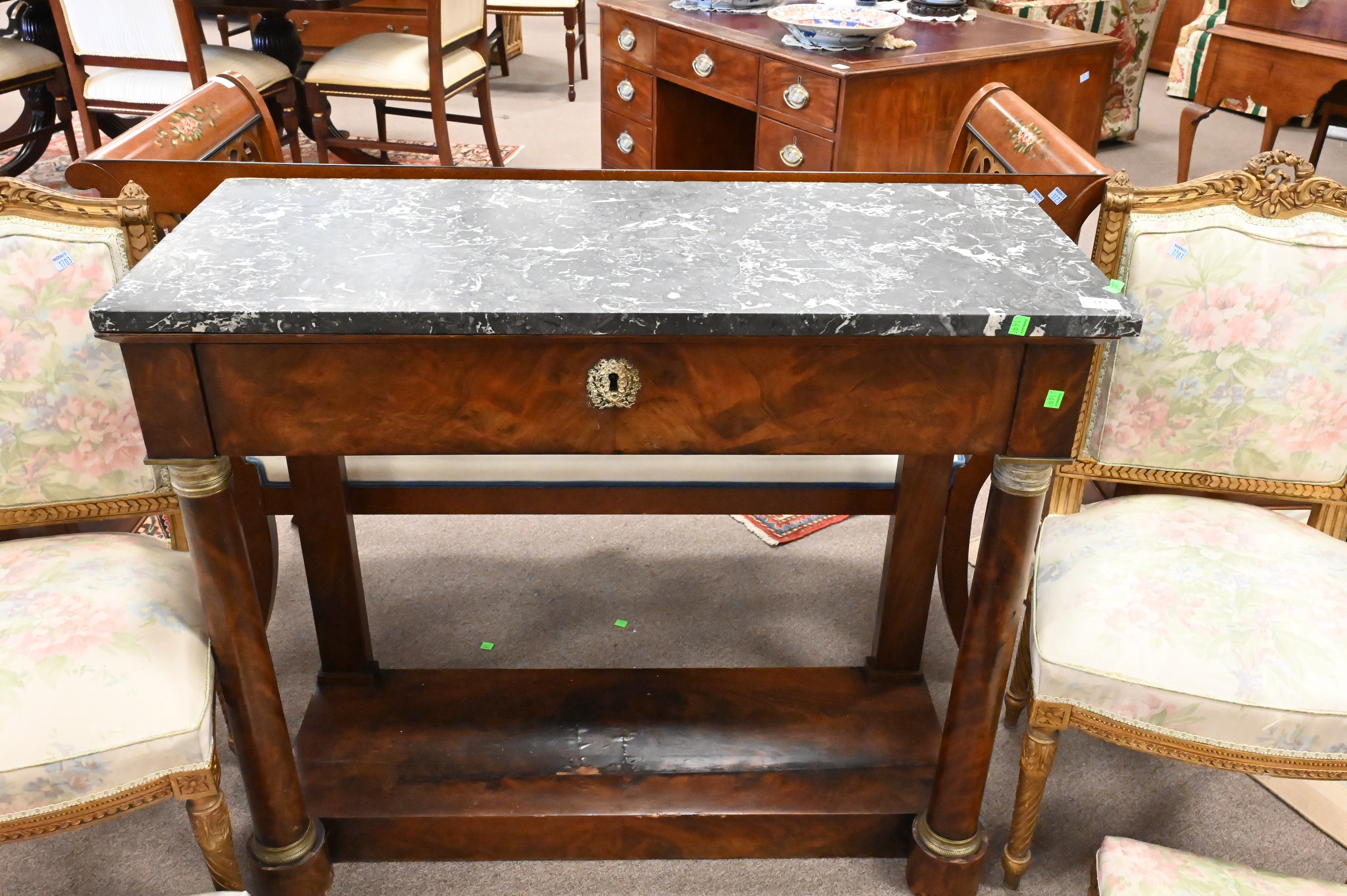 Empire Style Marble Top Pier Table, having one drawer set on column front legs having brass mounts, height 35 inches, top 16 1/2″ x 40″